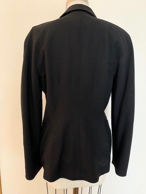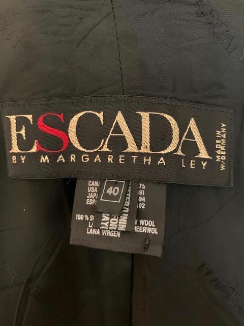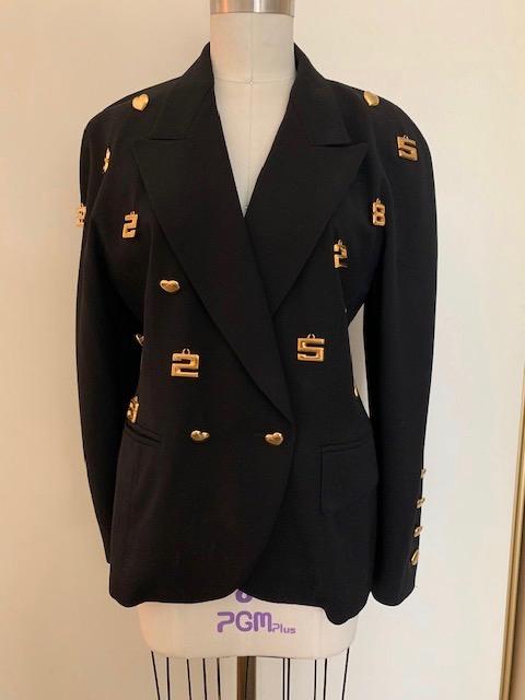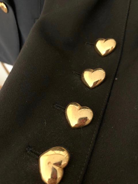 Gold letters & numbers dangle off this long sleeve wool jacket designed by Margaretha Ley for Escada. Rows of heart buttons on sleeves. Size 40