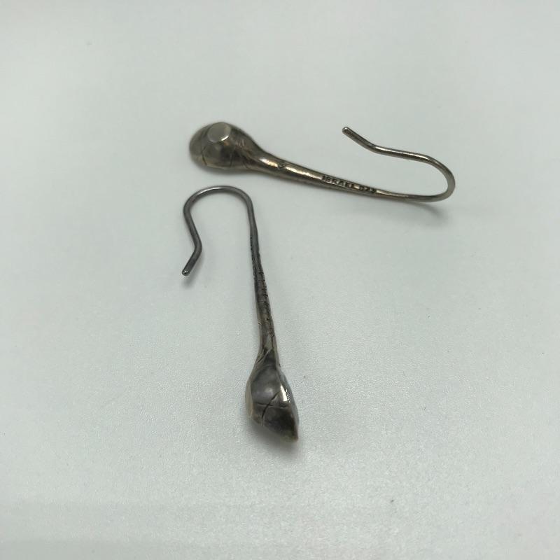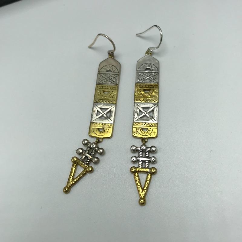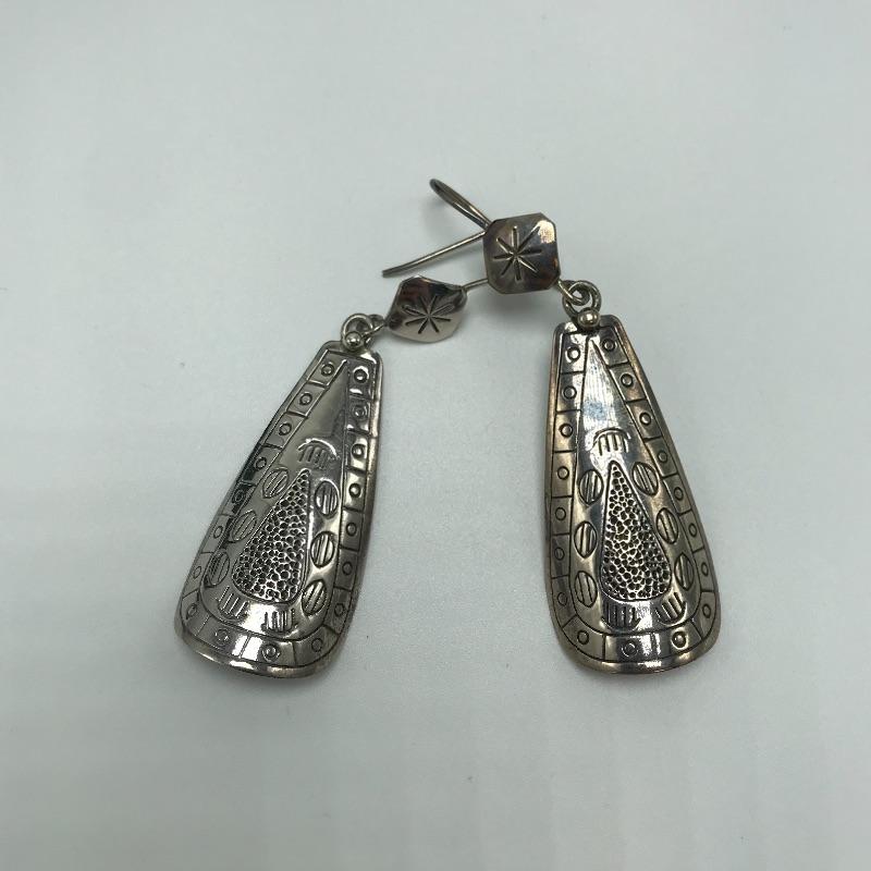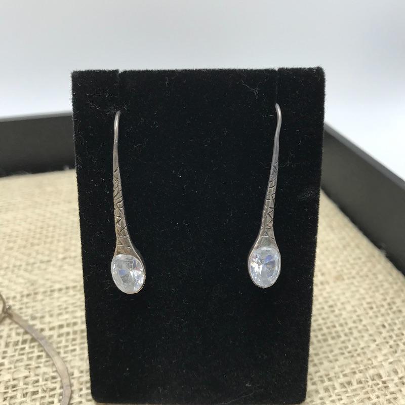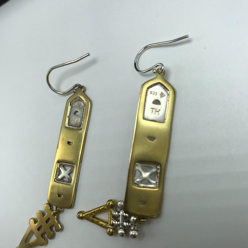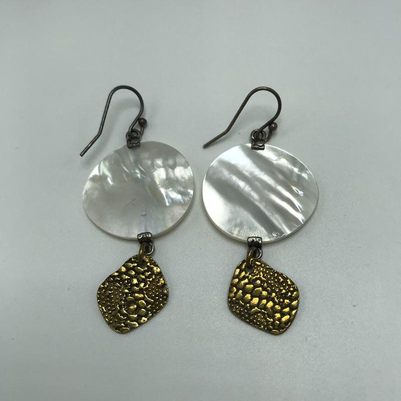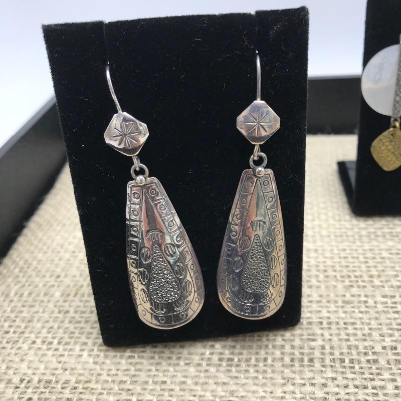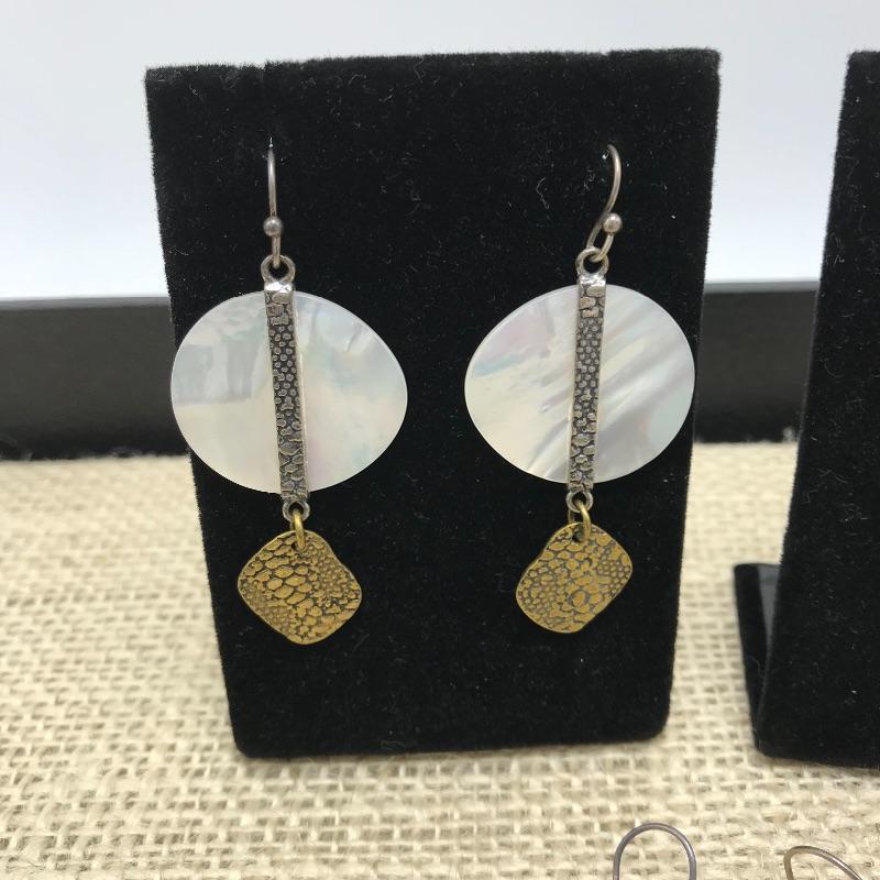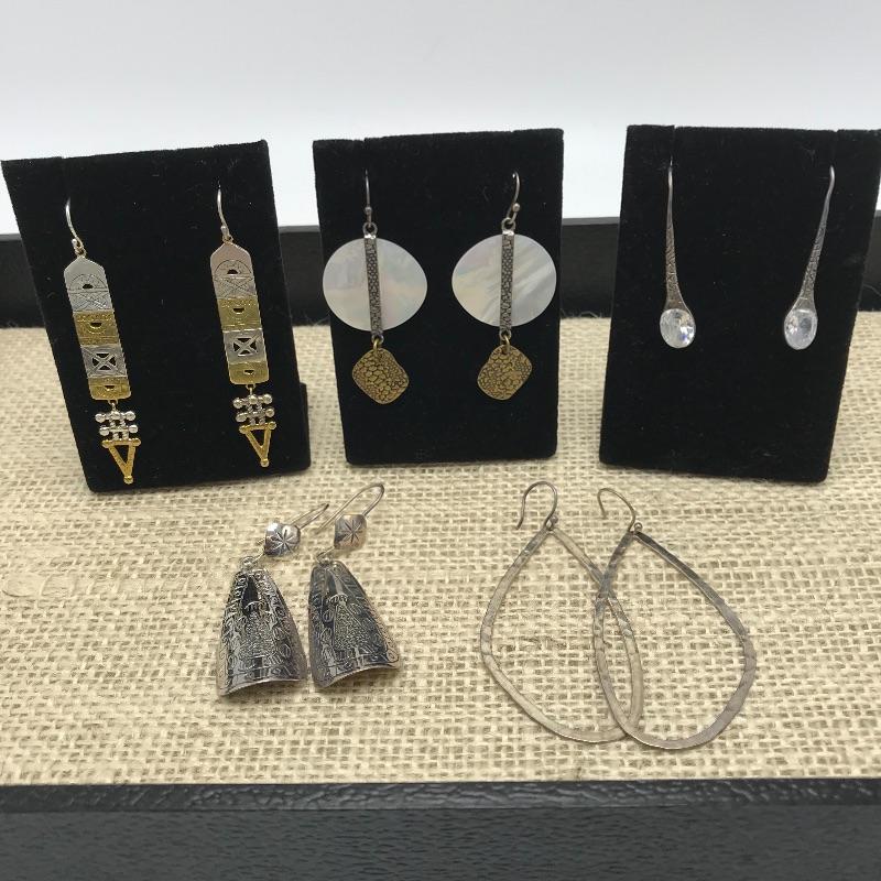 You need these five pairs of earrings to add to your collection! First pictured is named Aztec With French style drops, sterling and brass. Next we are offering a statement of sterling with an etched teardrop shape. Third, a mobile of shell, brass and sterling. We’ve completed this collection with dramatic cubic zirconia and sterling spoon like earrings and a large off-shaped sterling dangle. See photos.