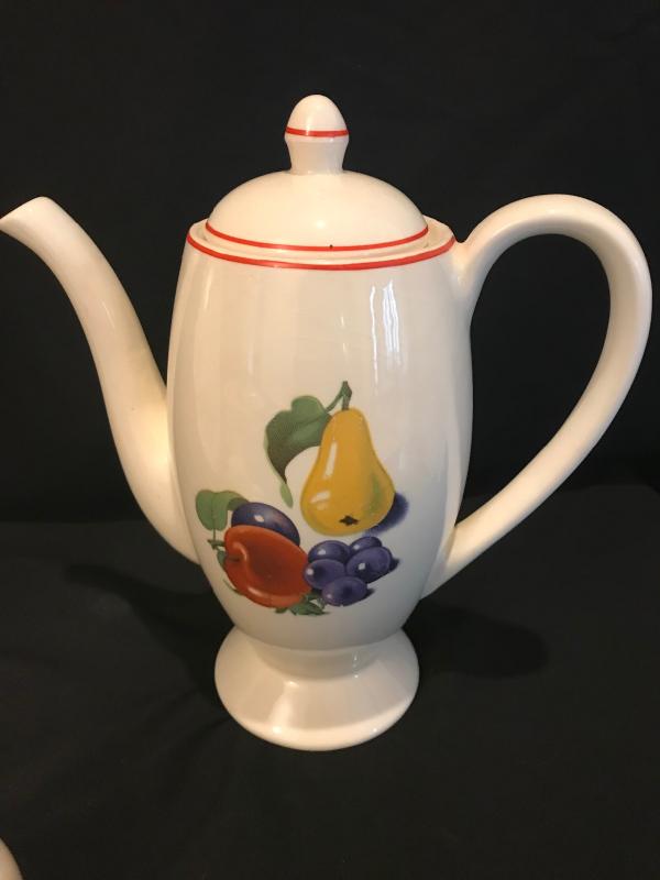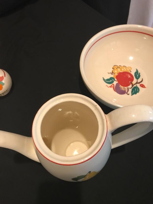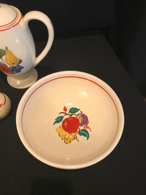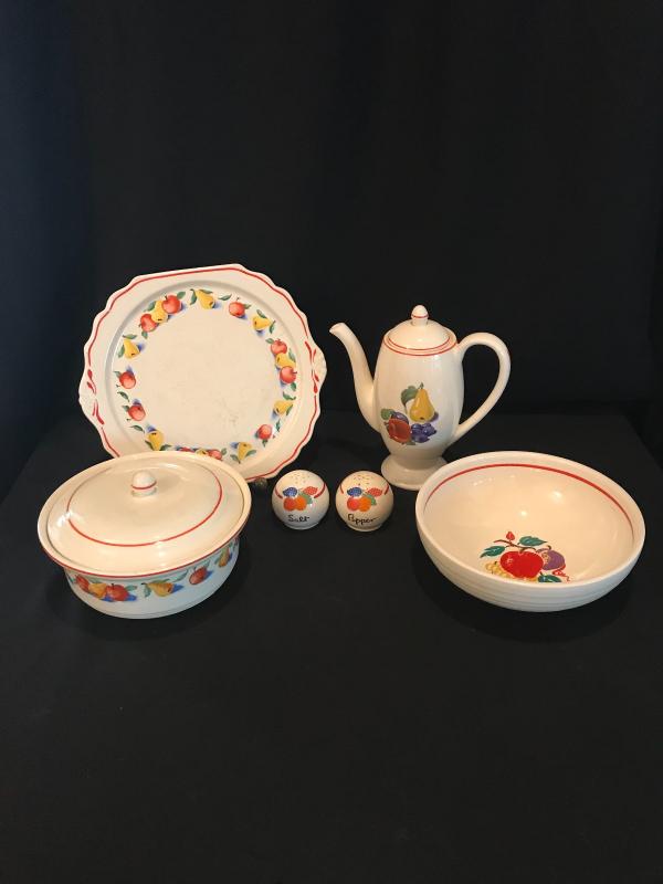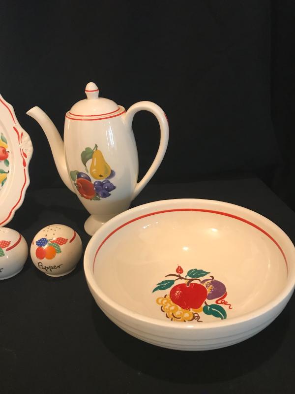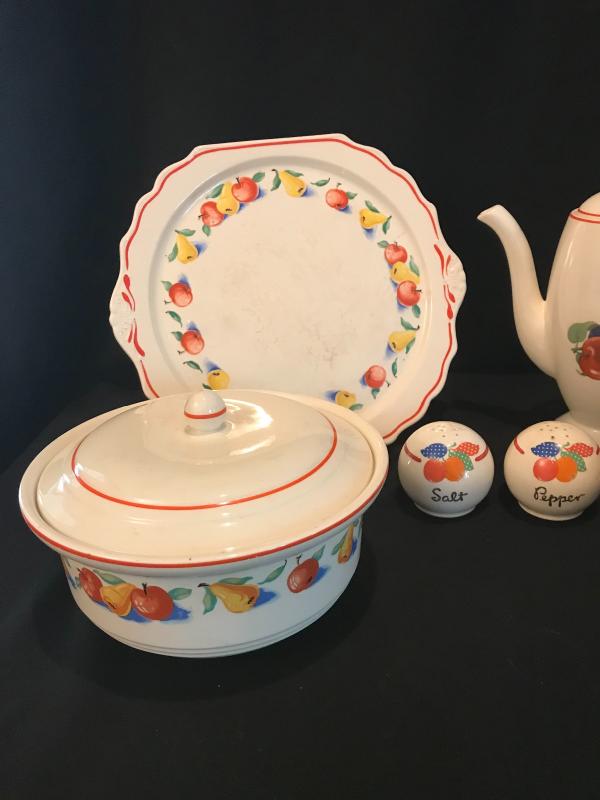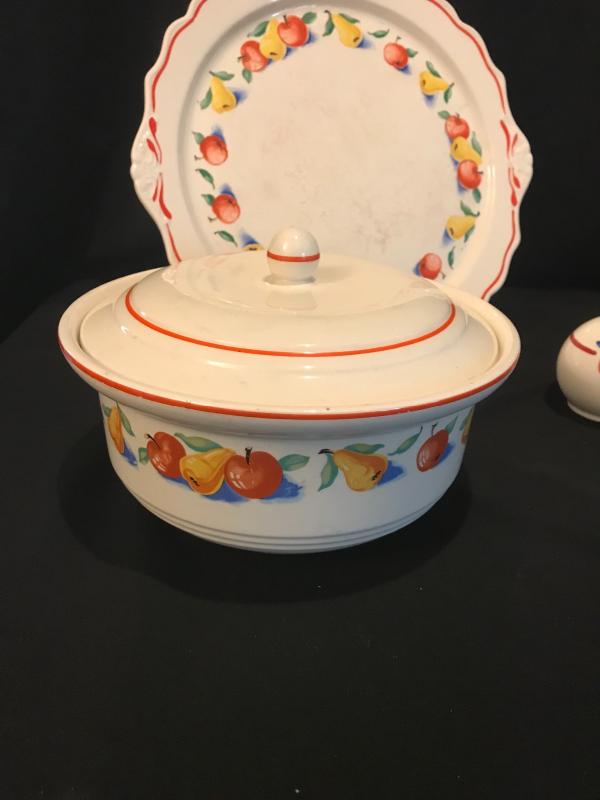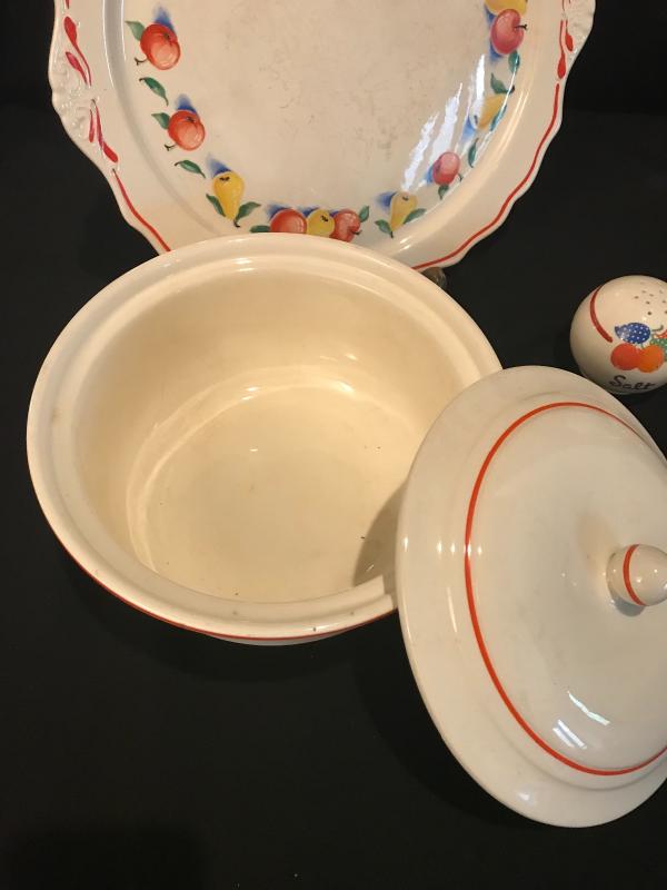 Cream colored with red edging dishes by Bake Oven, Harley’s Hot Oven and others. This is not a set but pieces do compliment each other. Lot is available for shipping or local pick up in Asheville, NC.