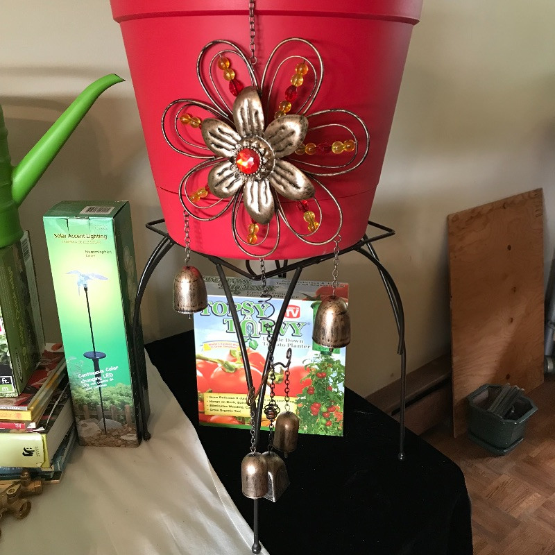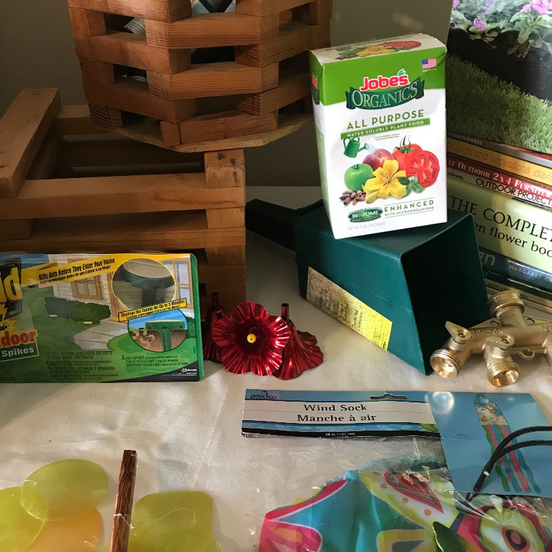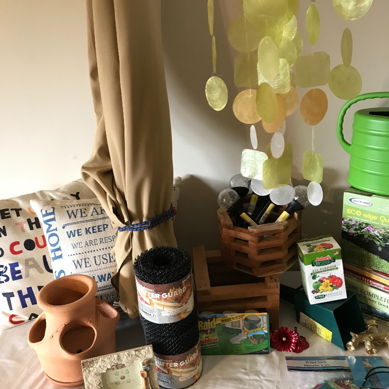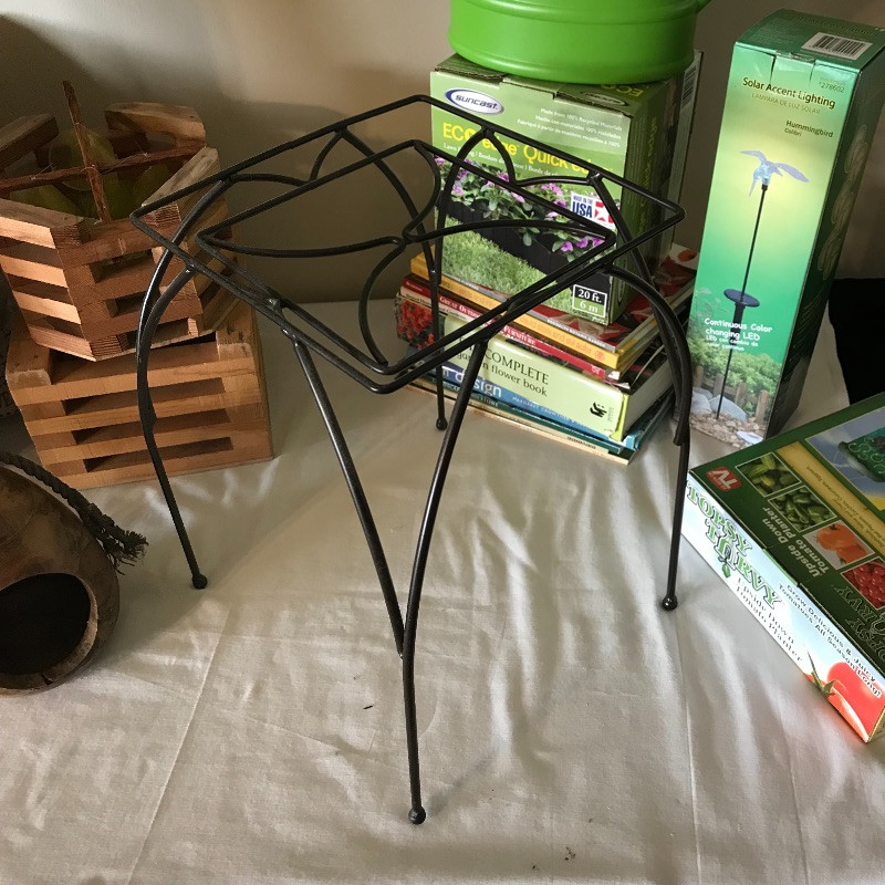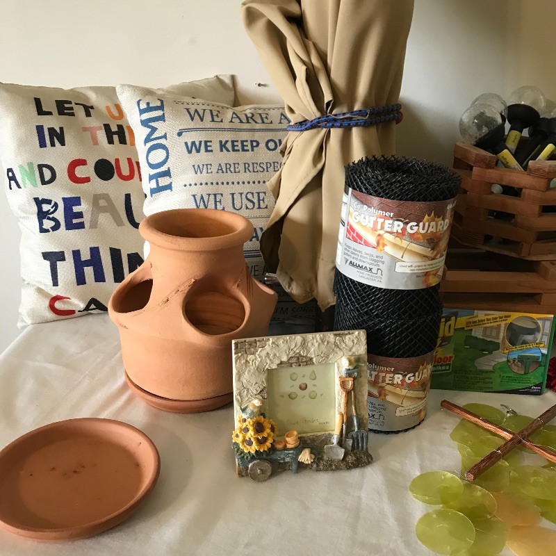 This lot includes some wonderful additions for your outside space and useful accoutrements for gardeners. Included is a bird feeder, two wind chimes, plant stand, two wooden pot holders, 6 solar lights that have not been used, gardening books, garden edging, gutter guard, two new pillows and so much more. The umbrella is in good condition and is a wind out one but the base is missing. See images. Local pick up only.