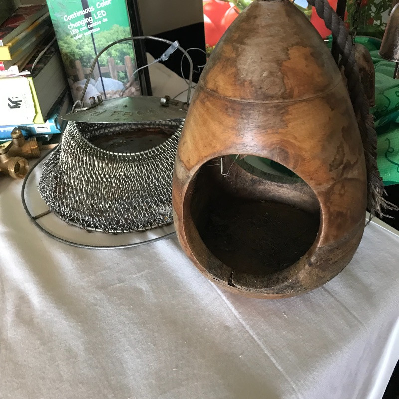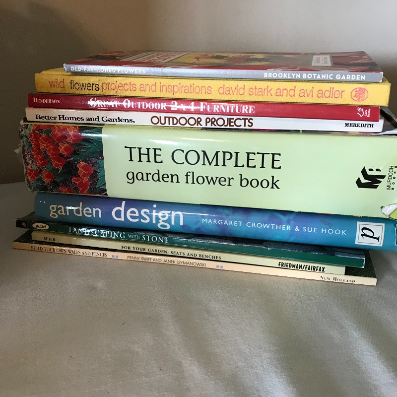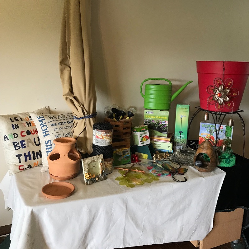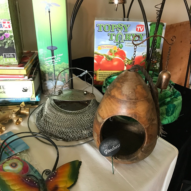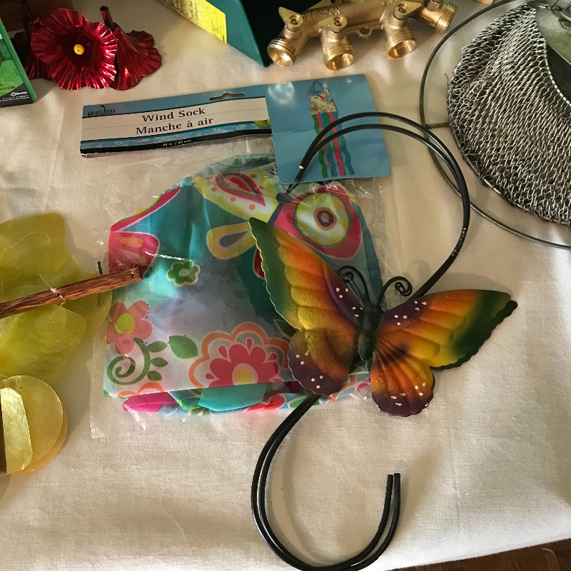 This lot includes some wonderful additions for your outside space and useful accoutrements for gardeners. Included is a bird feeder, two wind chimes, plant stand, two wooden pot holders, 6 solar lights that have not been used, gardening books, garden edging, gutter guard, two new pillows and so much more. The umbrella is in good condition and is a wind out one but the base is missing. See images. Local pick up only.