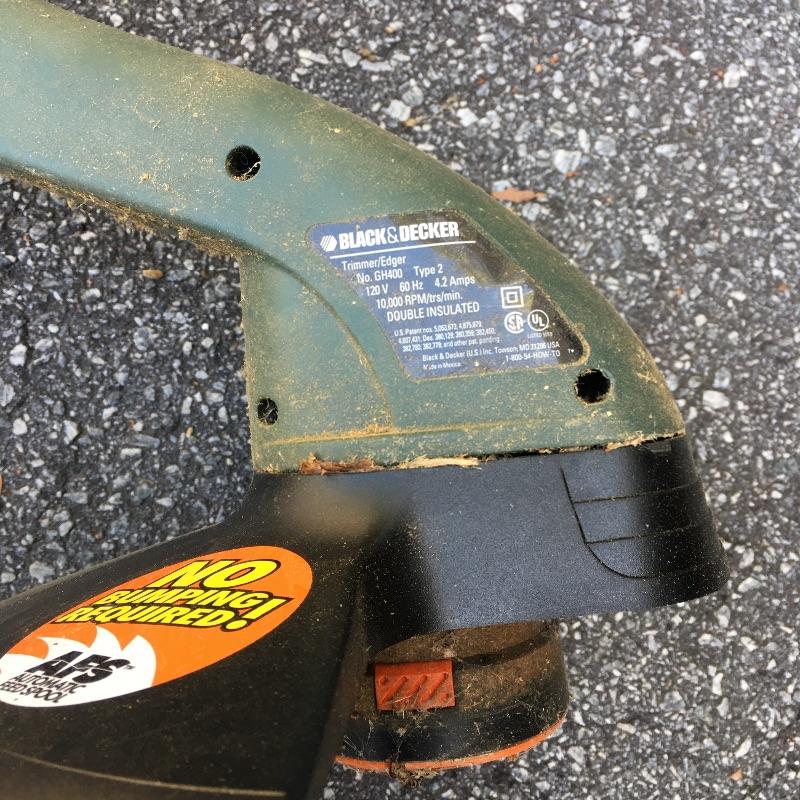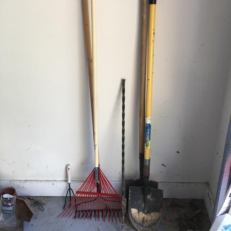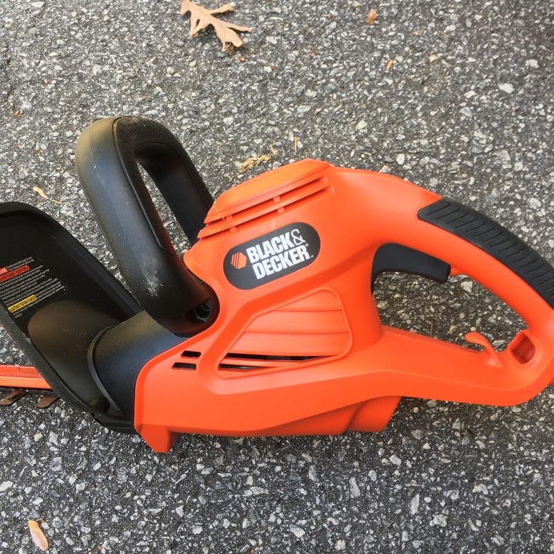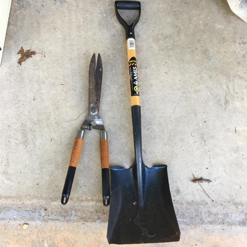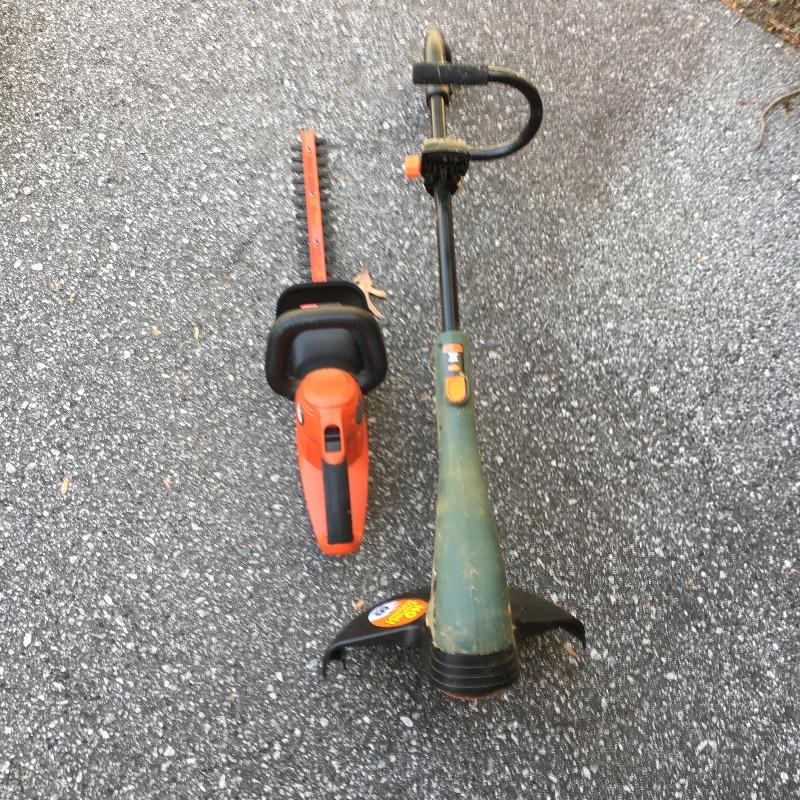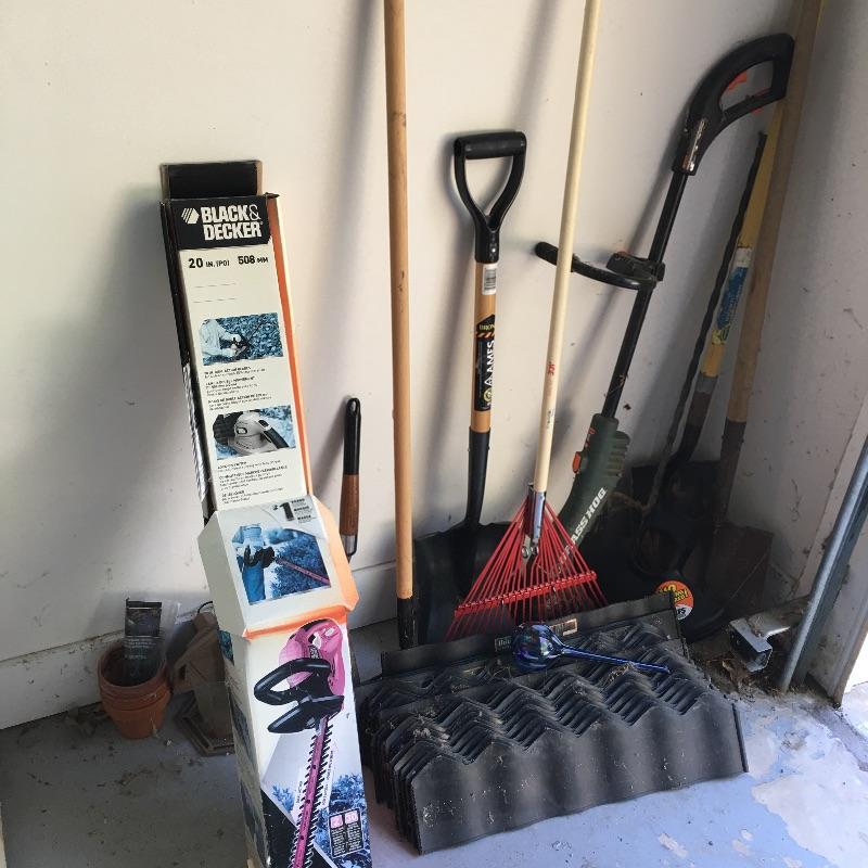 Yard tools. Lot includes Black and Decker weed eater and 20” hedge trimmer model# GH-400, square shovel, two shovels, hand hedge trimmer, heavy and light rake, lawn edging, bird feeder and more. A good start to a tidy yard. Weed eater and hedge trimmer both worked when tested.