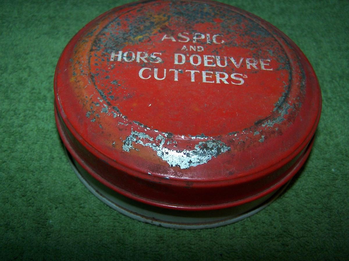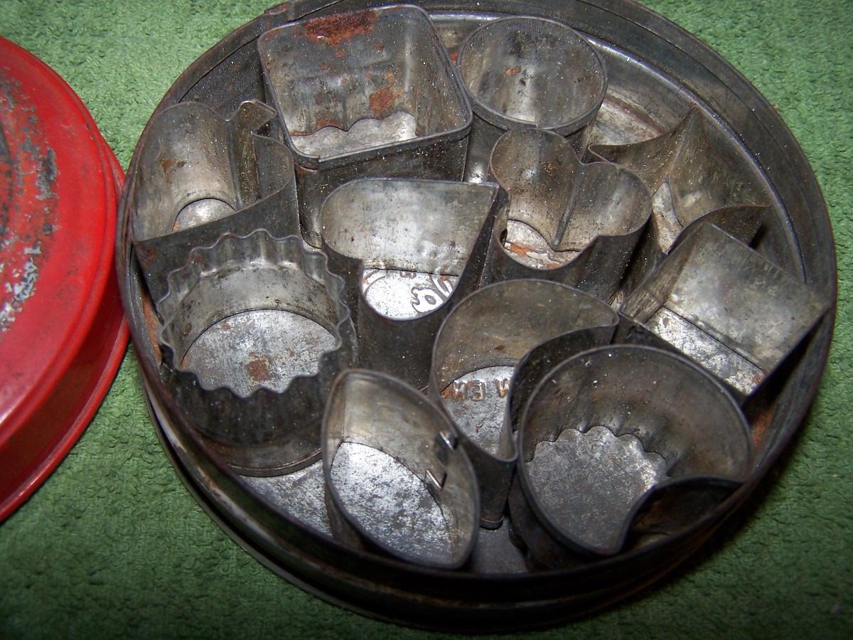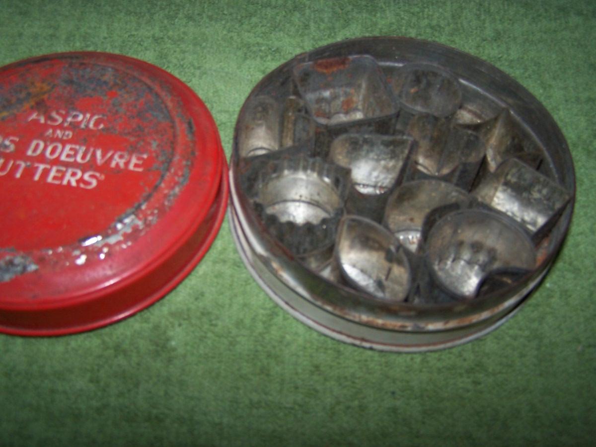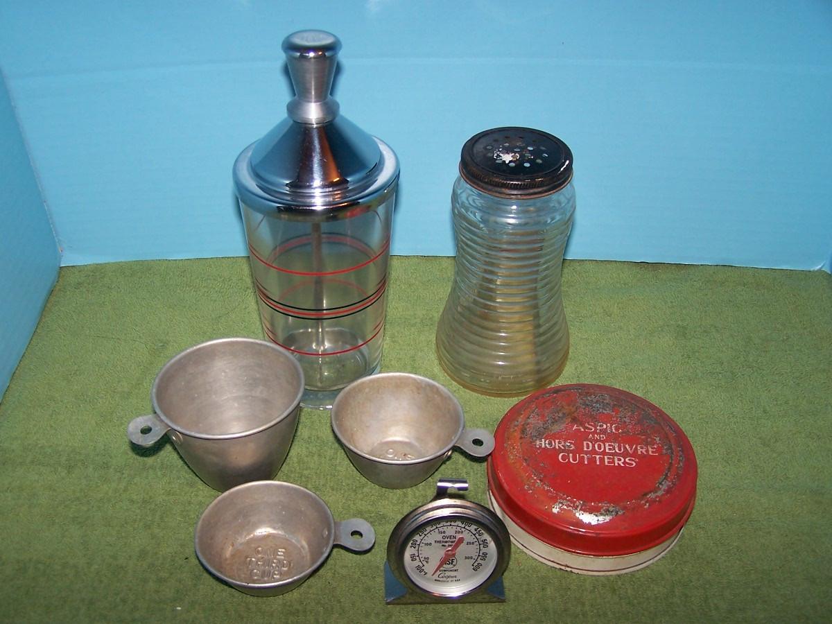 THIS IS GREAT OLD KITCHEN STUFF!!! THE SMALL CUTTERS/BOX HAS WEAR, SOME RUST... THE CHOPPER IS 9'' TALL... LIGHT WEAR...