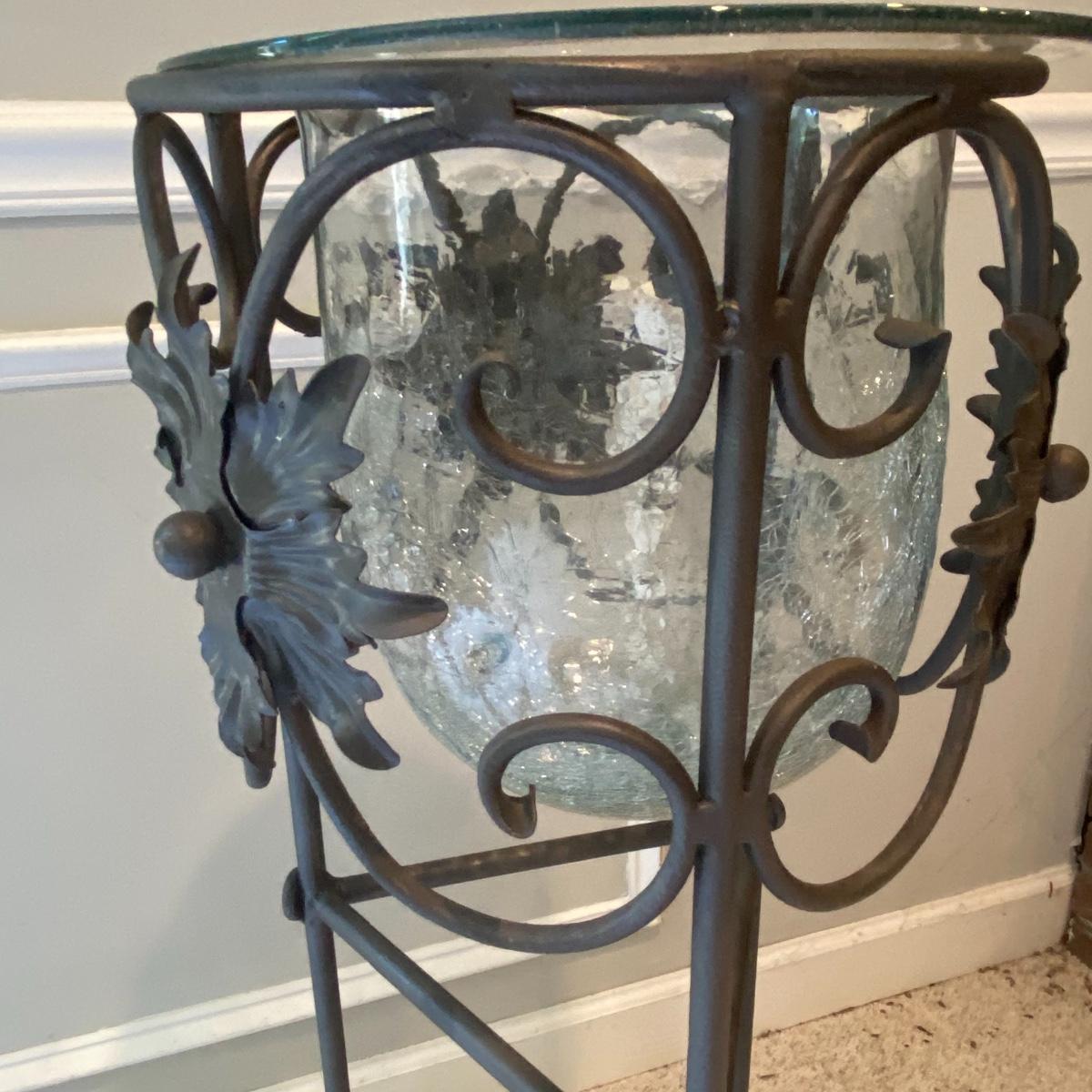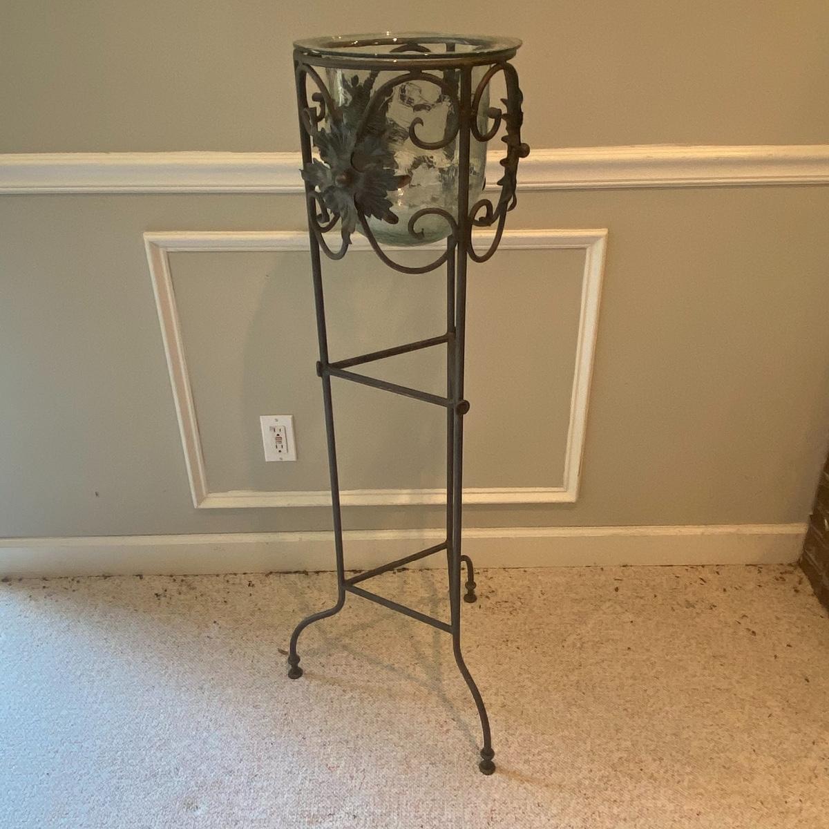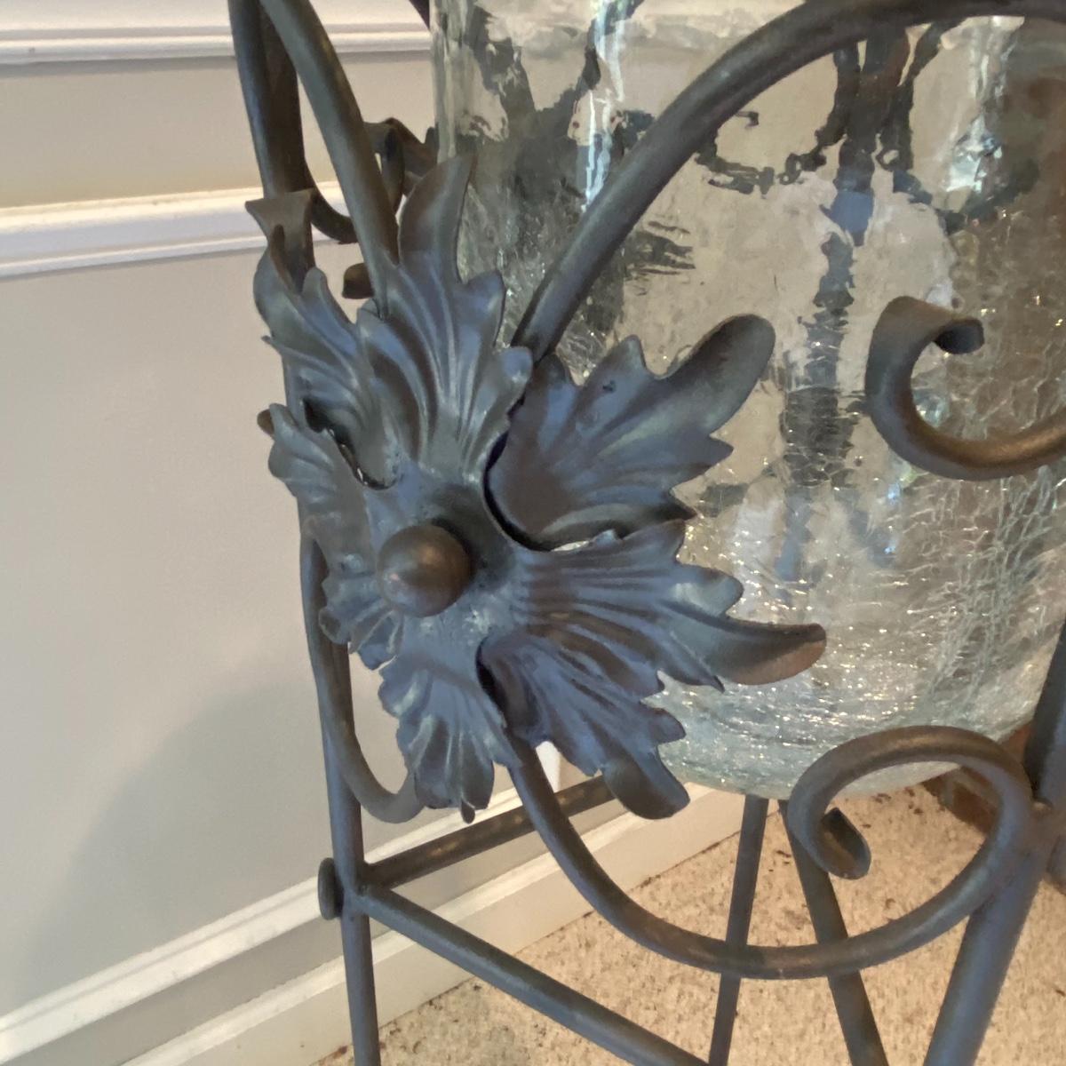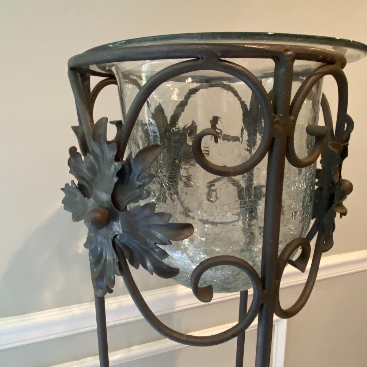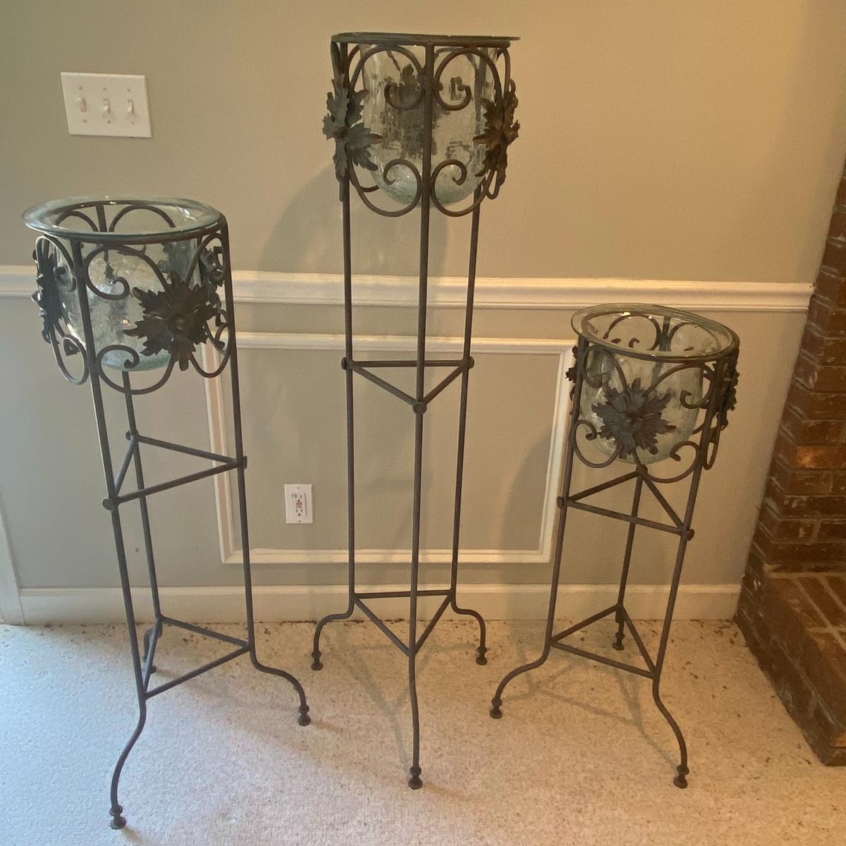 Lot includes three hurricane stands perfect for interior or exterior decor. Tallest stand measures 56” tall and all three glass bulb inserts have a diameter of 10”. Stands are iron with glass insert on top.