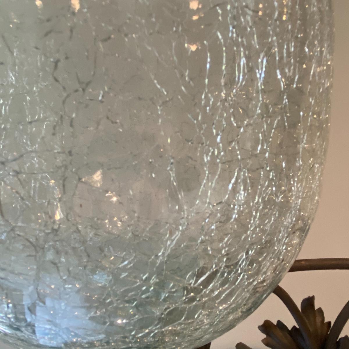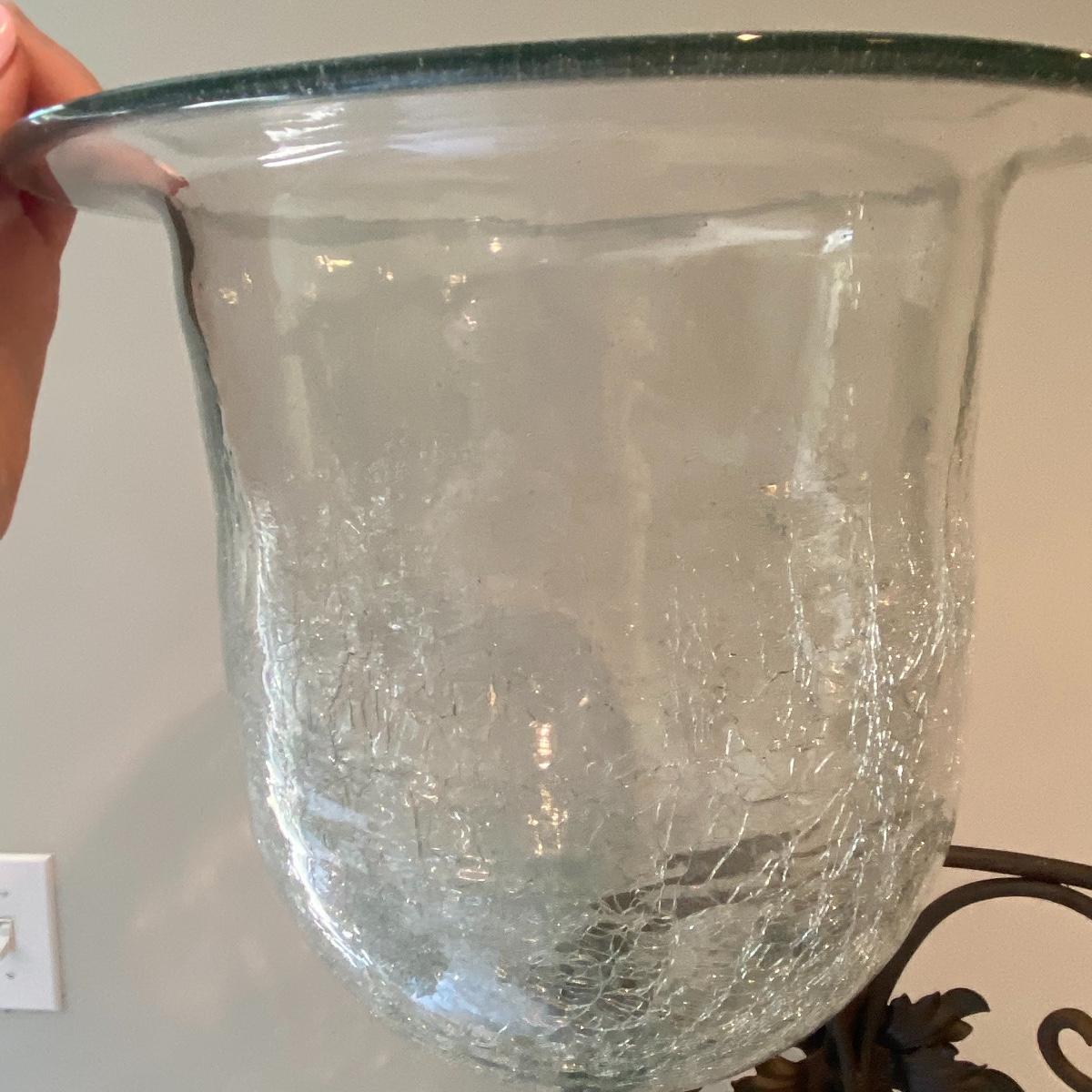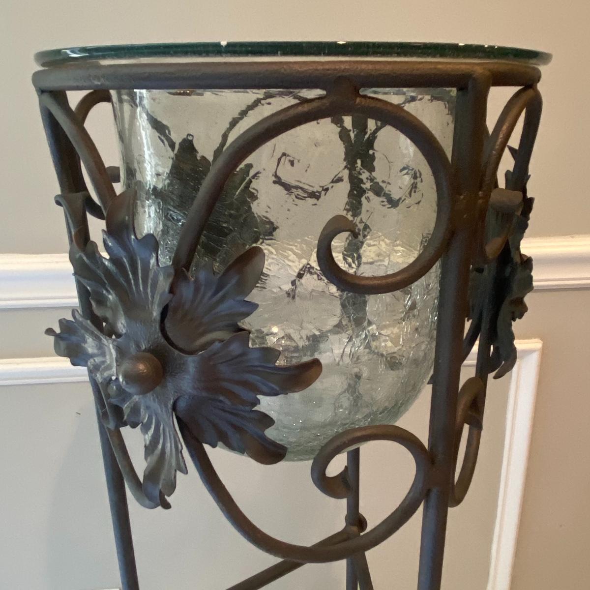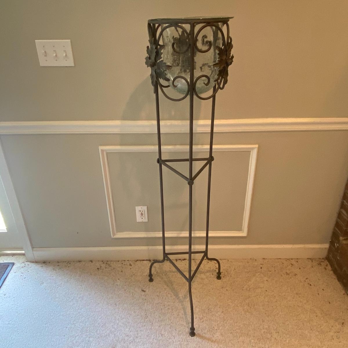 Lot includes three hurricane stands perfect for interior or exterior decor. Tallest stand measures 56” tall and all three glass bulb inserts have a diameter of 10”. Stands are iron with glass insert on top.