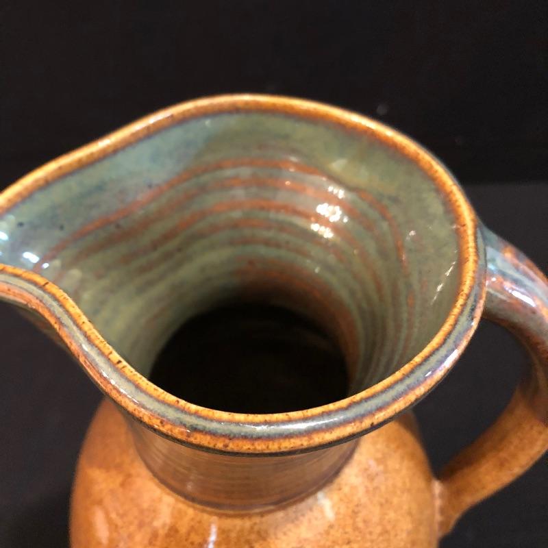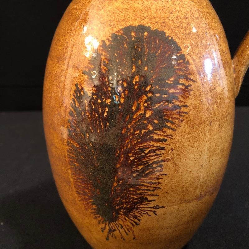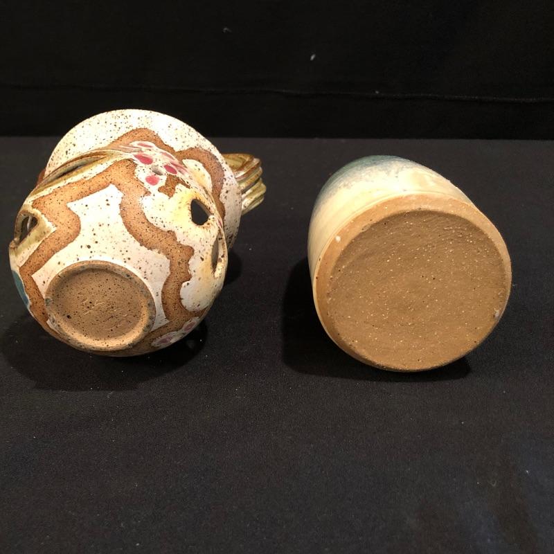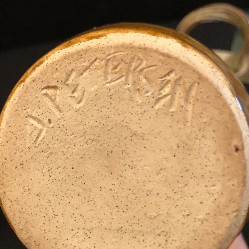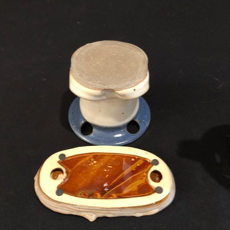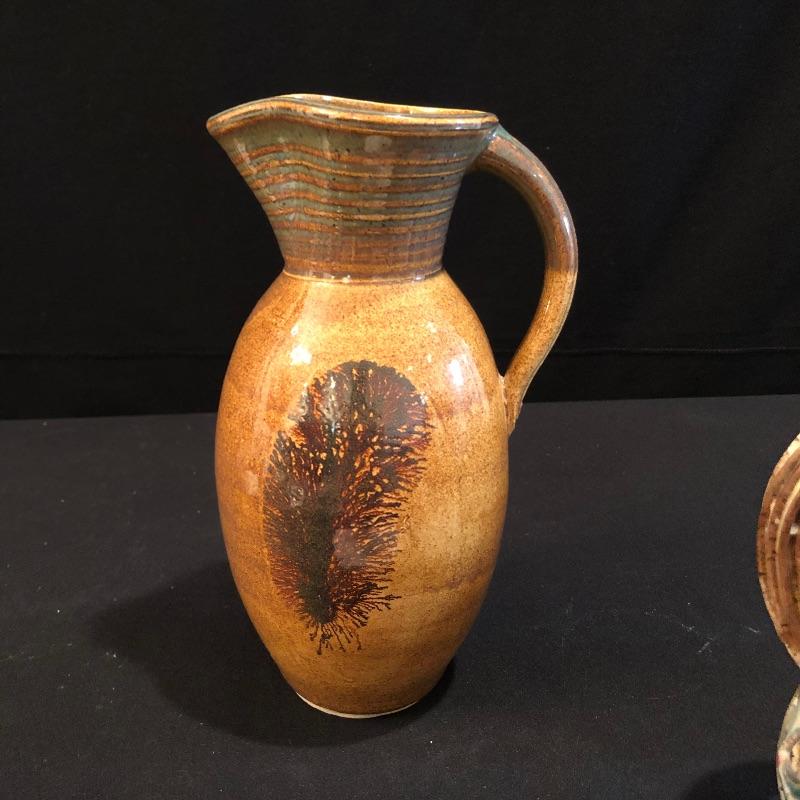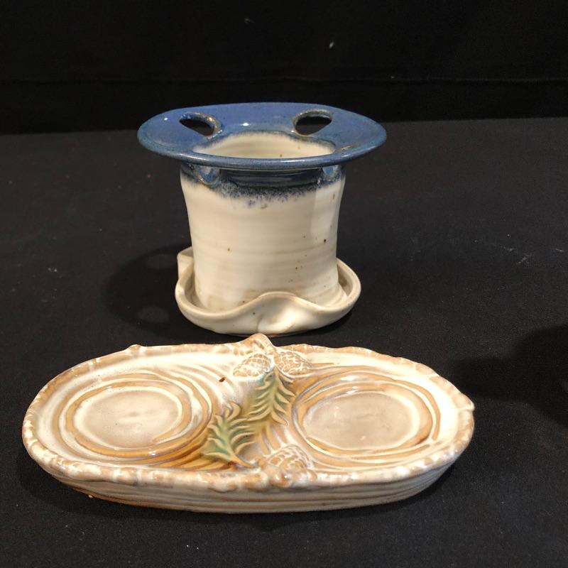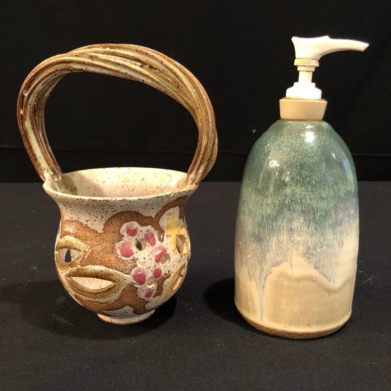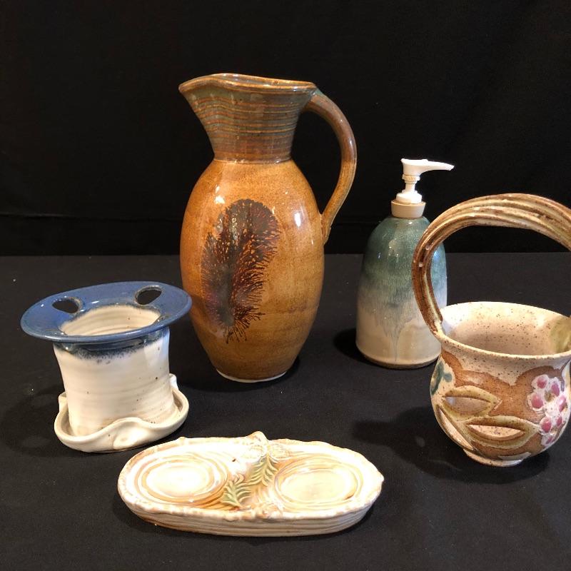 The largest piece in this assortment of pottery is the brown jug with a feather design on the front, It’s signed by J. Peterson. All the other pieces in this lot are also handmade pottery that includes a toothbrush holder, soap dispenser, small dish and handled basket.