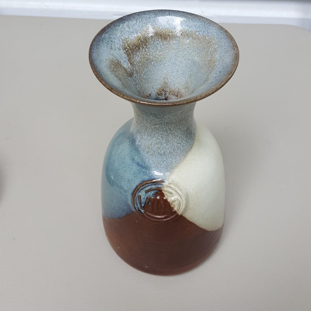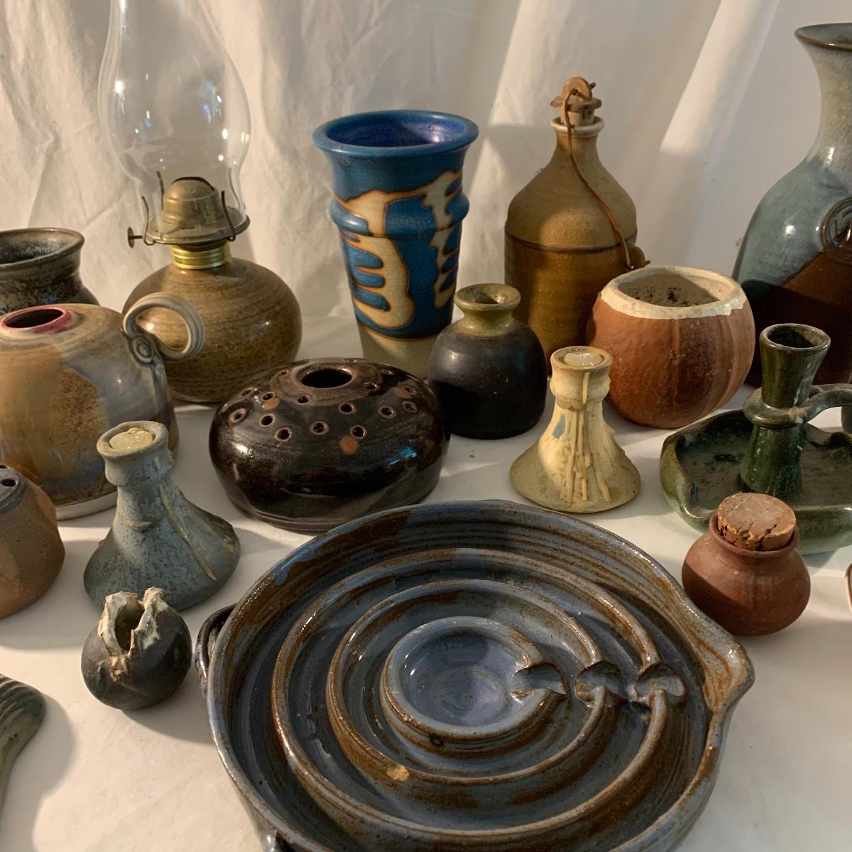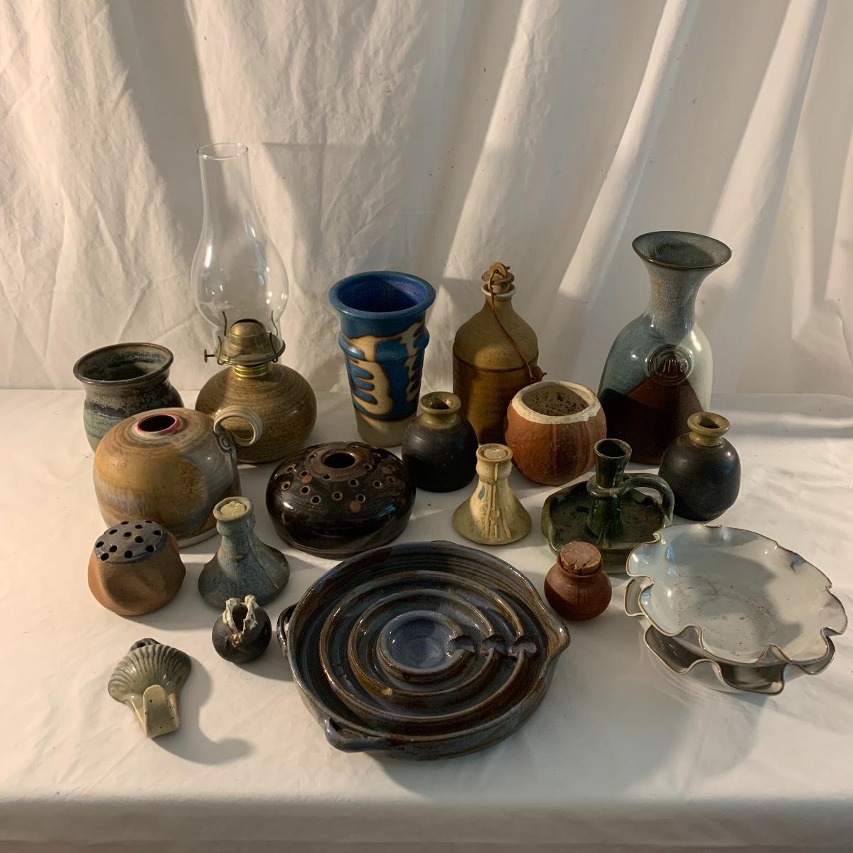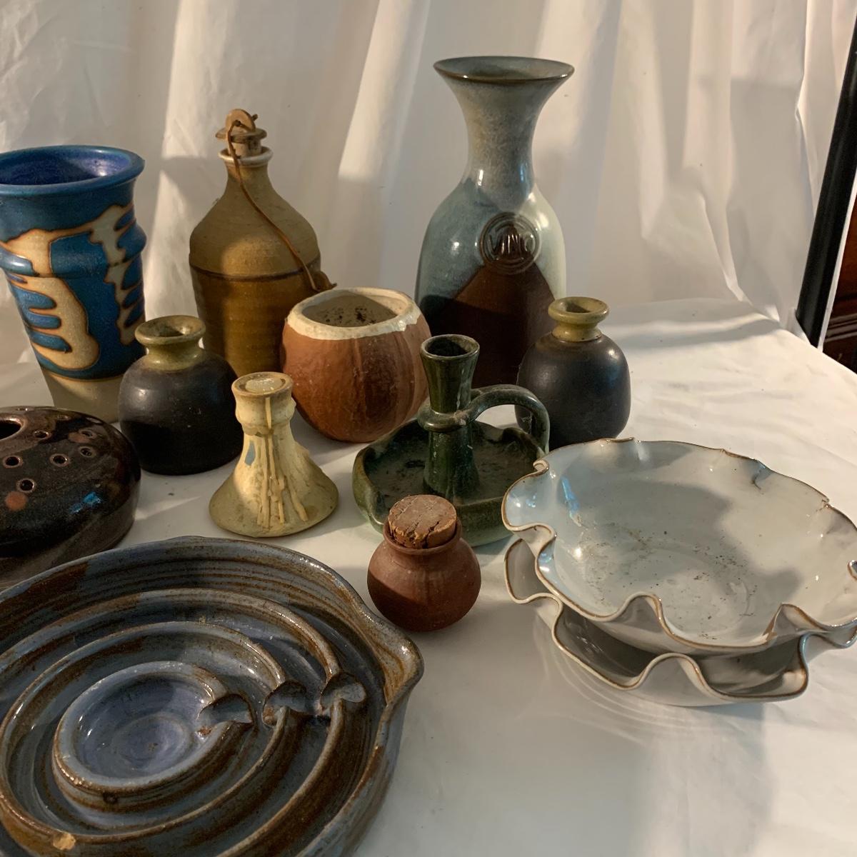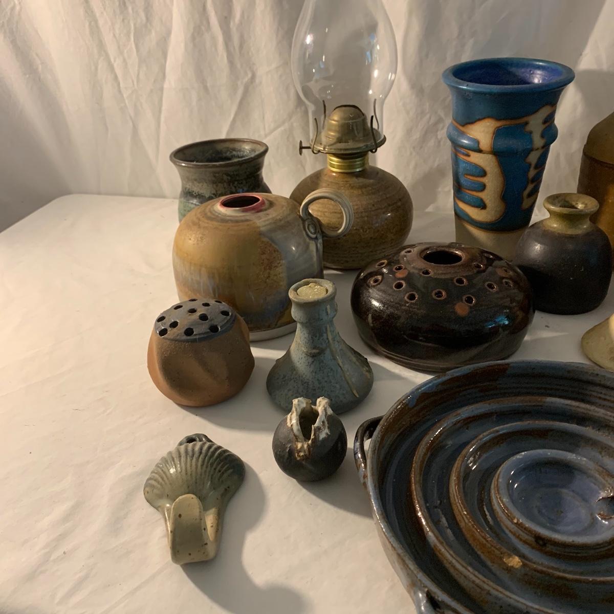 Check out this pottery lot! Several great pottery pieces here. Numerous vases (the tallest is 10” high), candle holders, a hurricane lantern (6"x14"), a lidded bottle (8"x5"), a shell wall hanging (3"x5") and more. All the pictures show the bottom of the pottery and whether they are signed by the artist or not. All items are in good condition except a chip or two (see pics).