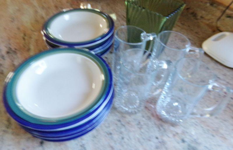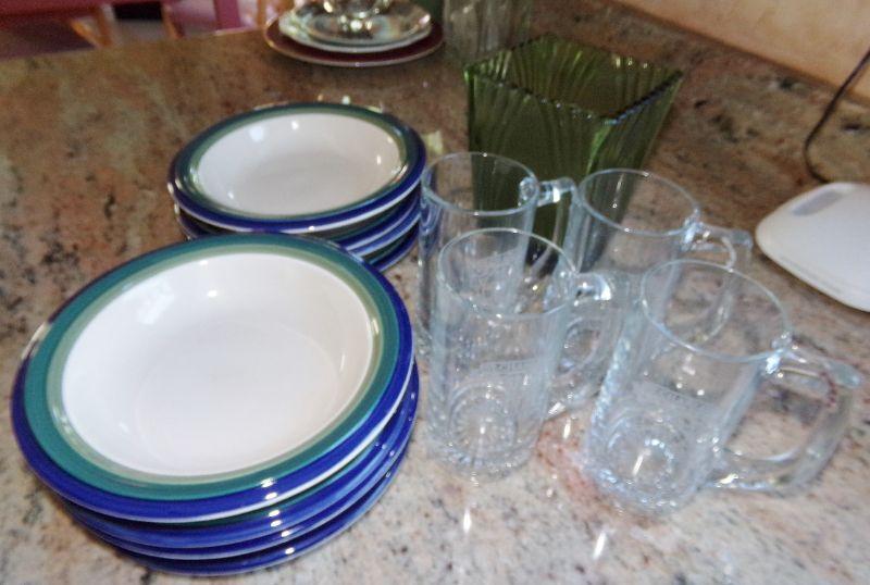 BOWLS, 4 GLASS MUGS, GREEN GLASS VASE