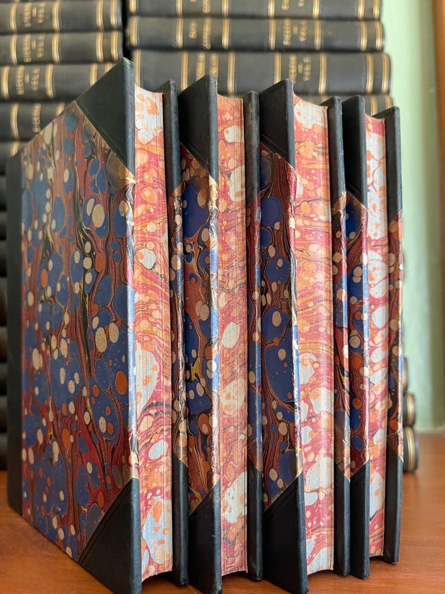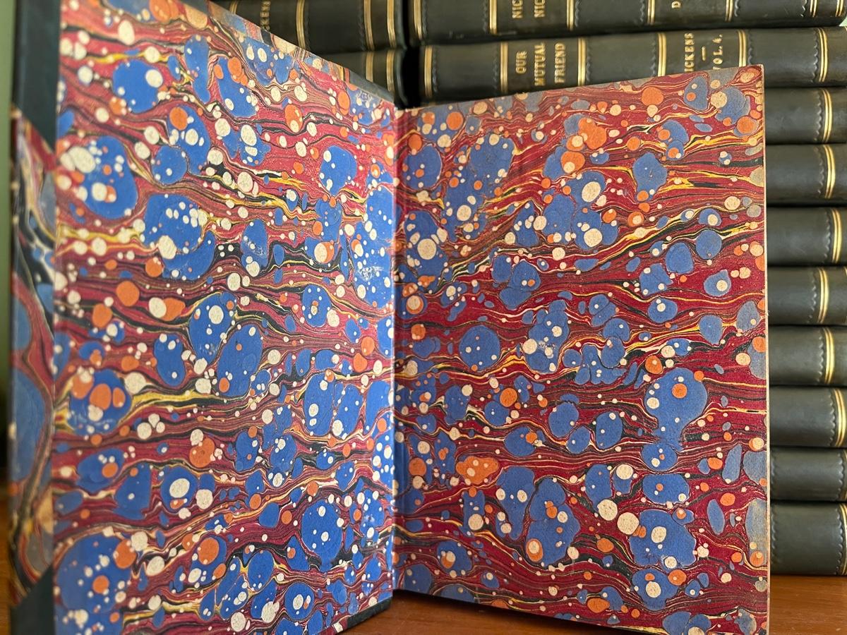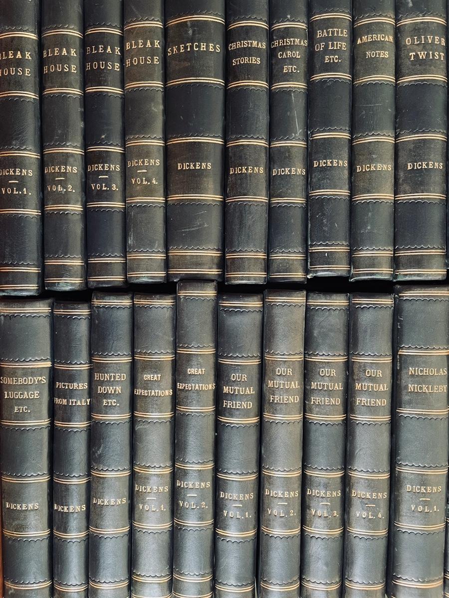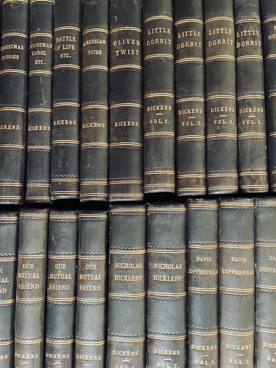 LOT 98 - Large Charles Dickens Book Set published by Leipzig in the 1800's. These are small books with beautifully marbled covers, end covers and page edges. Leather-bound spines with gold gilt lettering. This book set was part of the David-Pleydell-Bouverie library at Bouverie Ranch in Glen Ellen. This item can be viewed at our Green + Cate Showroom in Sebastopol from July 15th - July 18th between the hours of 9am-5pm. For the benefit of the Bouverie Preserve of Audubon Canyon Ranch.