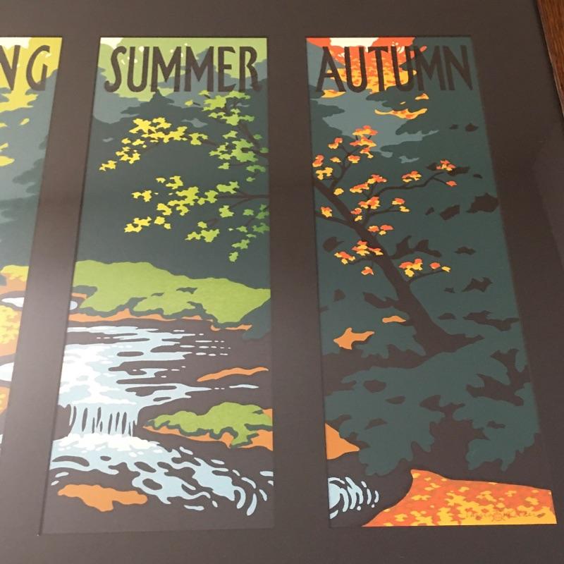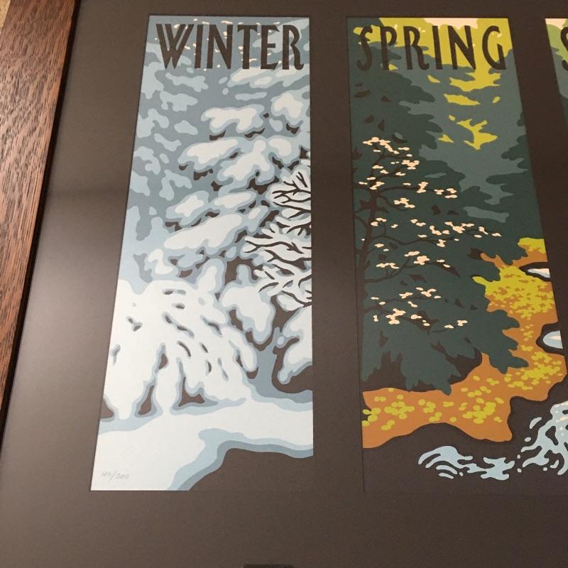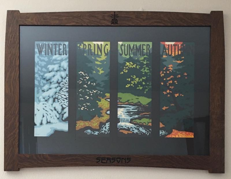 Arts & Crafts Framed artwork titled “Seasons” depicting all four seasons in a beautiful wooden frame. Print is by artist Laura Wilder on a letterpress by Roycroft Renaissance in a handmade frame. Frame measures 30.25” x 41.25”.