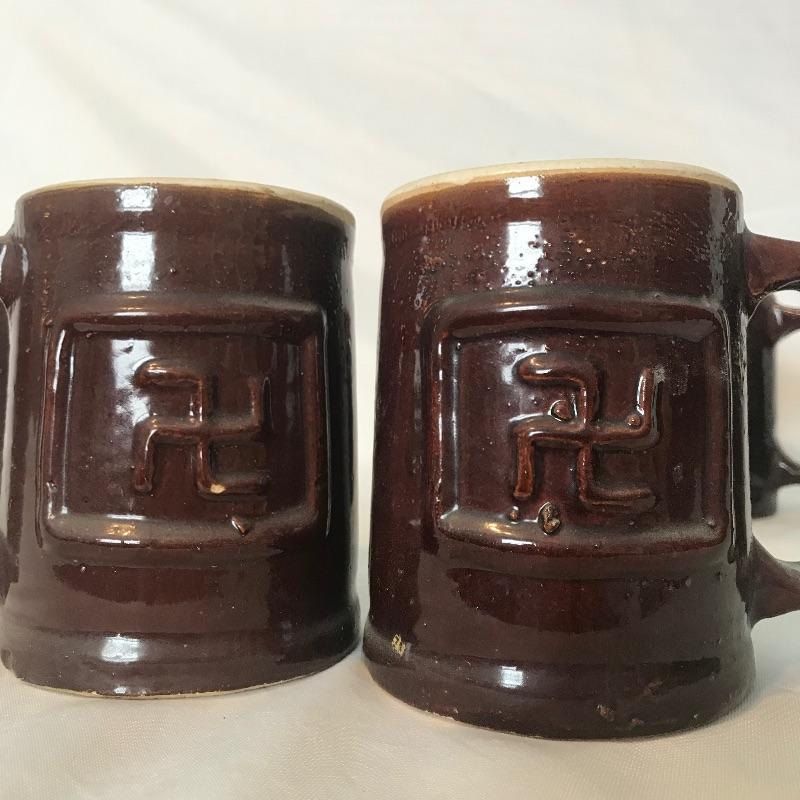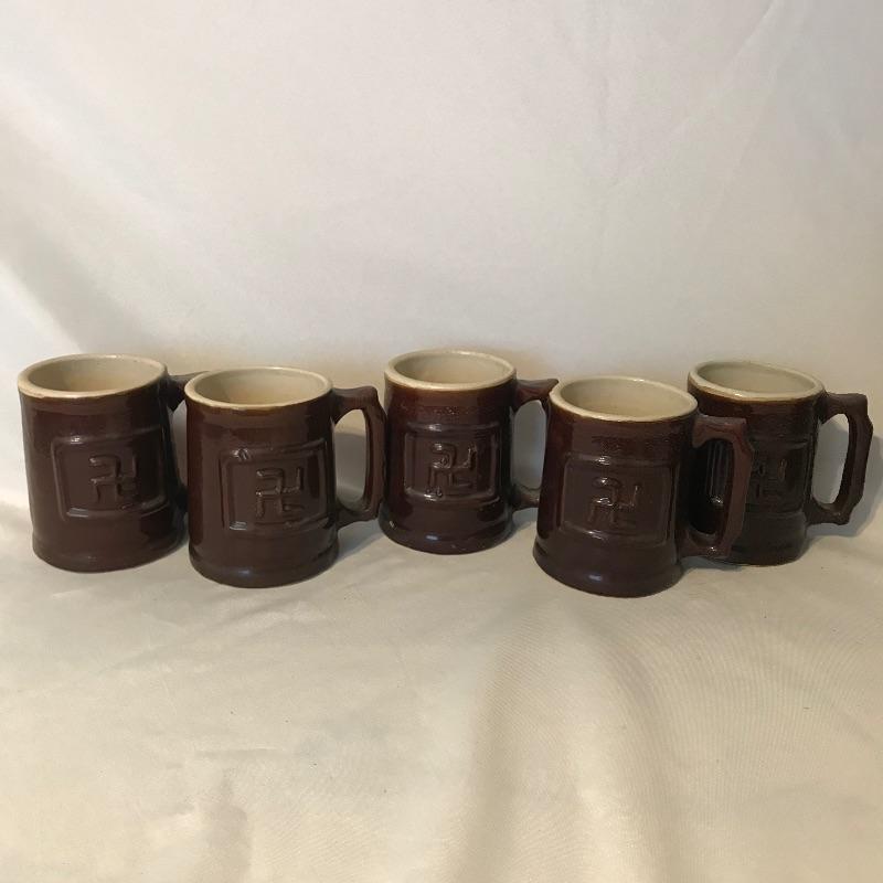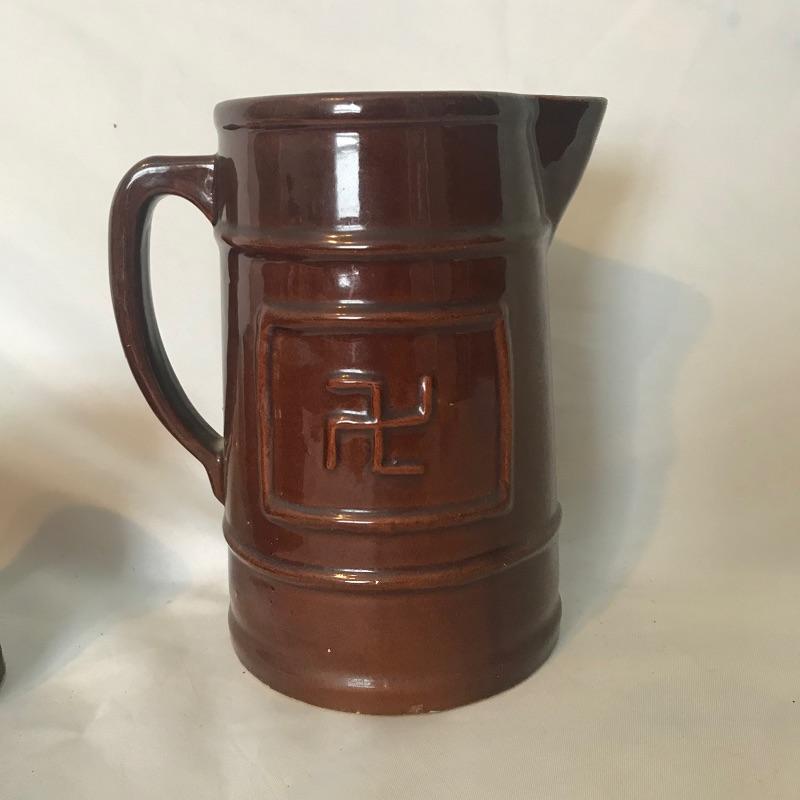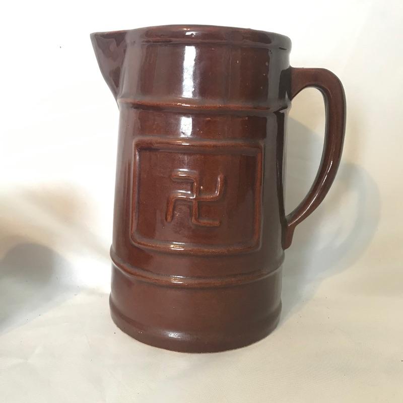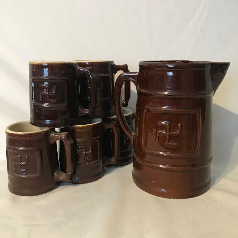 Lovely large stoneware pitcher with five mugs. Most notably Navajo, but possibly another southwestern Native American tribe, or even ancient India, these pieces have the ancient sacred symbol for life and prosperity on each side. Pieces have some imperfections that happened probably during the firing process that add to this set’s uniqueness. One mug has a tiny chip in its symbol, see photos. This set is in amazing condition given how old it may be. Disclaimer for any skeptics out there: the symbol here is counter-clockwise and not clockwise like the German swastika. Pitcher stands a little more than 5.75”d x 8.75”. Shipping available.
