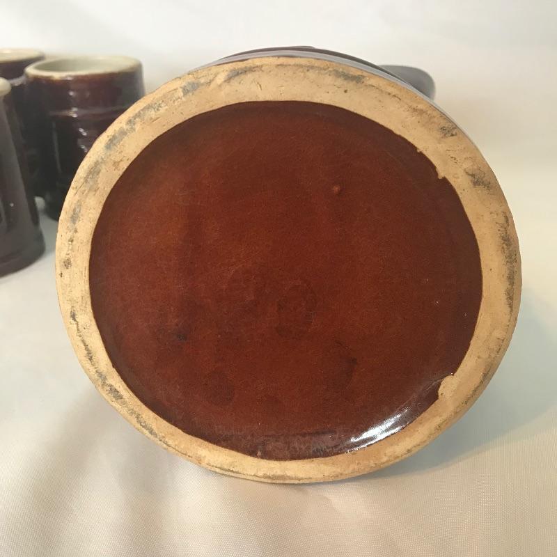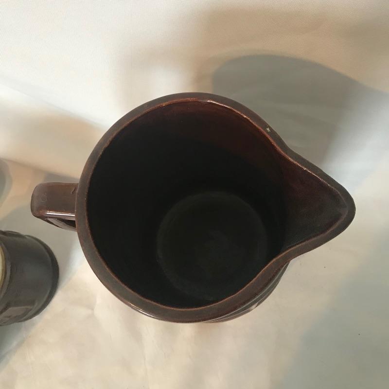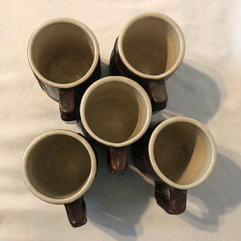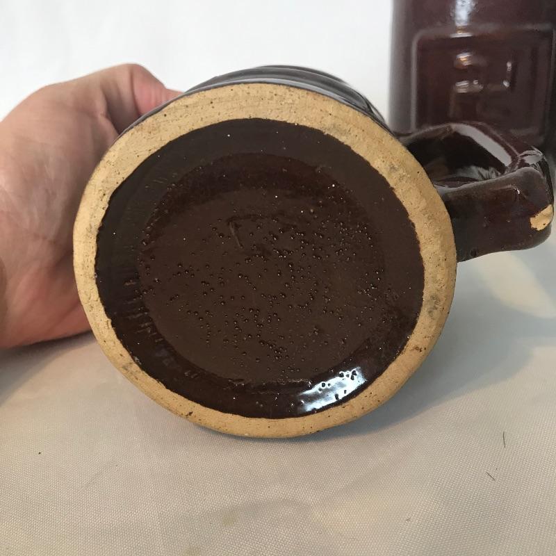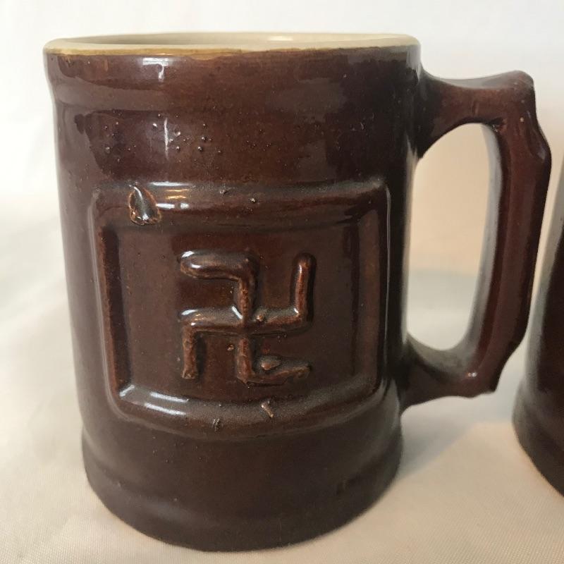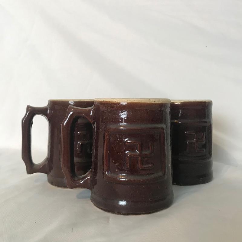 Lovely large stoneware pitcher with five mugs. Most notably Navajo, but possibly another southwestern Native American tribe, or even ancient India, these pieces have the ancient sacred symbol for life and prosperity on each side. Pieces have some imperfections that happened probably during the firing process that add to this set’s uniqueness. One mug has a tiny chip in its symbol, see photos. This set is in amazing condition given how old it may be. Disclaimer for any skeptics out there: the symbol here is counter-clockwise and not clockwise like the German swastika. Pitcher stands a little more than 5.75”d x 8.75”. Shipping available.