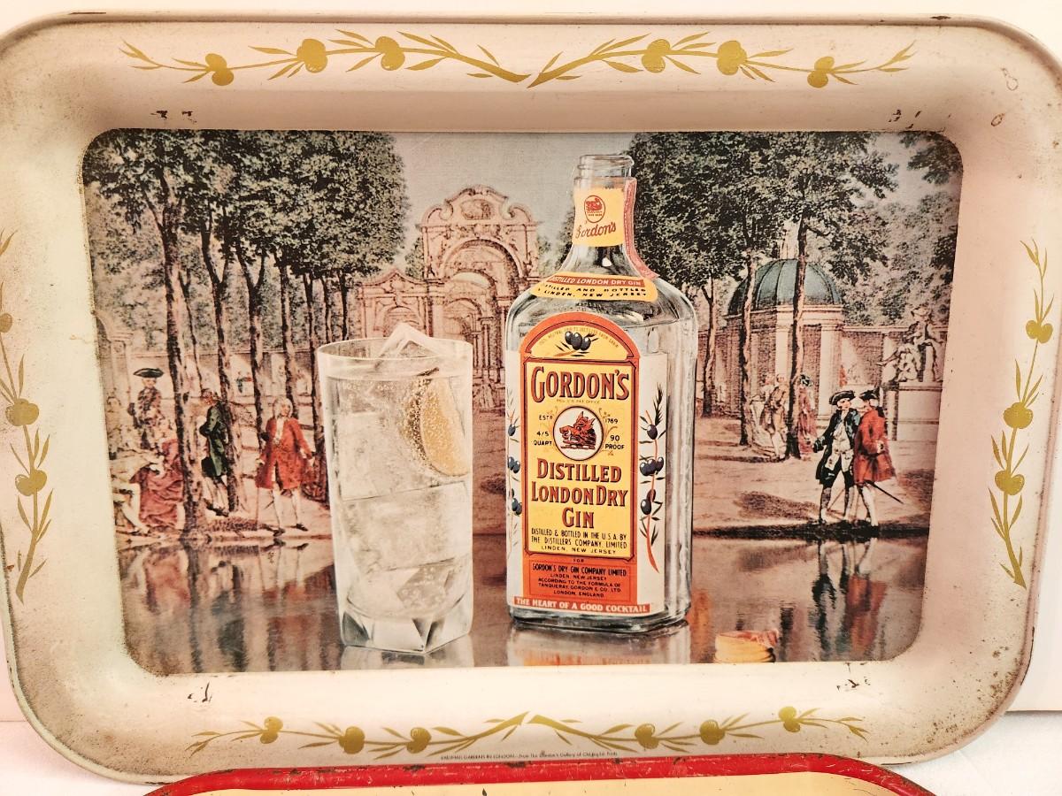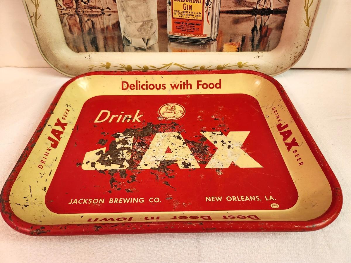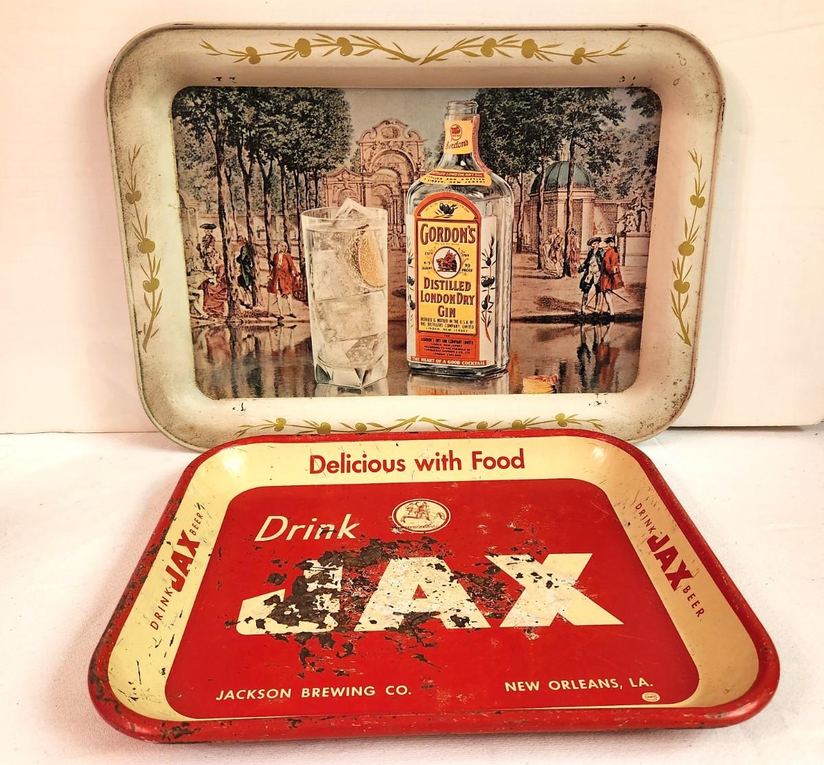 Lot of 2 vintage metal bar trays - JAX Beer (13" x 11") and Gordon's Gin (17.5" x 12"). Both in vintage, used condition. As found.