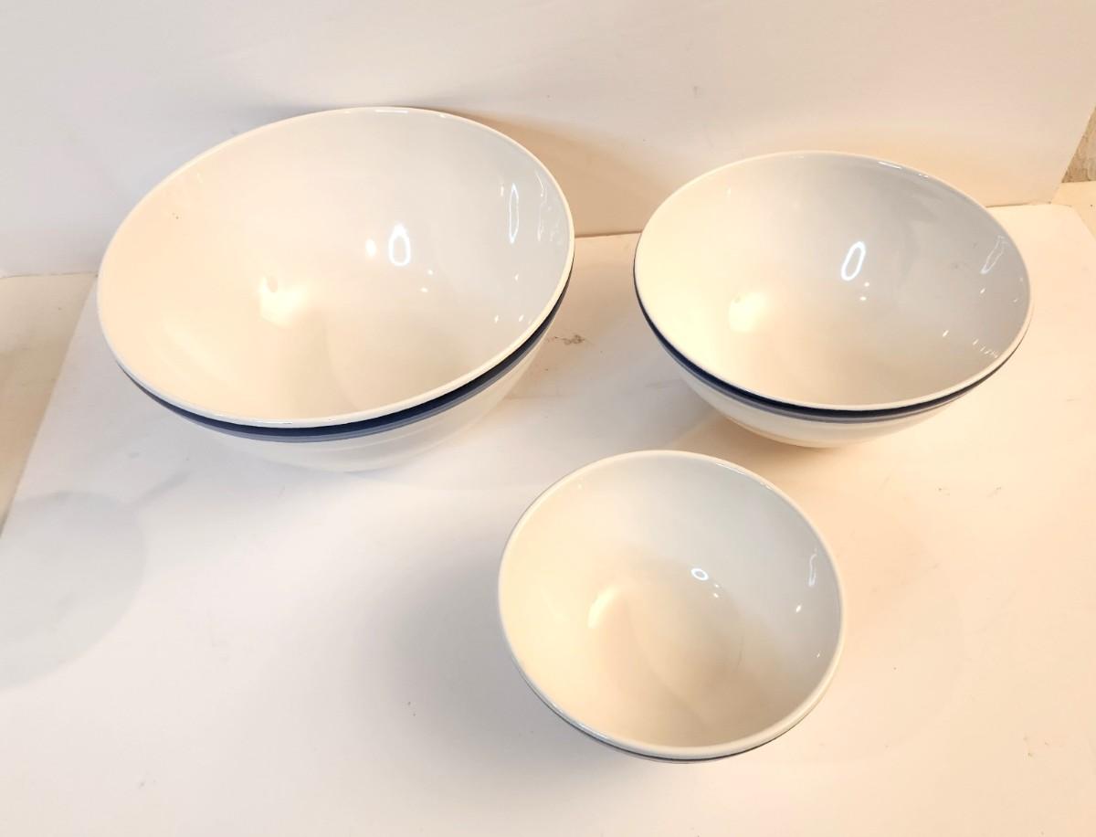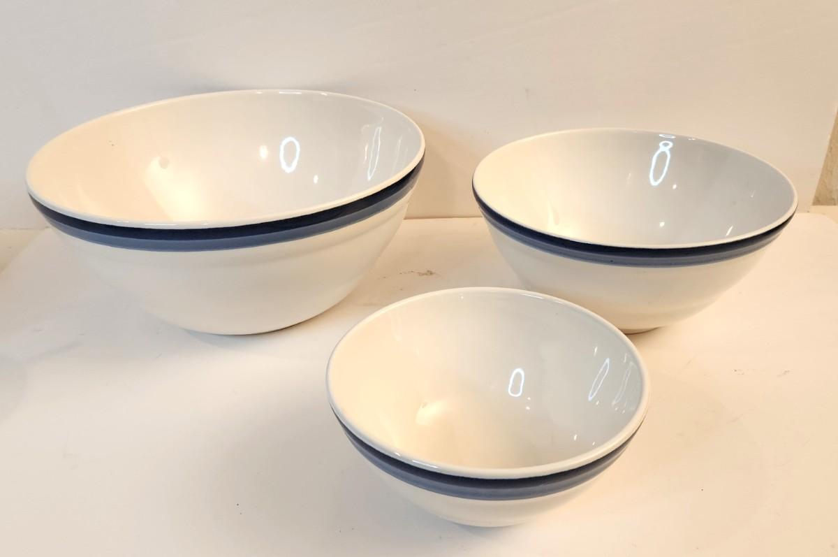 Nice lot of three Pfaltzgraff mixing bowls - white with blue bands. Graduated sizes - good condition.