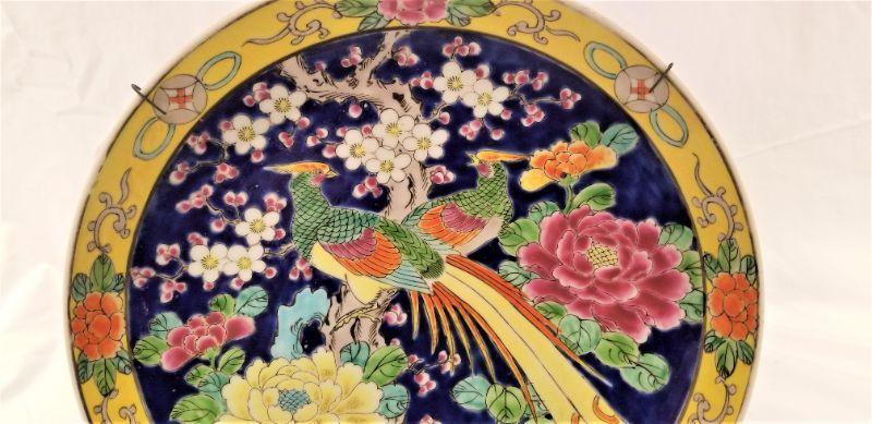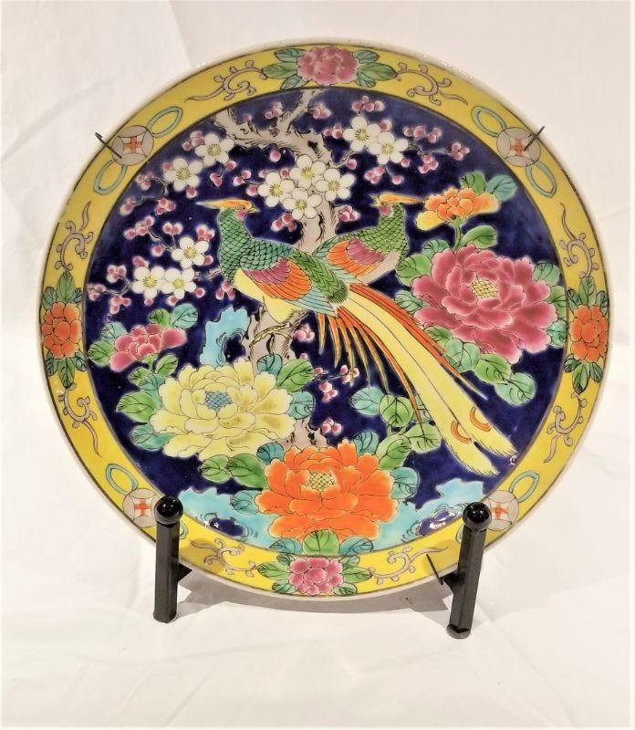 Antique Chinese Plate - very colorful - features bird and chrysanthemums. 12" across. Check the notes from the owner on the reverse.