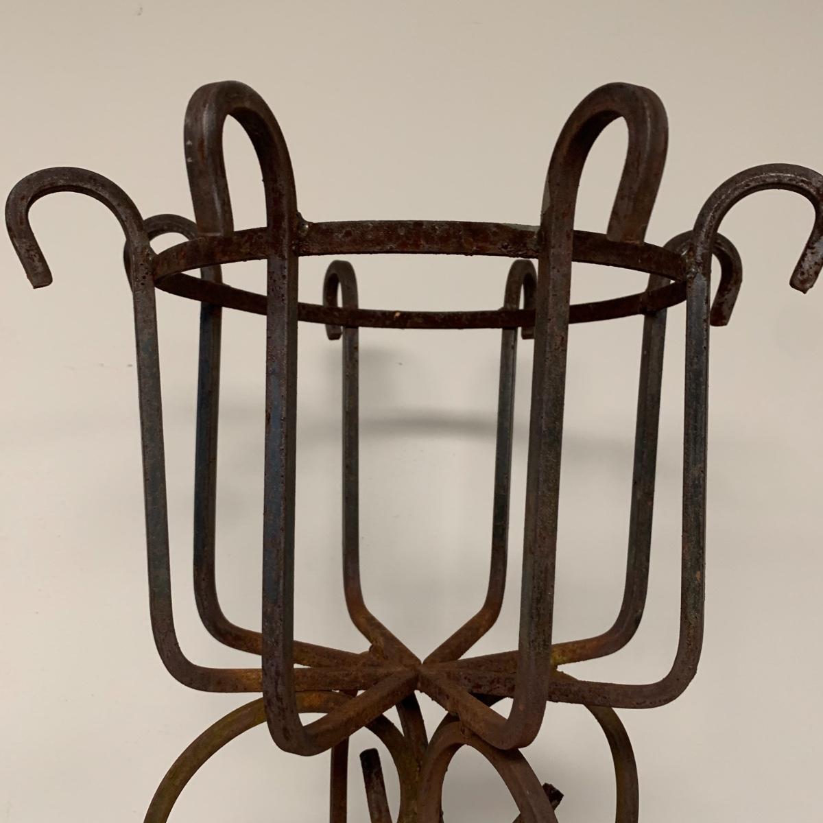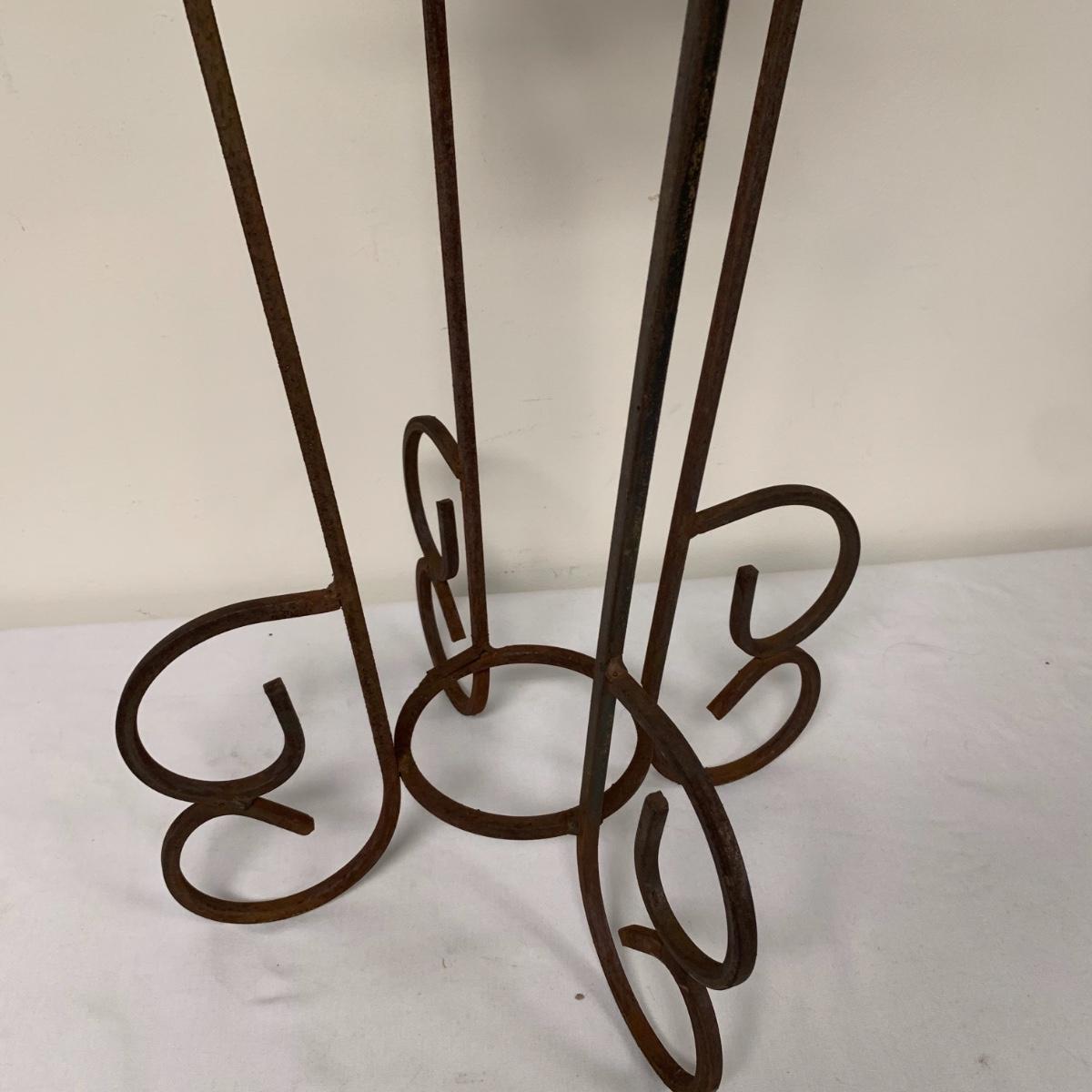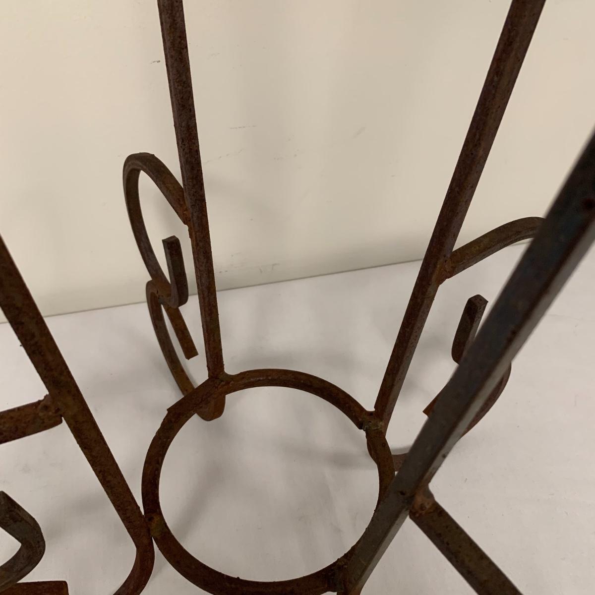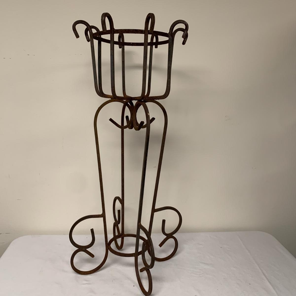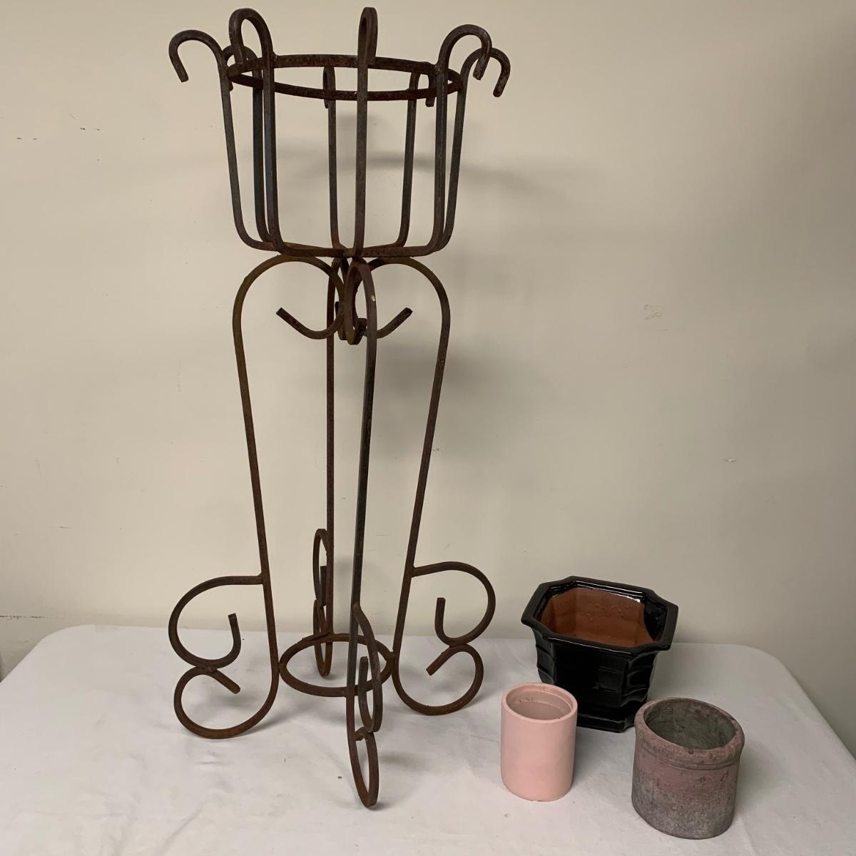 This lot includes one large metal garden pot holder / stand and three ceramic pots. The garden stand is made of a sturdy metal but is very rusted (see photos). It is slightly chipping at the base of the stand (see photos). The stand measures about 16in x 16in x 36in. The lot also includes one 8in x 6in black pot, one 5in x 5in purple / gray pot, and one 4.5in x 4in pink pot. The purple / gray pot has some small cracks (see photos). Shipping not available.