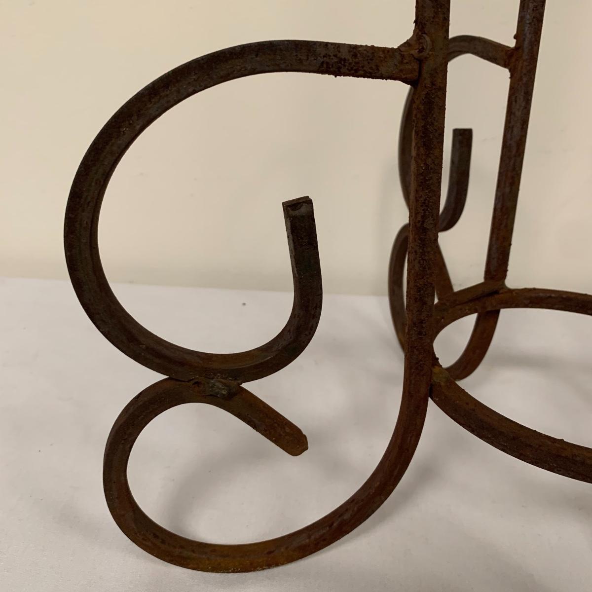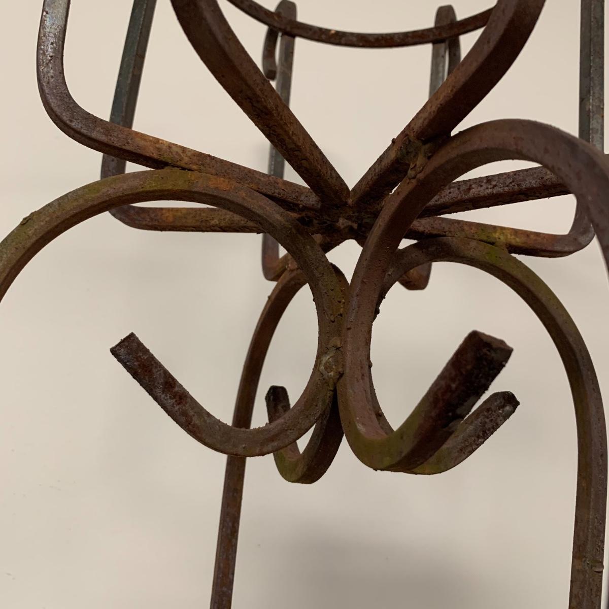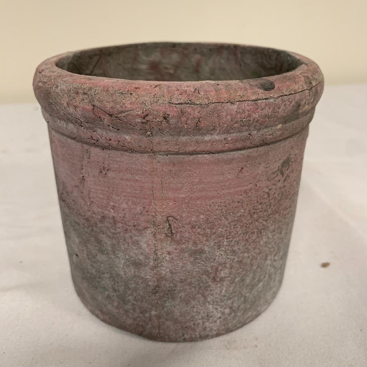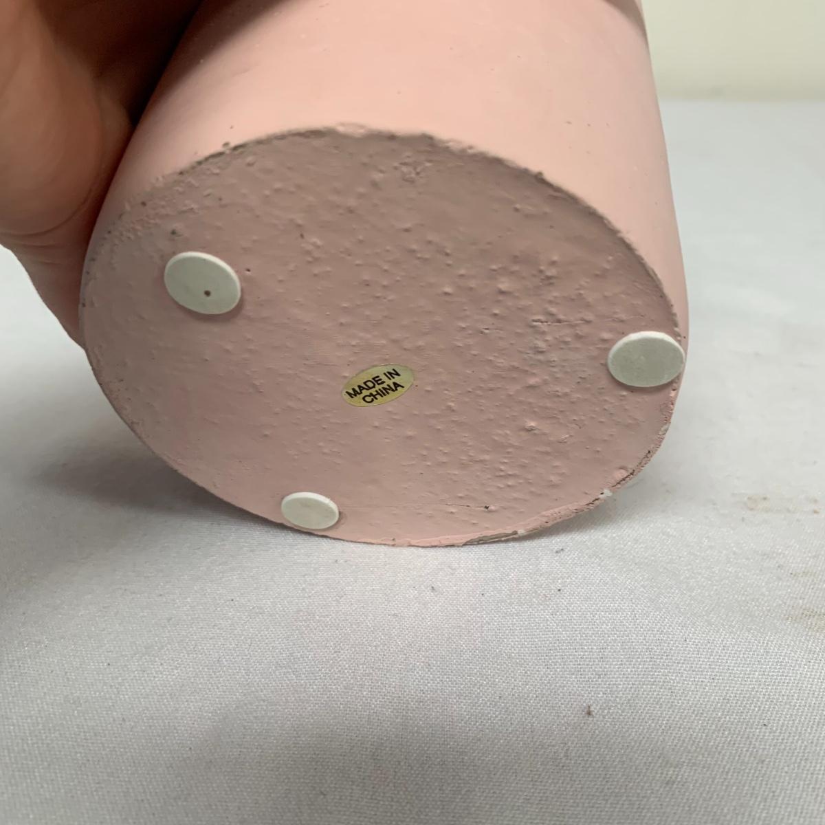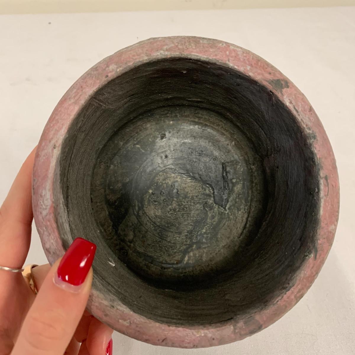 This lot includes one large metal garden pot holder / stand and three ceramic pots. The garden stand is made of a sturdy metal but is very rusted (see photos). It is slightly chipping at the base of the stand (see photos). The stand measures about 16in x 16in x 36in. The lot also includes one 8in x 6in black pot, one 5in x 5in purple / gray pot, and one 4.5in x 4in pink pot. The purple / gray pot has some small cracks (see photos). Shipping not available.
