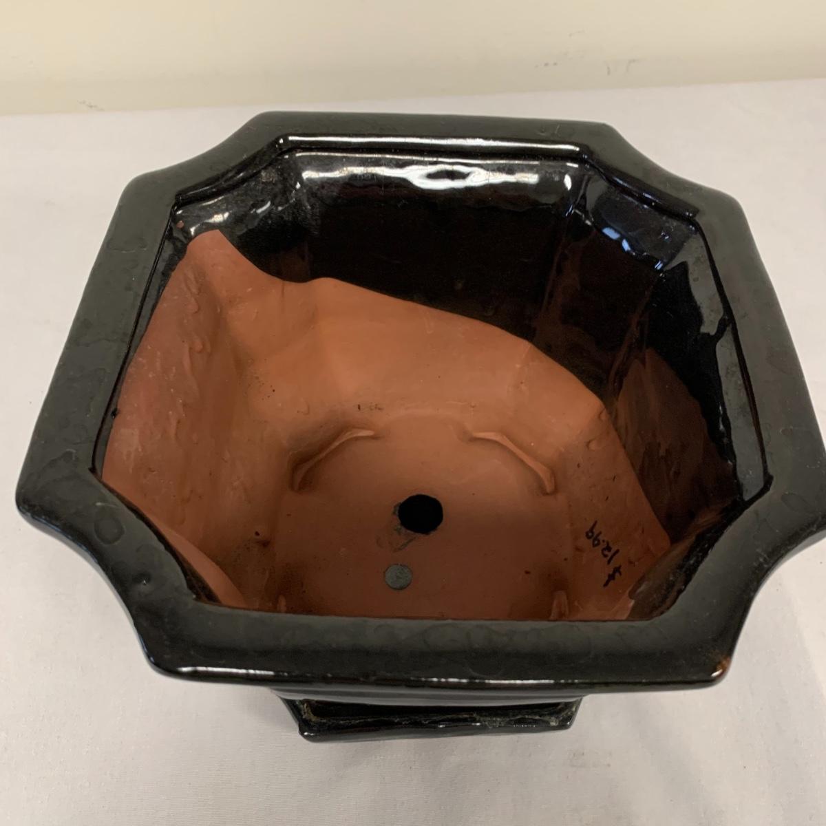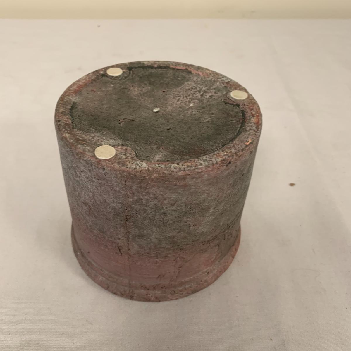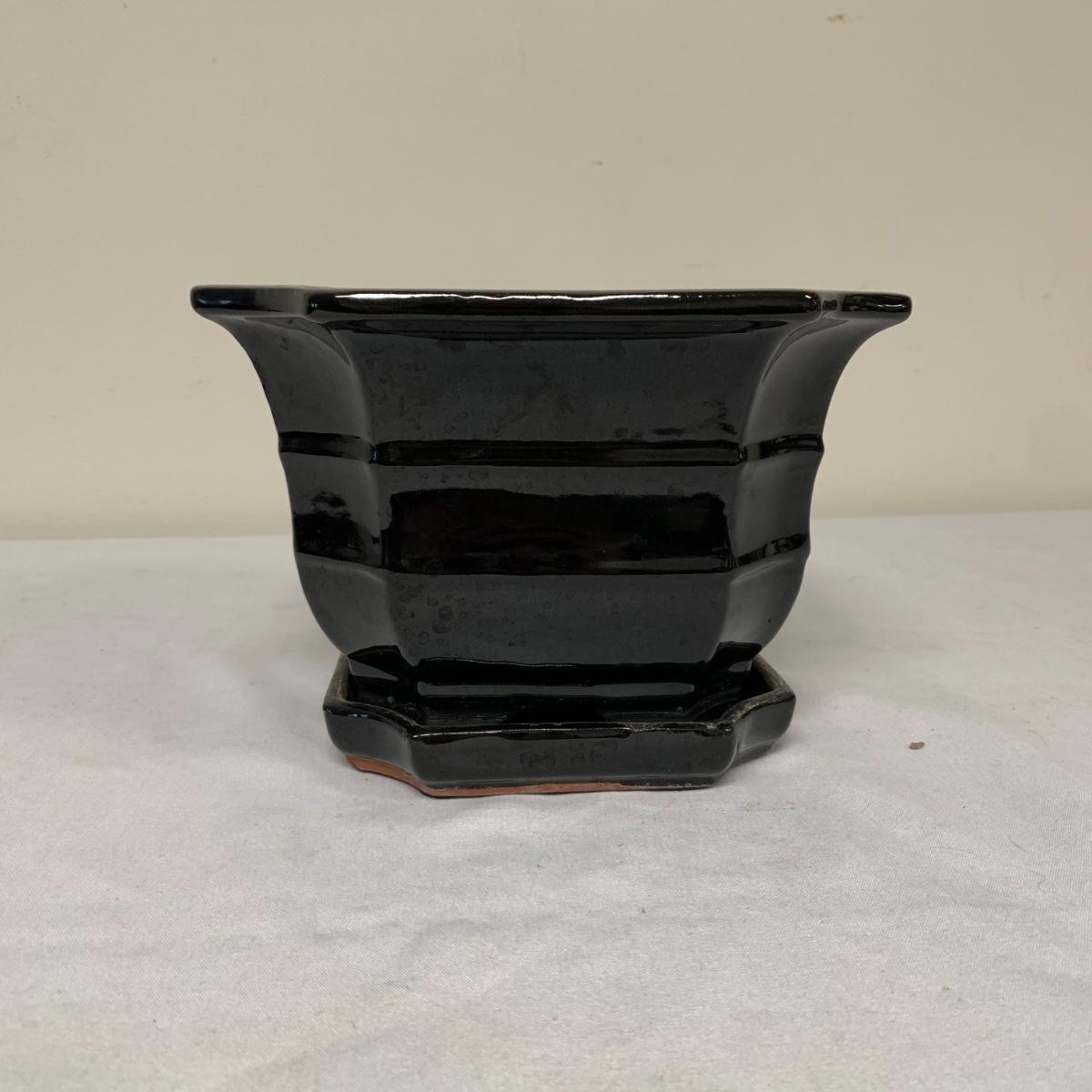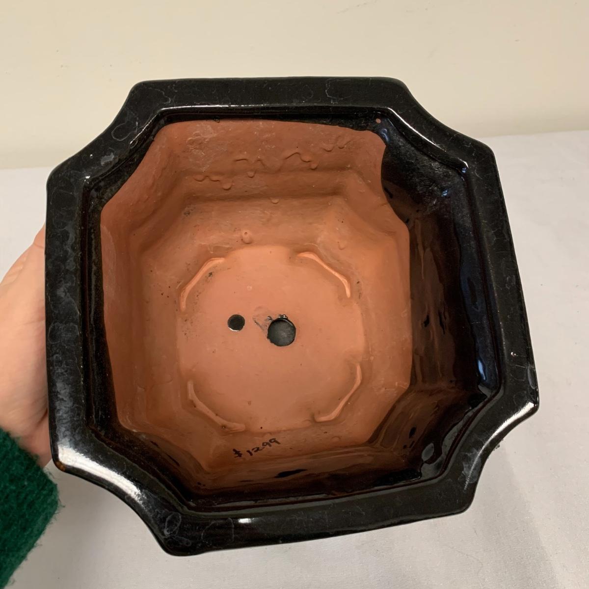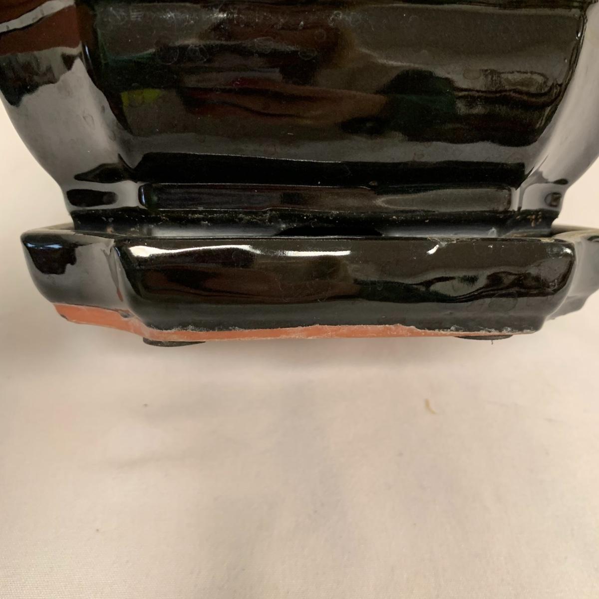 This lot includes one large metal garden pot holder / stand and three ceramic pots. The garden stand is made of a sturdy metal but is very rusted (see photos). It is slightly chipping at the base of the stand (see photos). The stand measures about 16in x 16in x 36in. The lot also includes one 8in x 6in black pot, one 5in x 5in purple / gray pot, and one 4.5in x 4in pink pot. The purple / gray pot has some small cracks (see photos). Shipping not available.