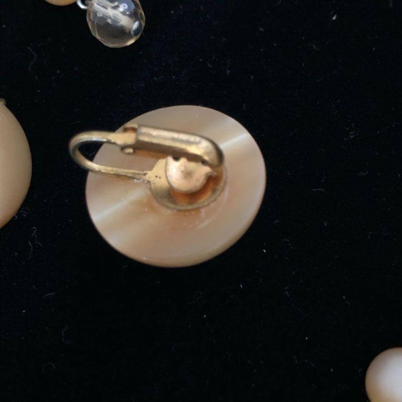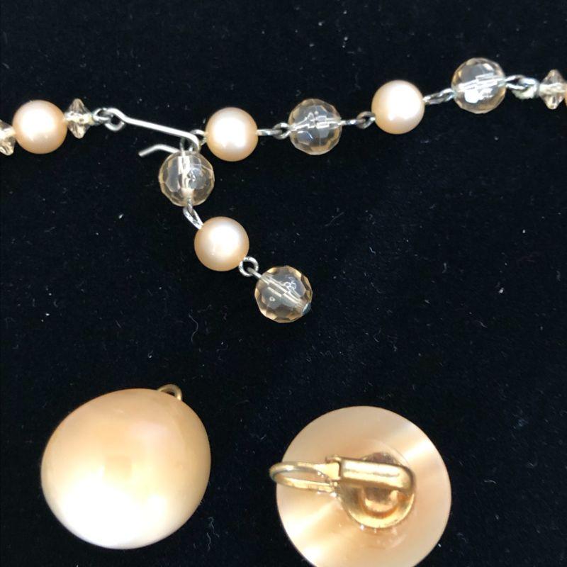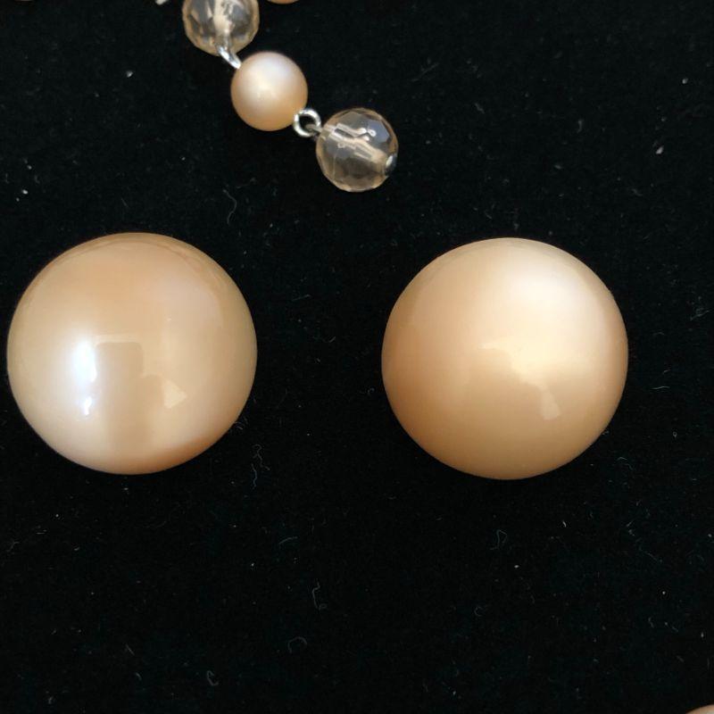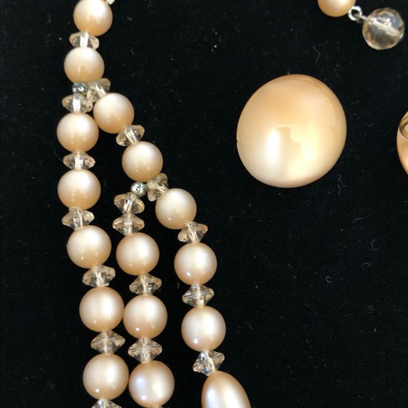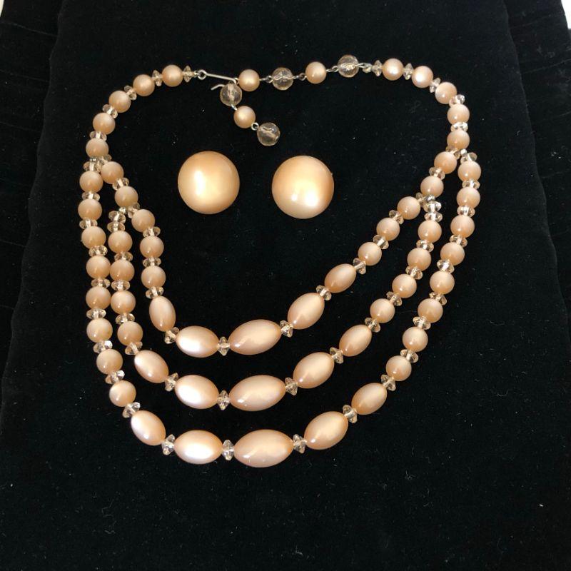 These beads are a champagne color and the set is in excellent condition. There is a pearly effect to all of the beads.