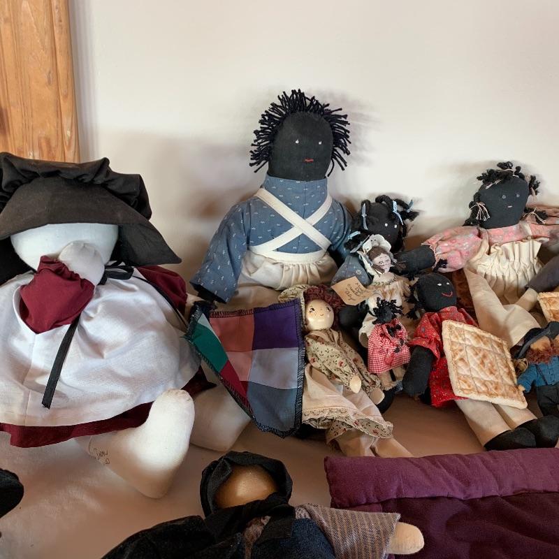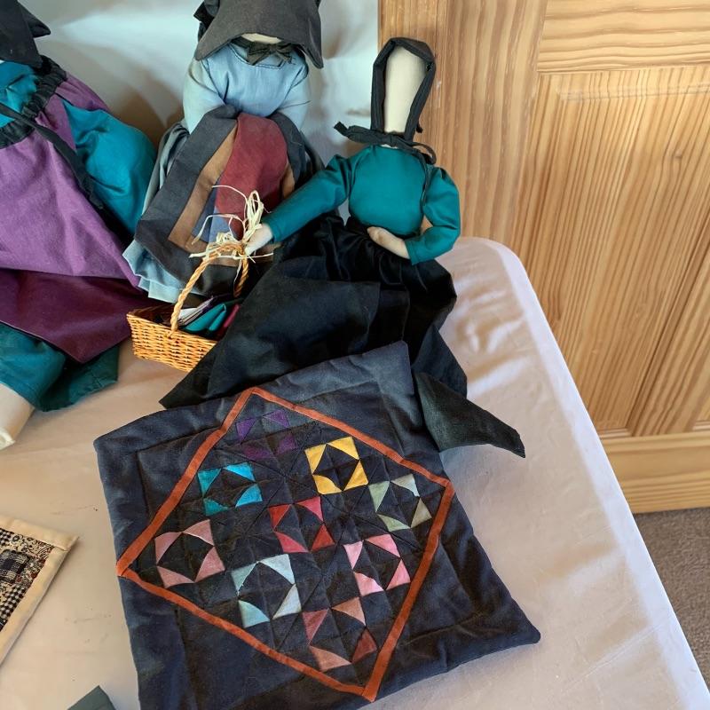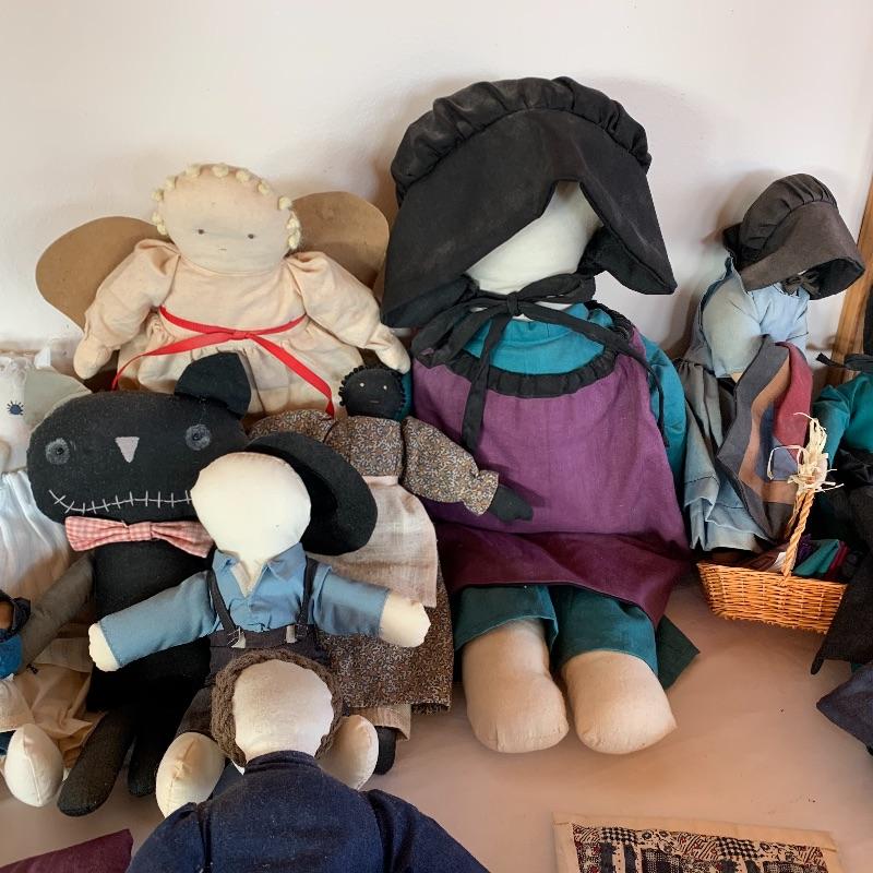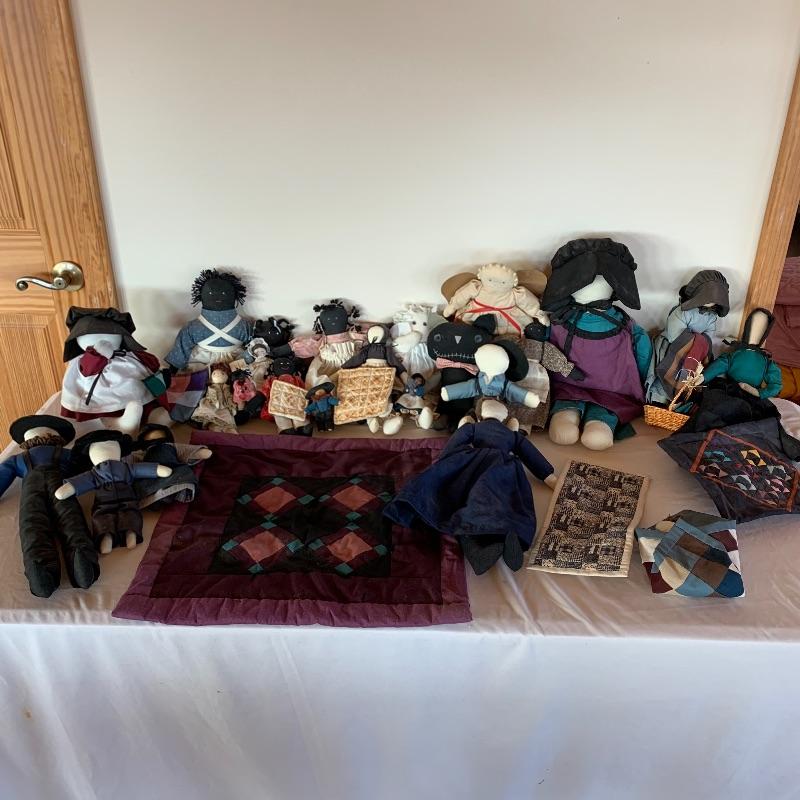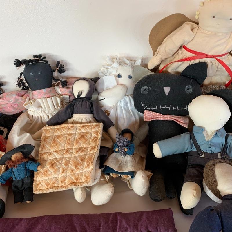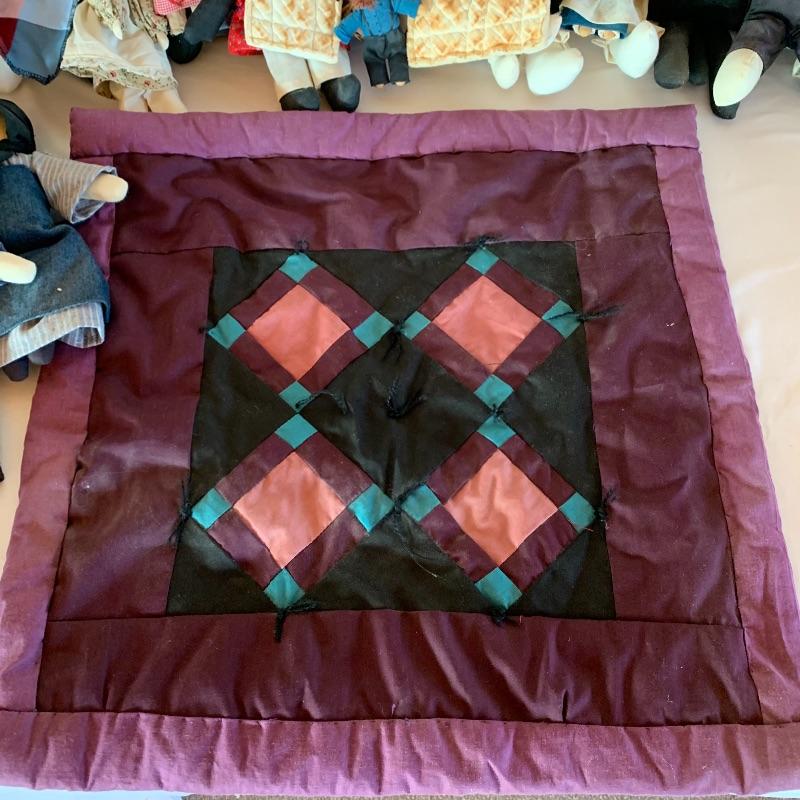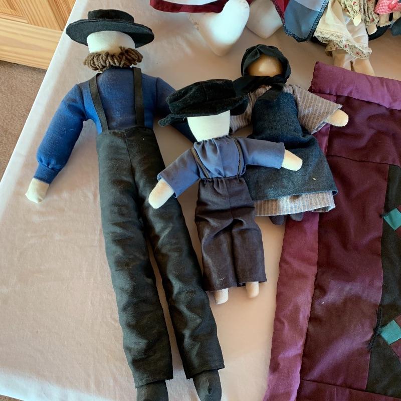 This collection of dolls are a combined selection of Amish Dolls with quilts, the faceless style dolls, and traditional musilin dolls. Some are a bit dusty and one is actually made from clothes pins. This is a fun, sweet little collection. The purple quilt measures 19” x 19”. Shipping available.