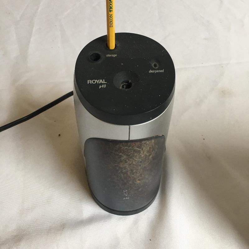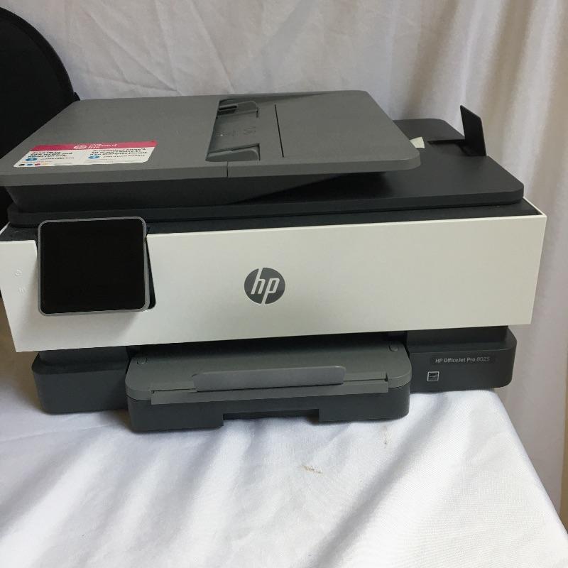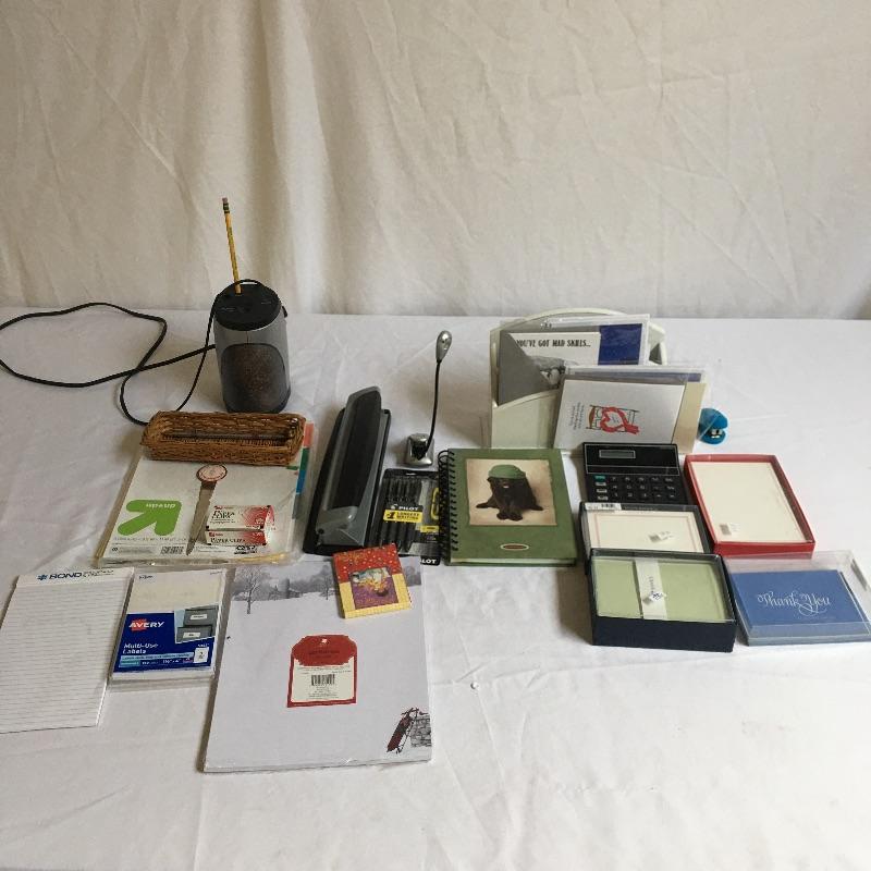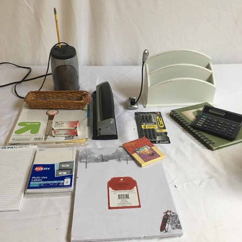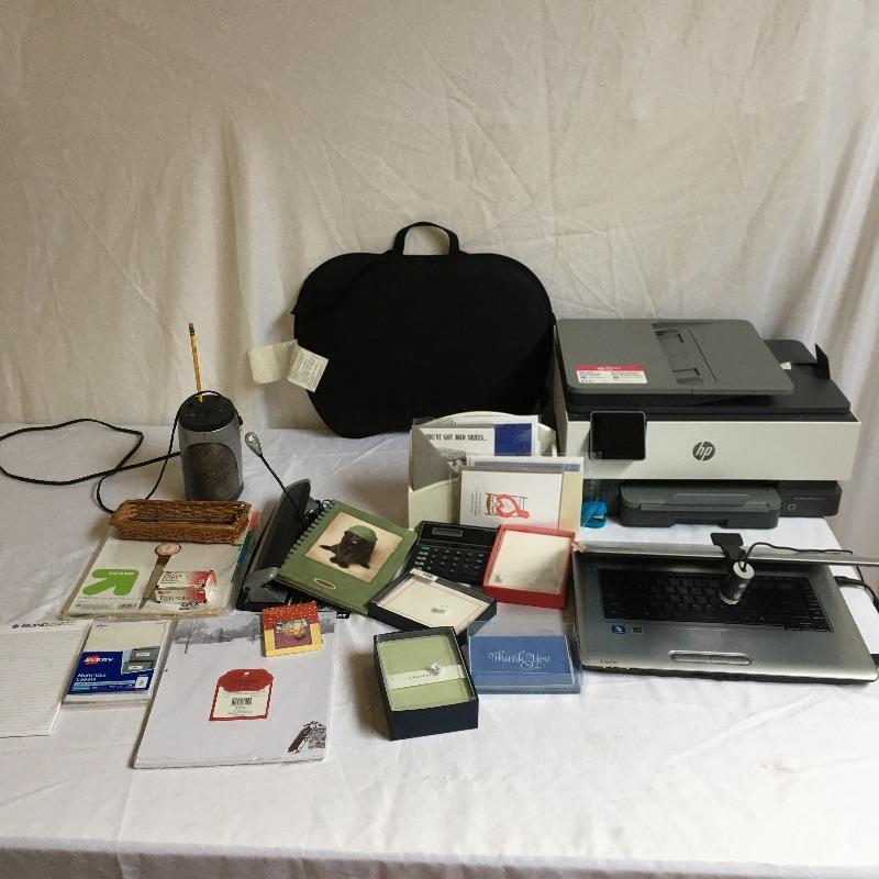 Lot includes HP OfficeJet Pro 8025 printer and a Toshiba Satelite laptop. Also includes some office supplies like an electric pencil sharpener, pens, hole punch, clipboard, lap desk and more. Computer hard drive has been wiped, it has no operating system on it. Printer, sharpener and computer powered on when tested.