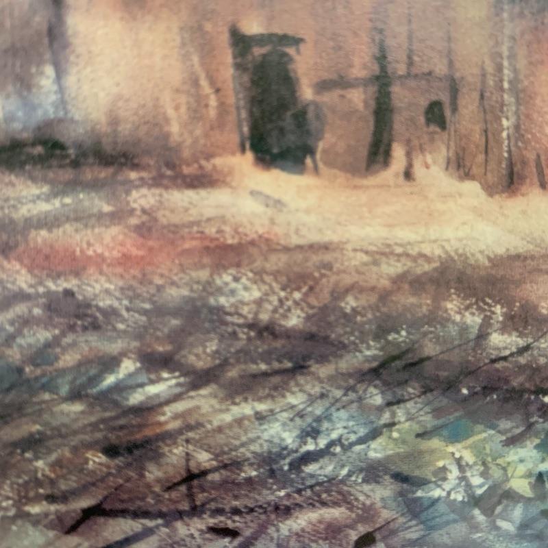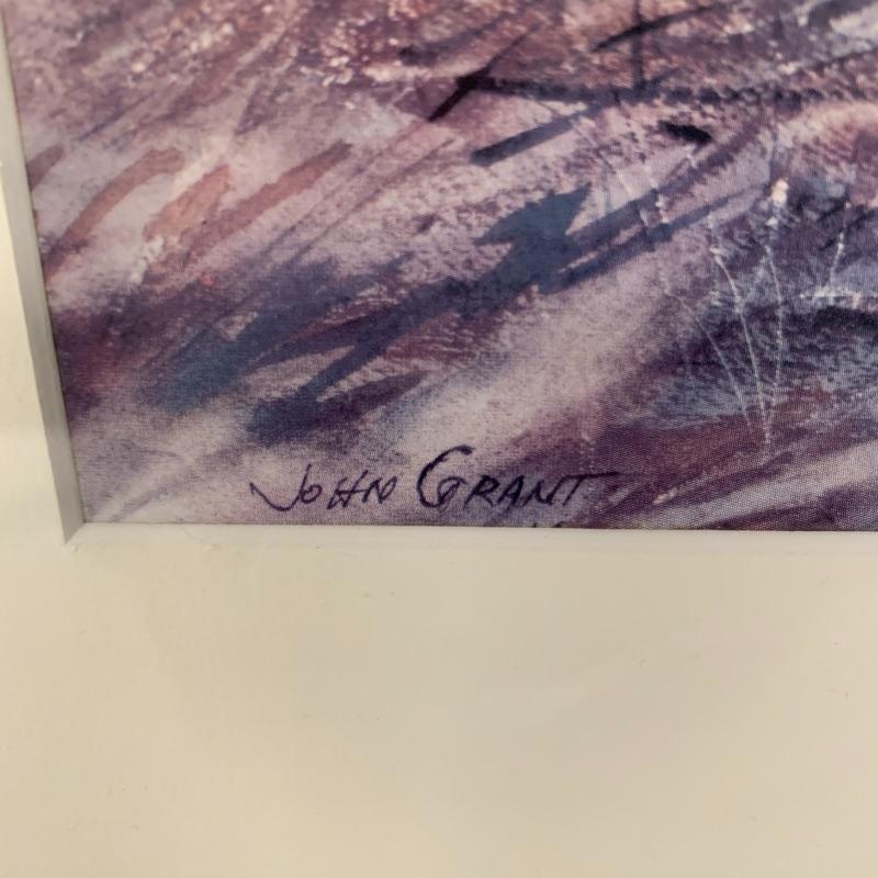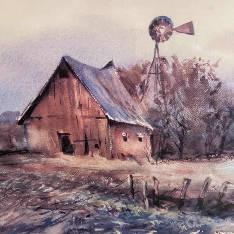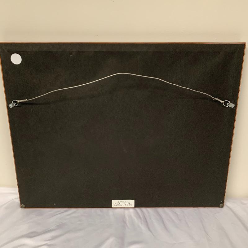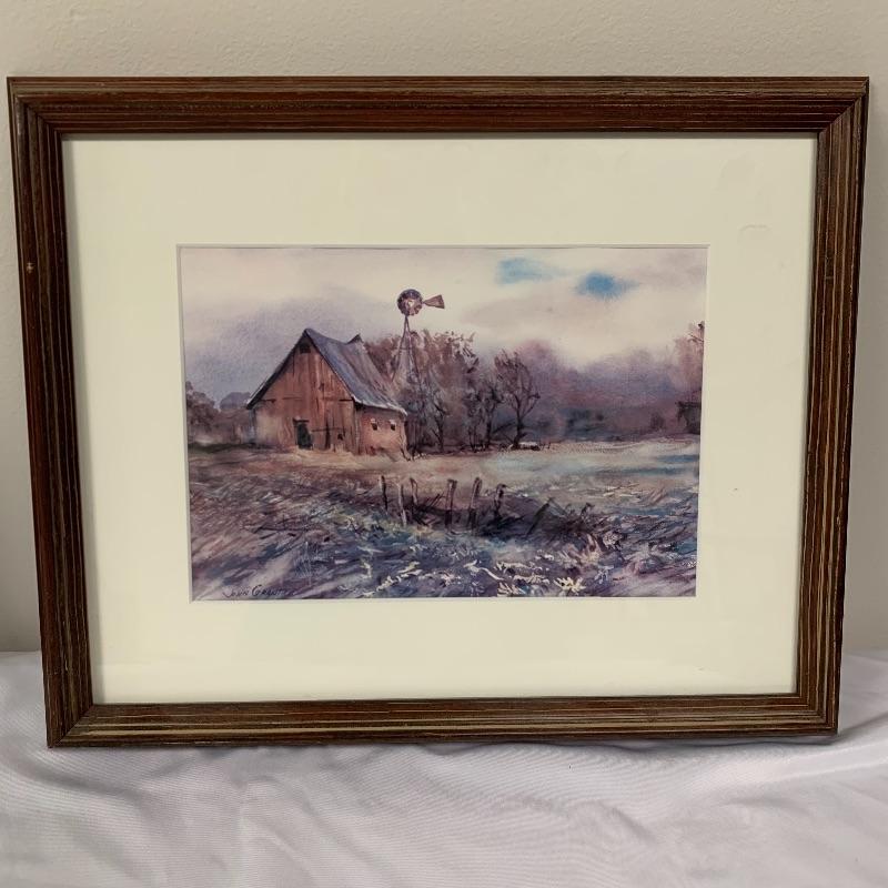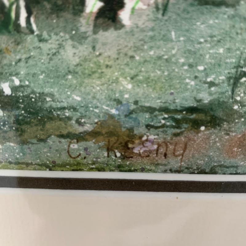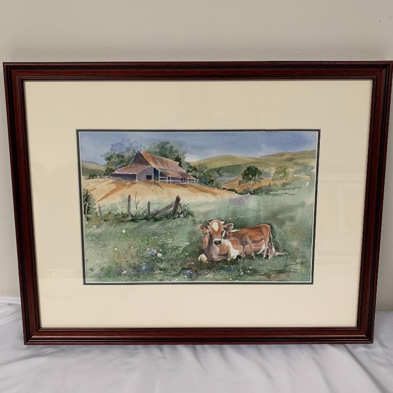 Cow and barn scene artwork is signed by C. Keeny. Appears to be a watercolor. Art is behind glass and mated. Measures 23in x 18in. The barn scene is a print with printed signature. Both professionally framed by Art Works Etc. Art is behind glass and mated. Measures 16in x 13in