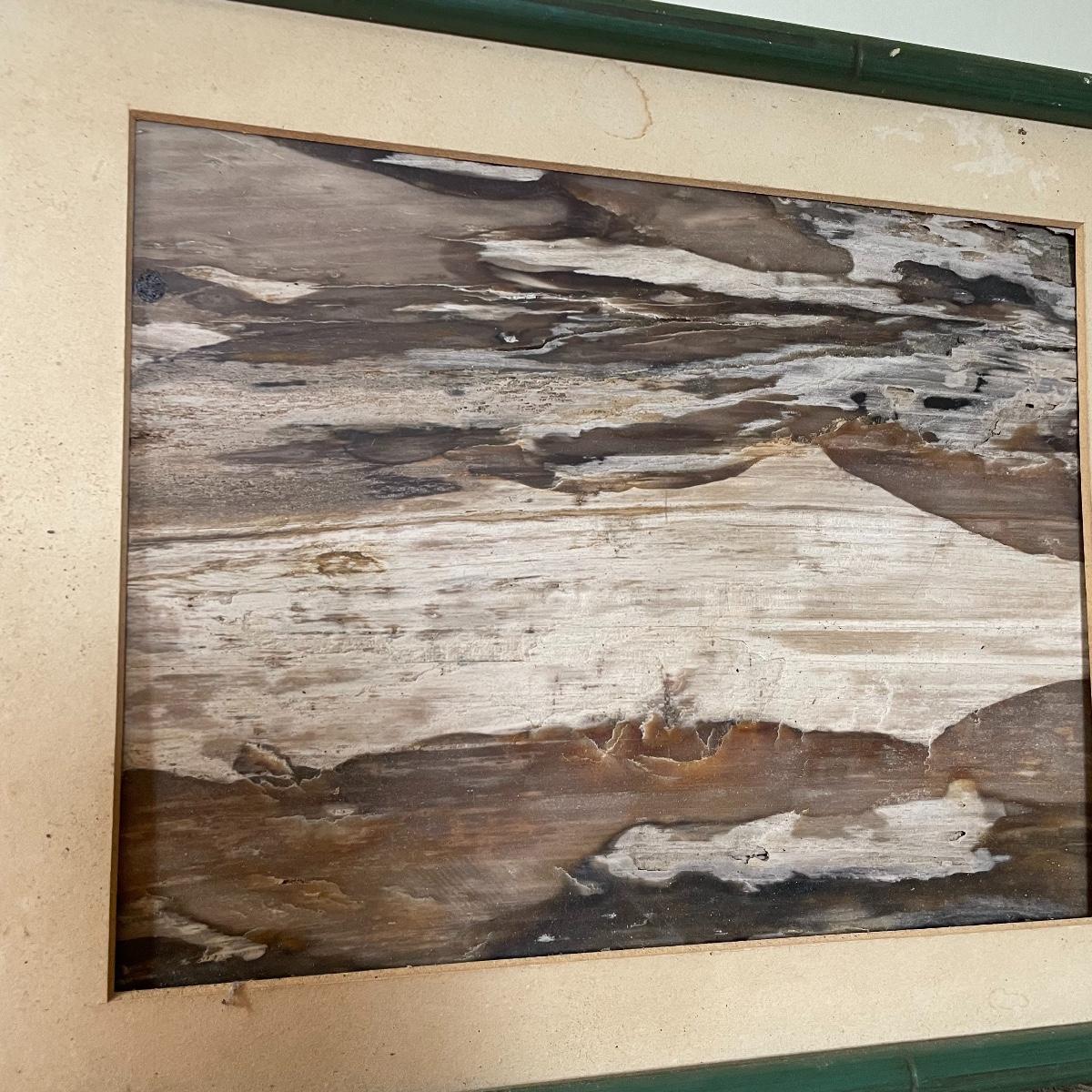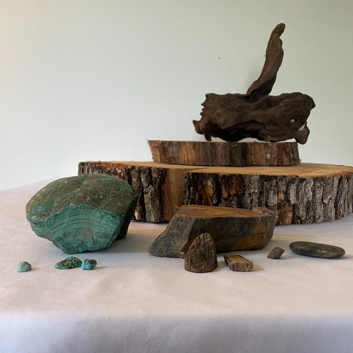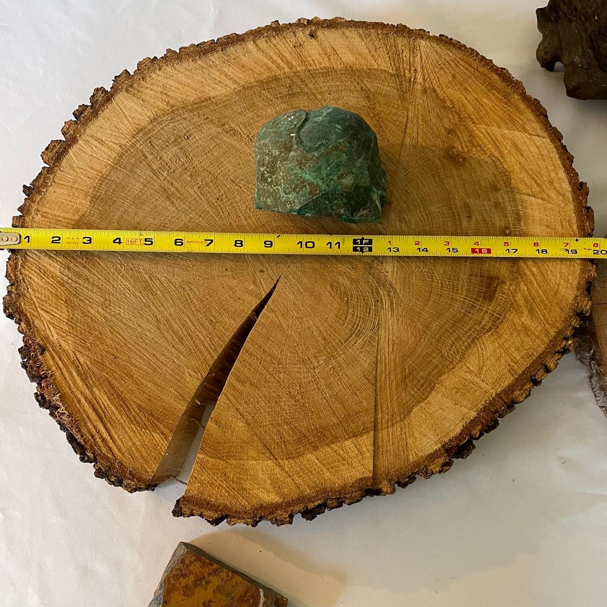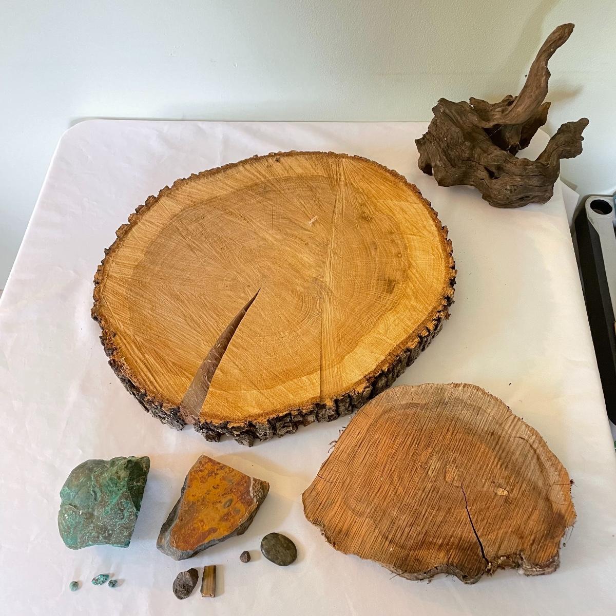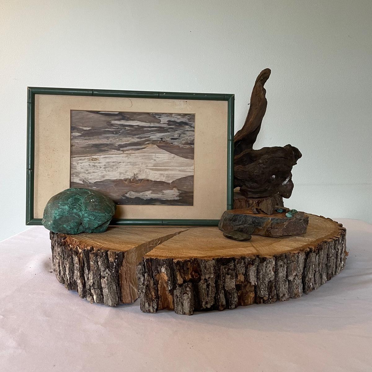 A stunning collection of beautiful natural art. Lot includes two roundish pieces of raw wood, the larger is perfect for a small tabletop measuring 20” x 18” x 3”. The smaller would make a nice stand for more decor, possibly display the dark driftwood. A large green striped stone appears to be unpolished malachite. A frame without glass and a slightly worn mat holding what appears to be petrified wood. Lot includes more stones and artifacts. See images. Local pick up only.