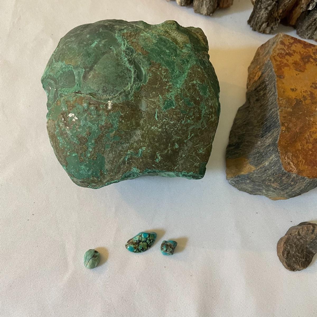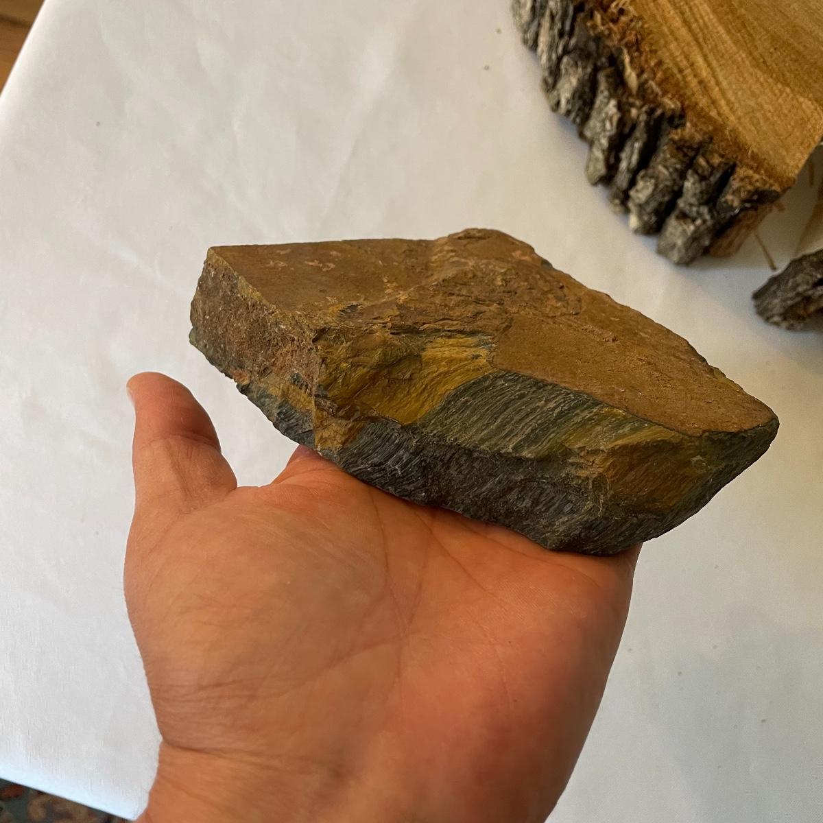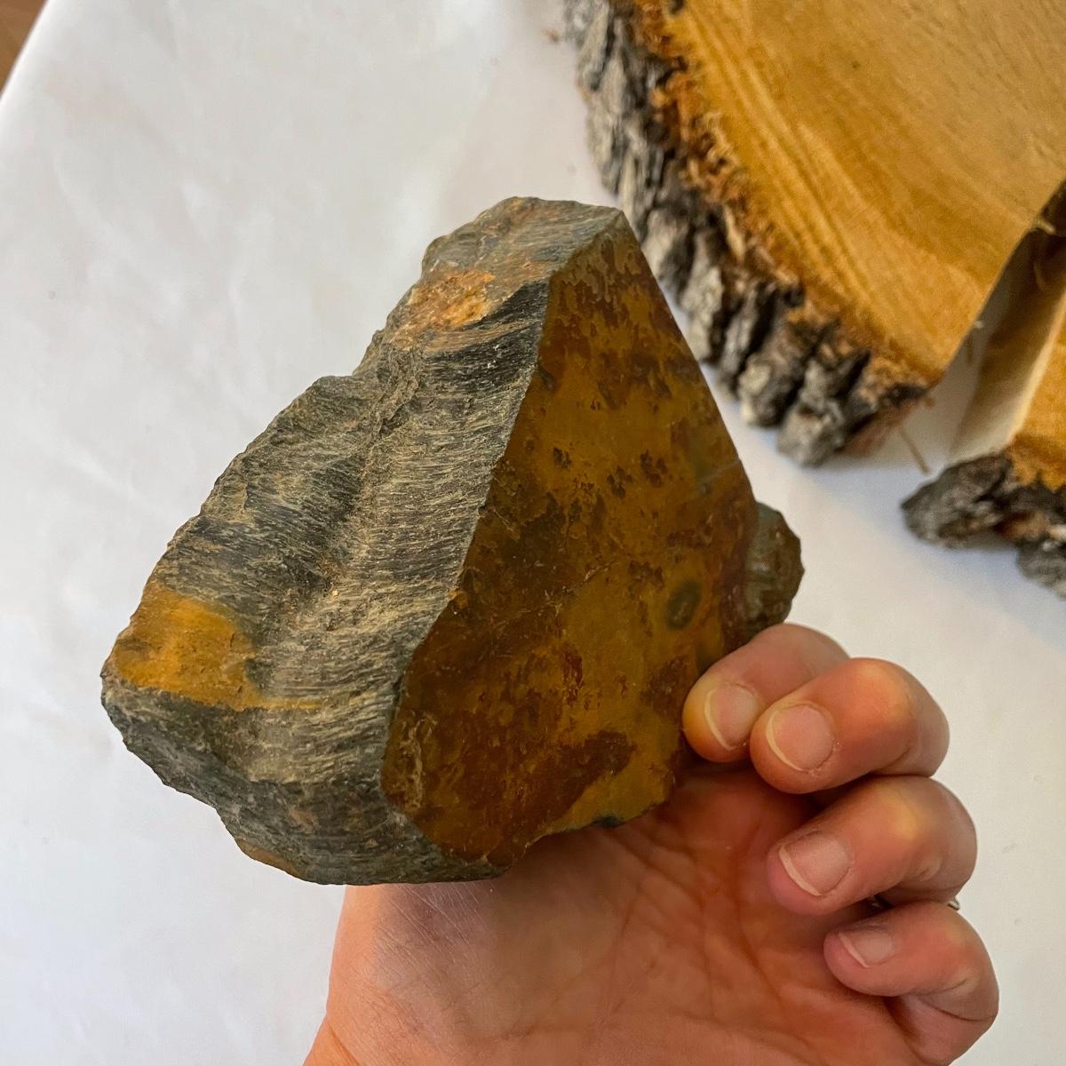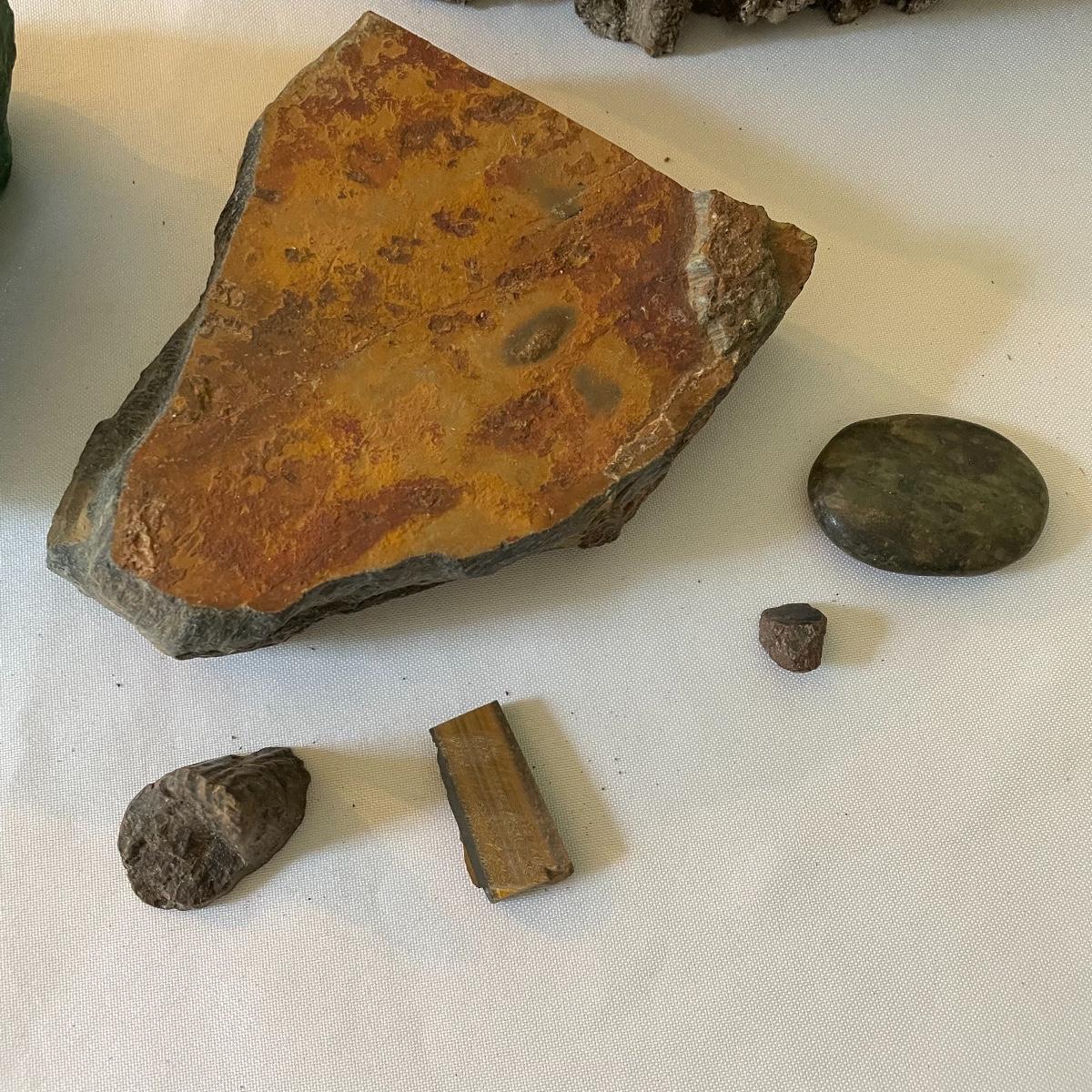 A stunning collection of beautiful natural art. Lot includes two roundish pieces of raw wood, the larger is perfect for a small tabletop measuring 20” x 18” x 3”. The smaller would make a nice stand for more decor, possibly display the dark driftwood. A large green striped stone appears to be unpolished malachite. A frame without glass and a slightly worn mat holding what appears to be petrified wood. Lot includes more stones and artifacts. See images. Local pick up only.