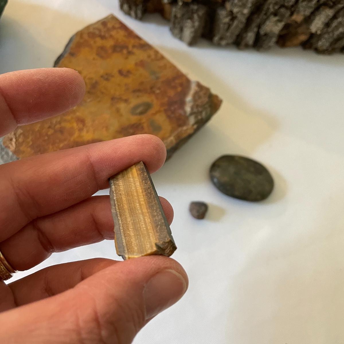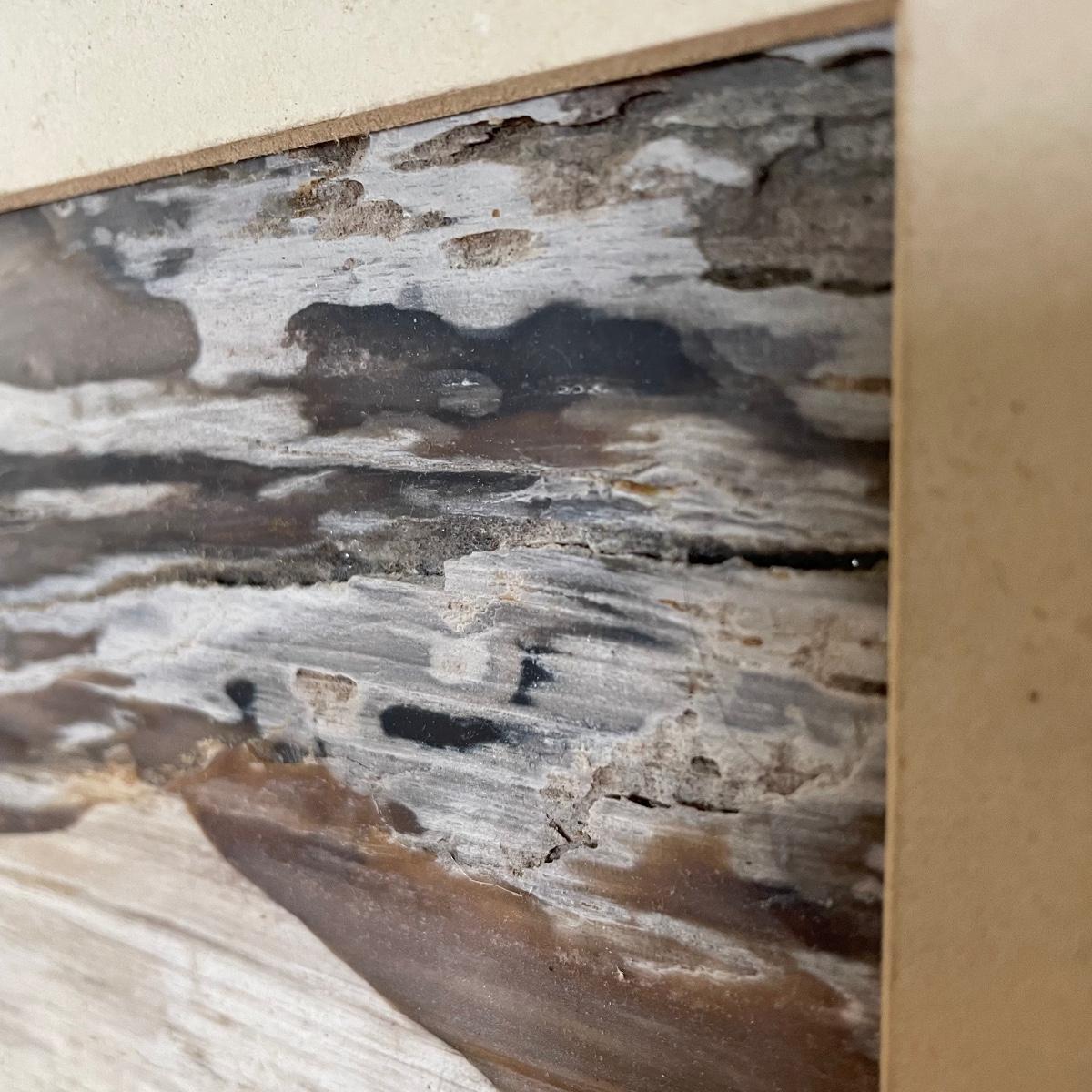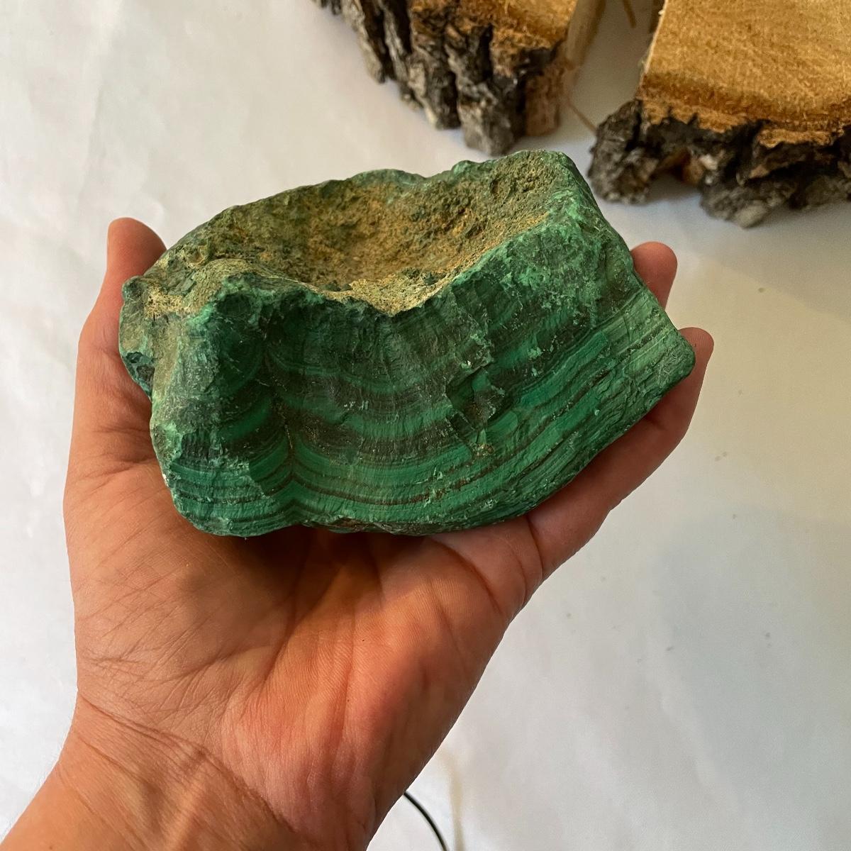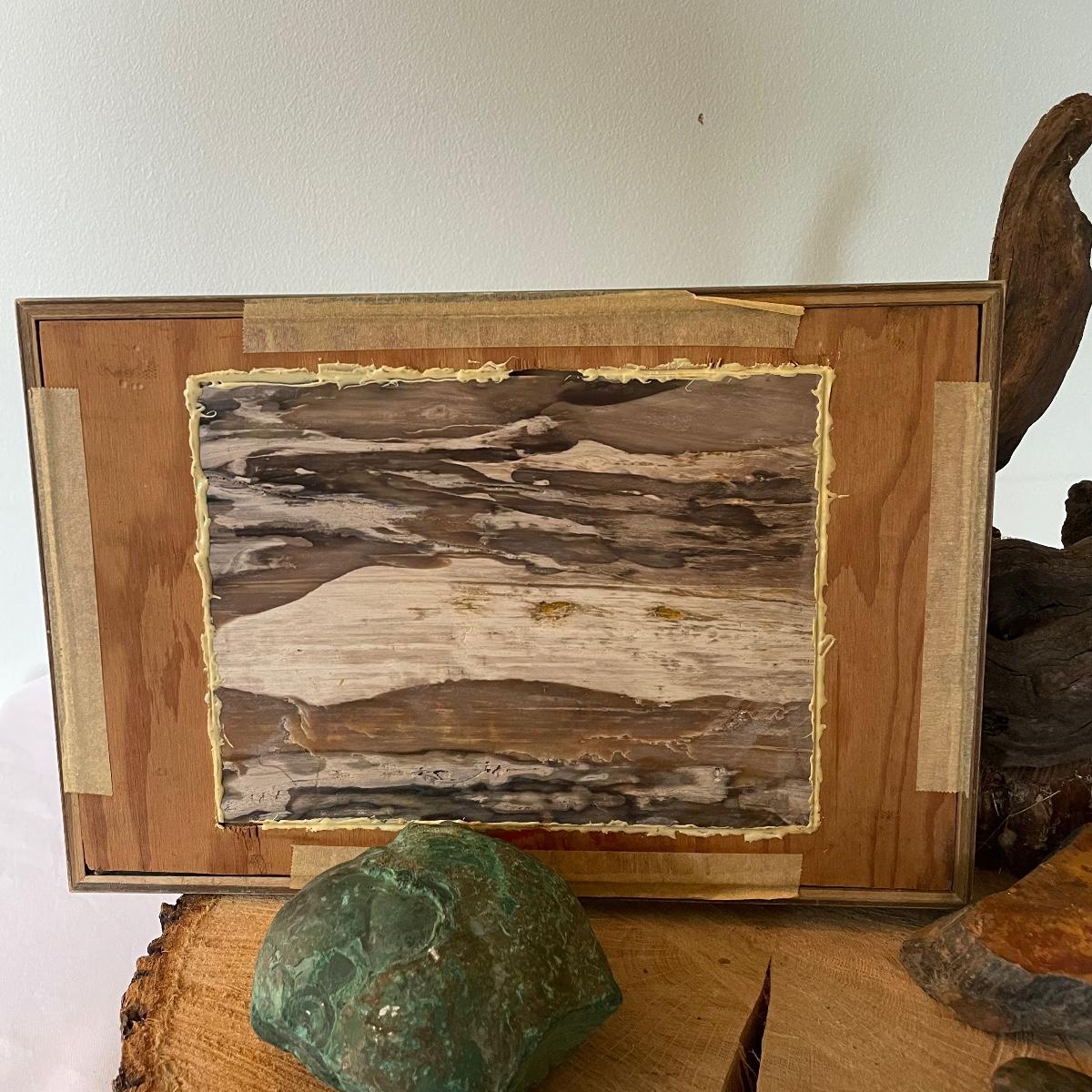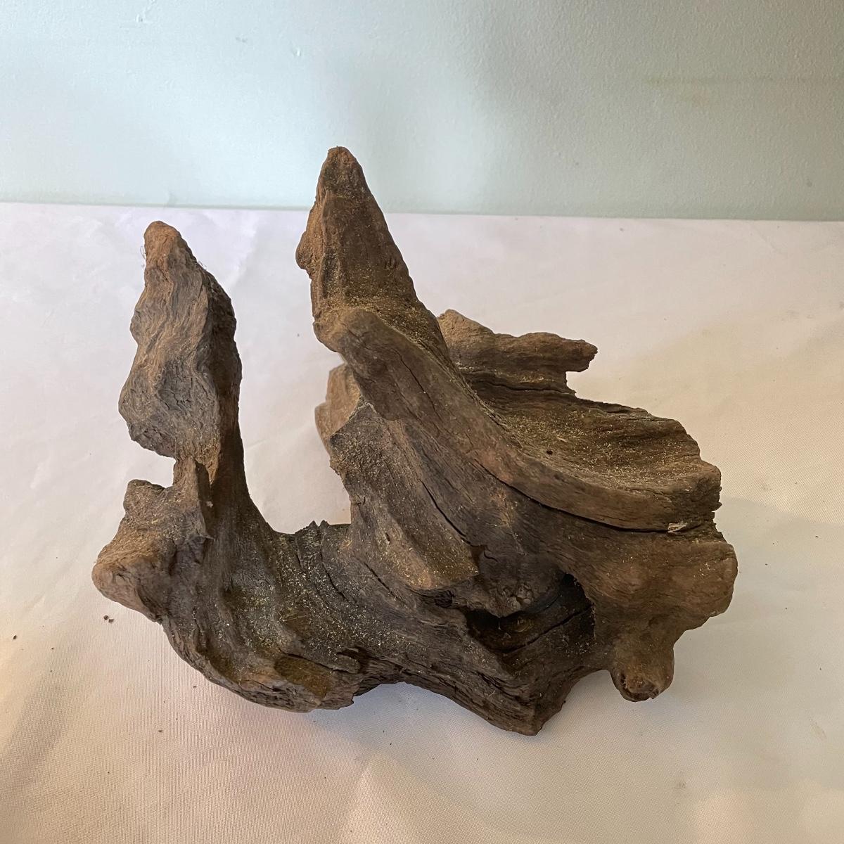 A stunning collection of beautiful natural art. Lot includes two roundish pieces of raw wood, the larger is perfect for a small tabletop measuring 20” x 18” x 3”. The smaller would make a nice stand for more decor, possibly display the dark driftwood. A large green striped stone appears to be unpolished malachite. A frame without glass and a slightly worn mat holding what appears to be petrified wood. Lot includes more stones and artifacts. See images. Local pick up only.