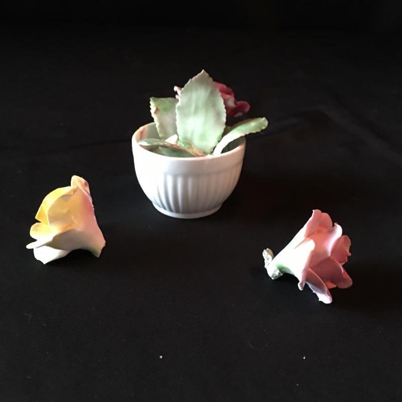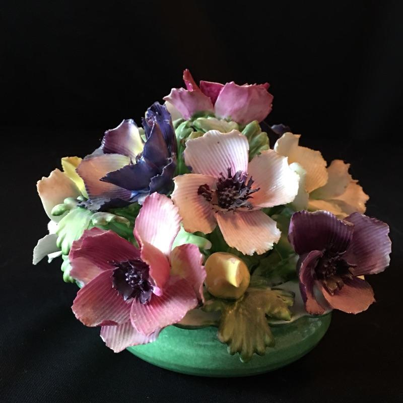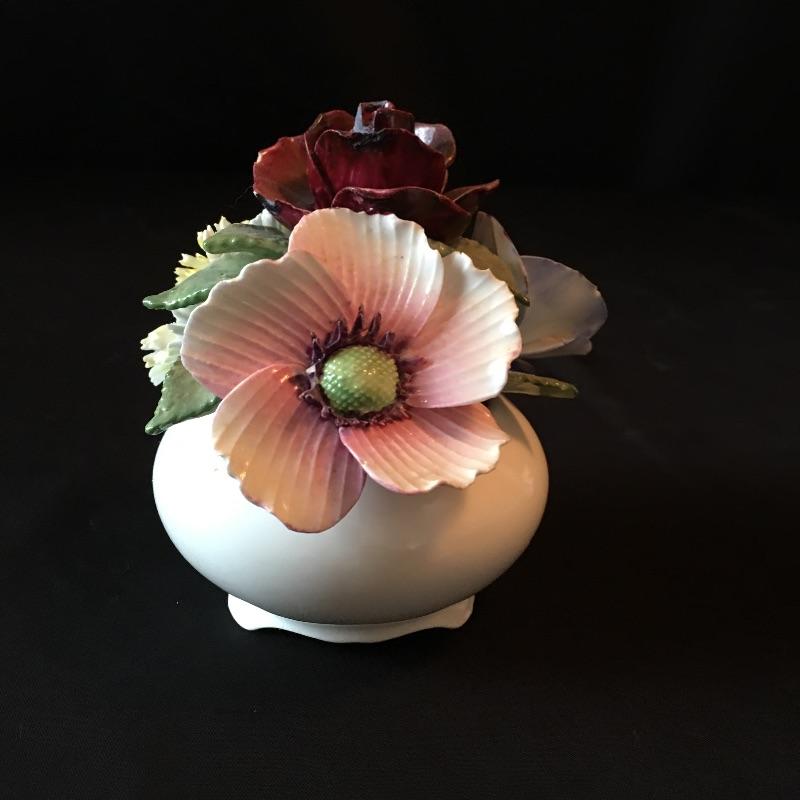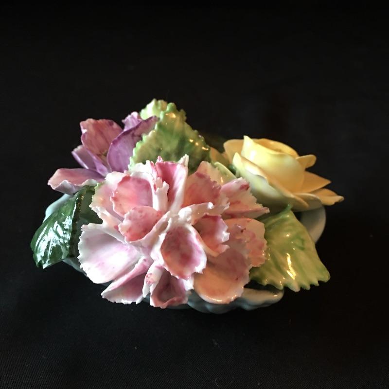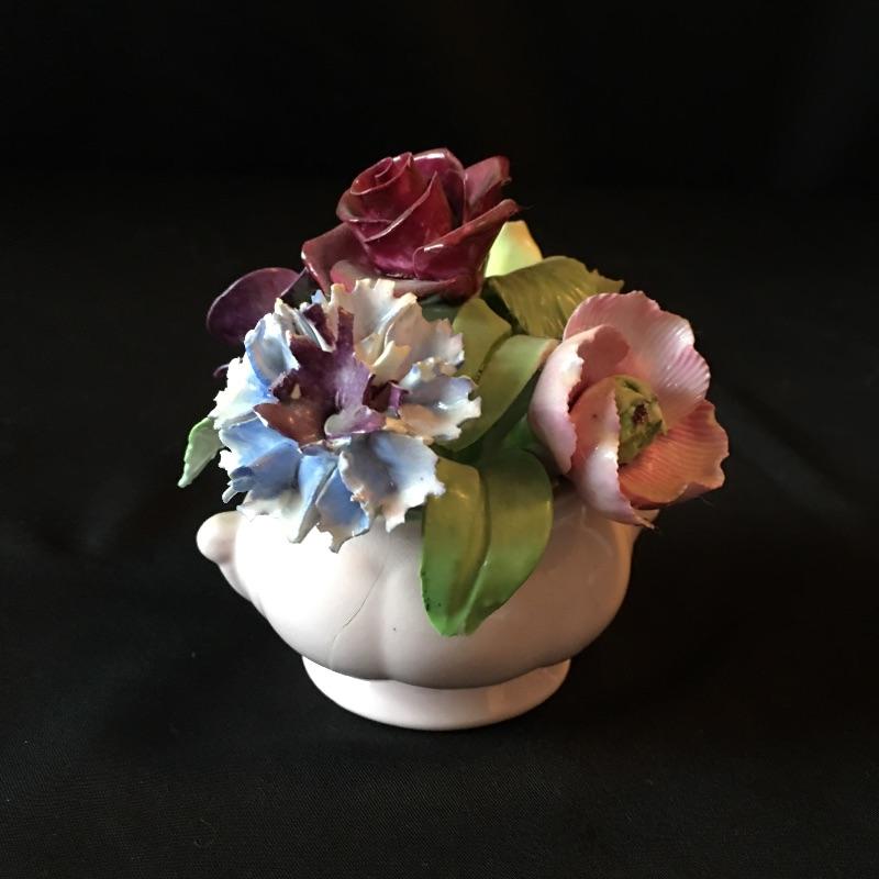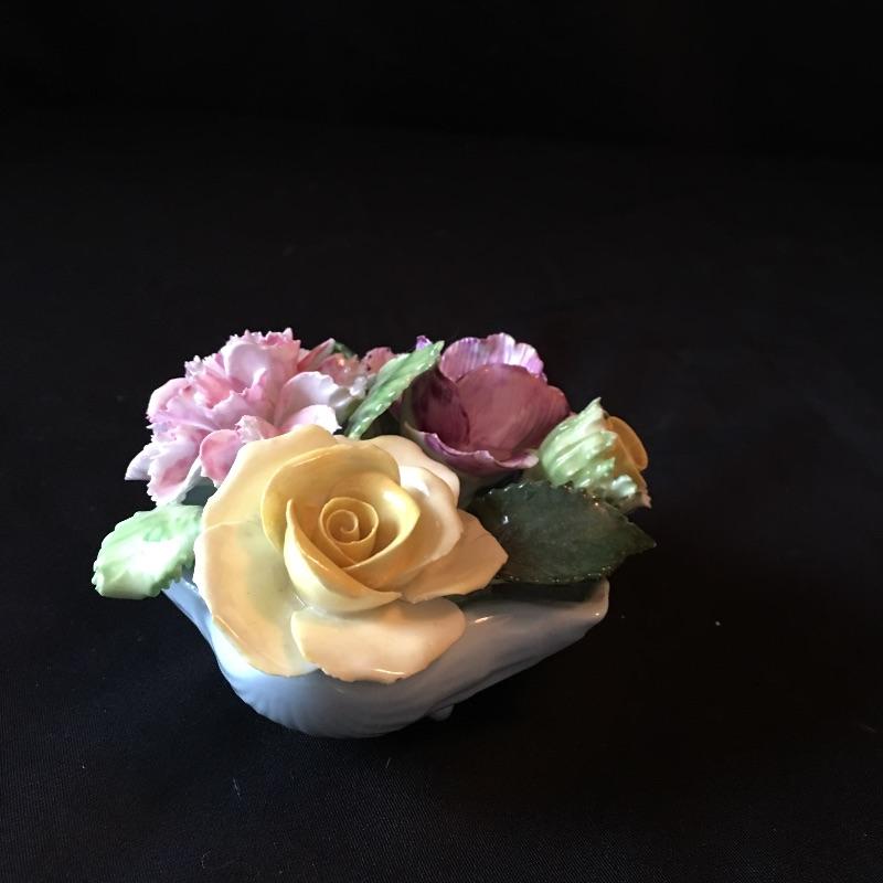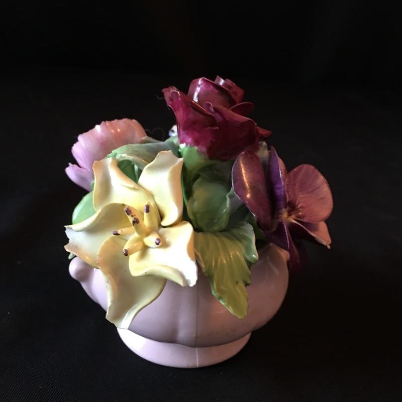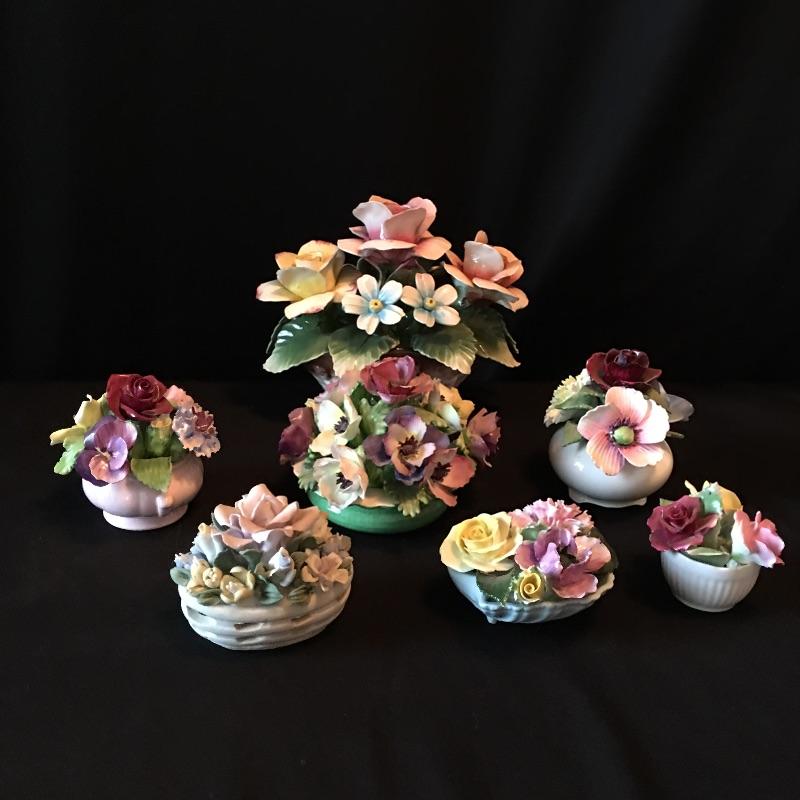 Porcelain flower array includes pieces by Radnor, Staffordshire, Royal Malvern, Adderly and Staffordshire that has a cracked pot, see pictures. A few of the pieces have chips and the one by Royal Malvern has two flowers broken off. Largest piece measures 6.5” x 8.5” x 6.5”.
