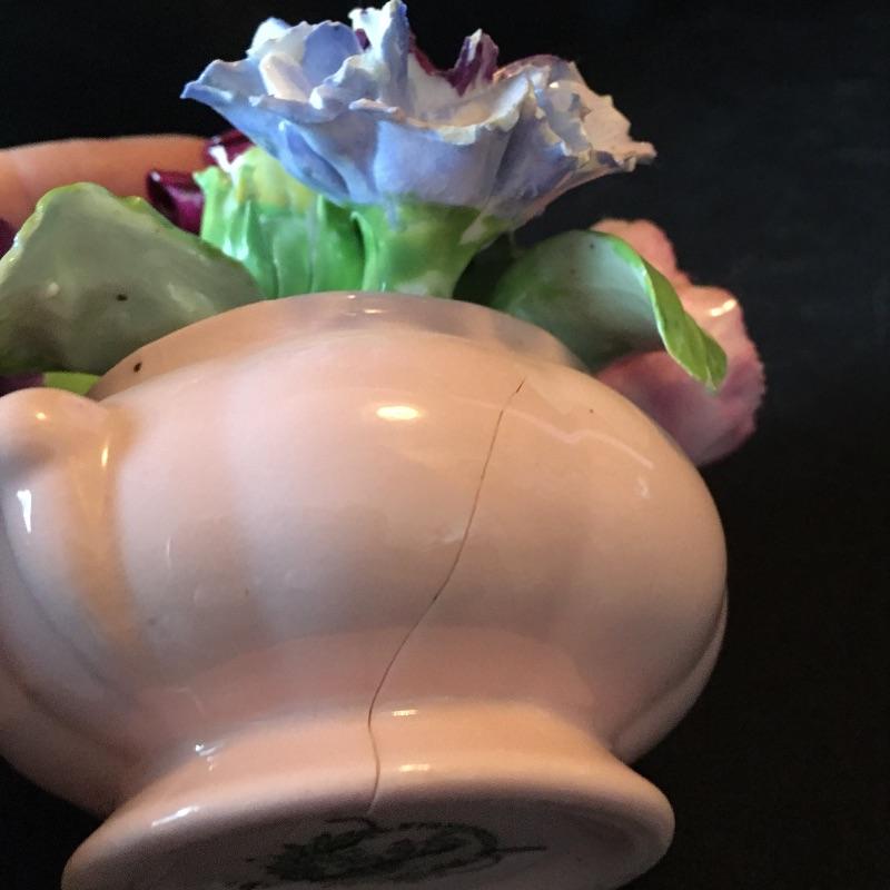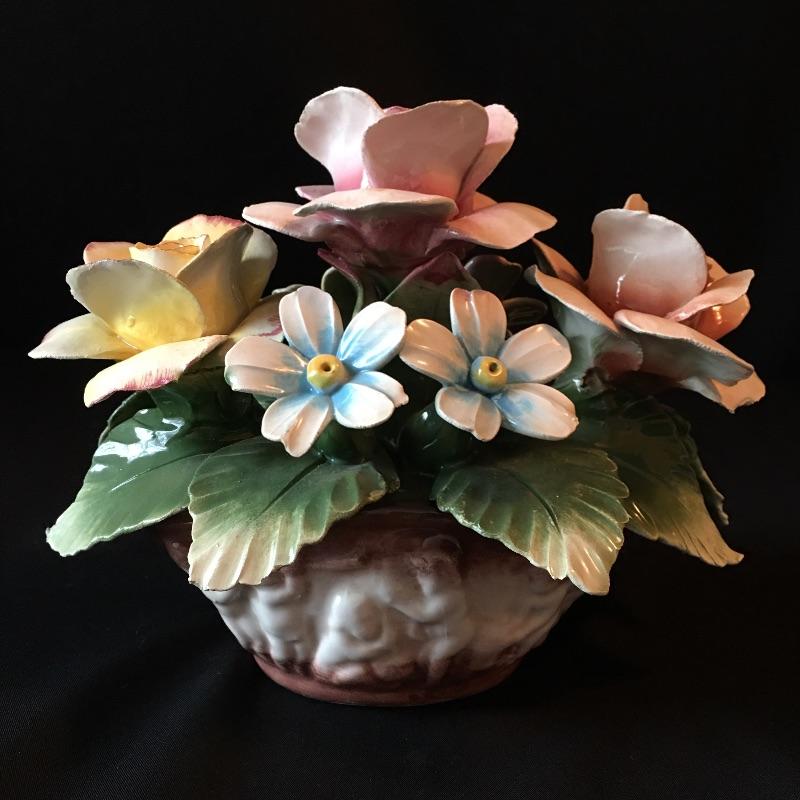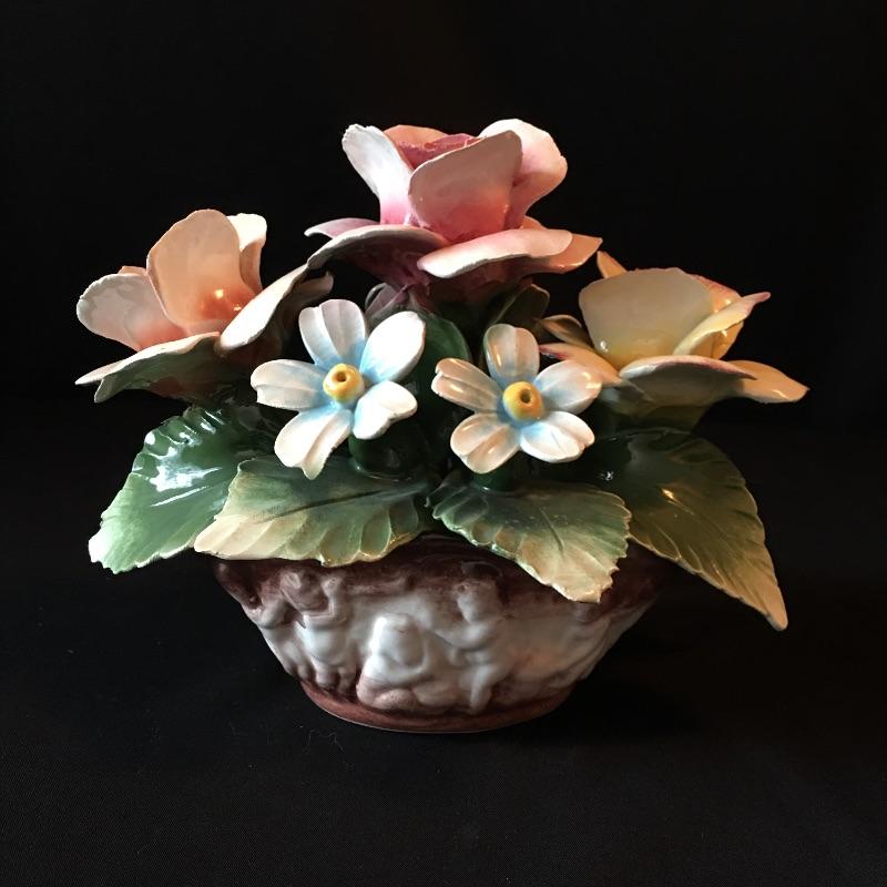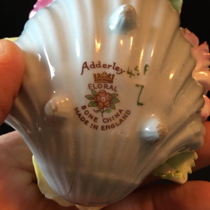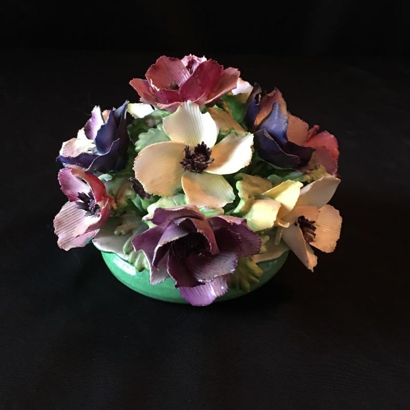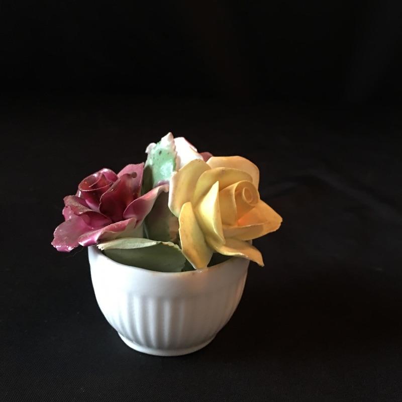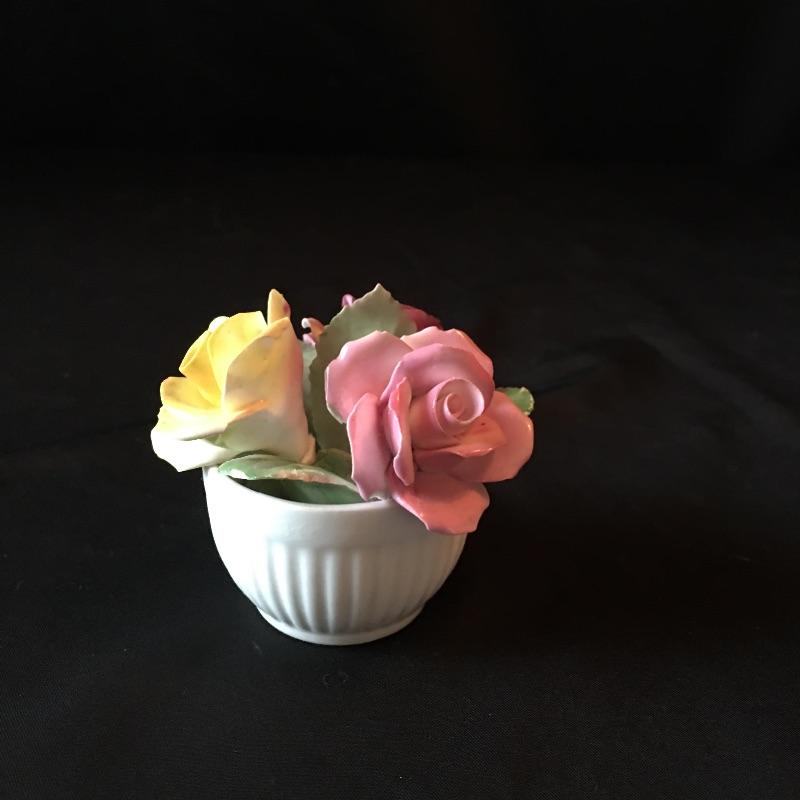 Porcelain flower array includes pieces by Radnor, Staffordshire, Royal Malvern, Adderly and Staffordshire that has a cracked pot, see pictures. A few of the pieces have chips and the one by Royal Malvern has two flowers broken off. Largest piece measures 6.5” x 8.5” x 6.5”.