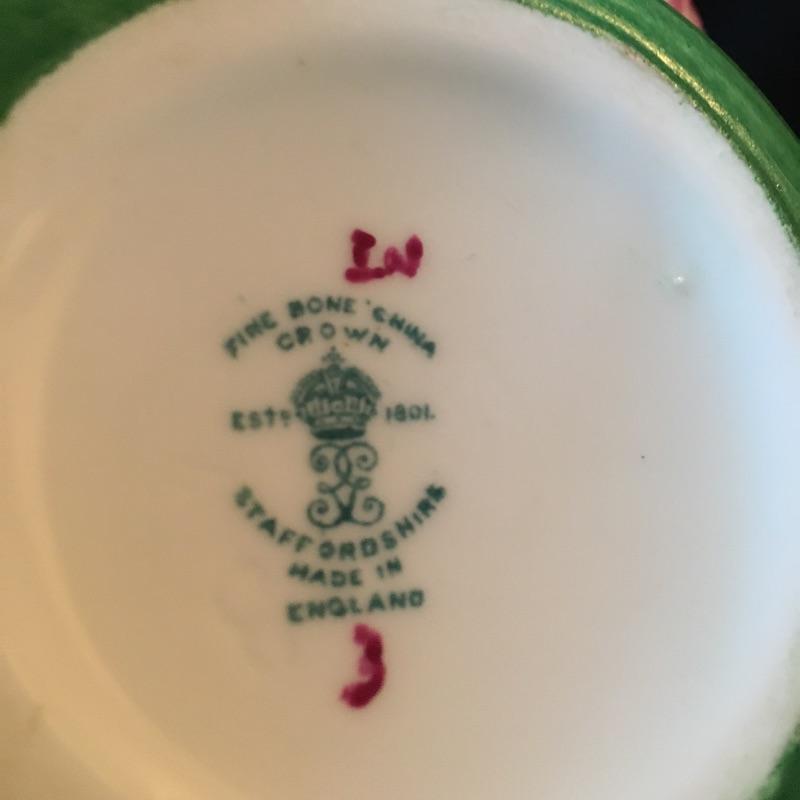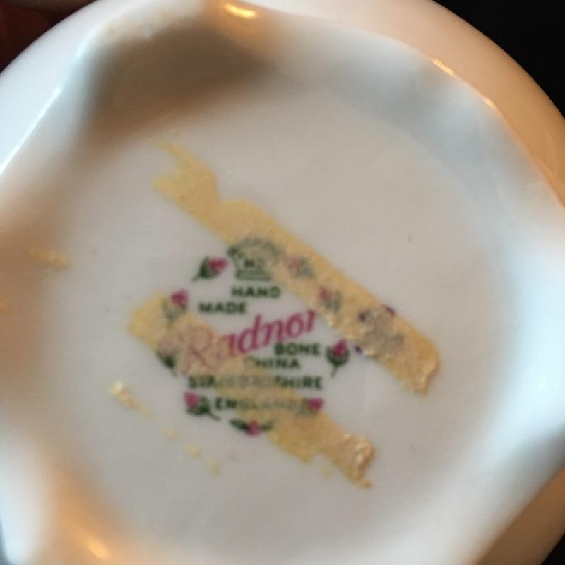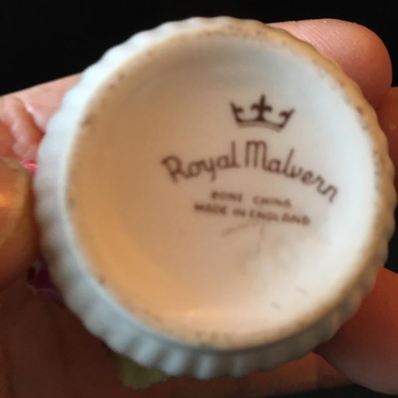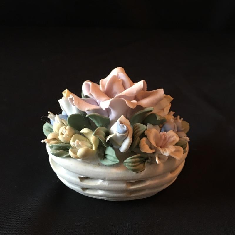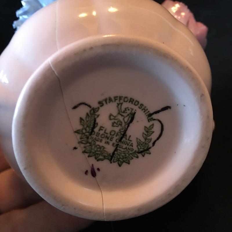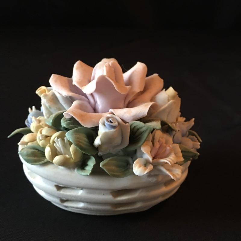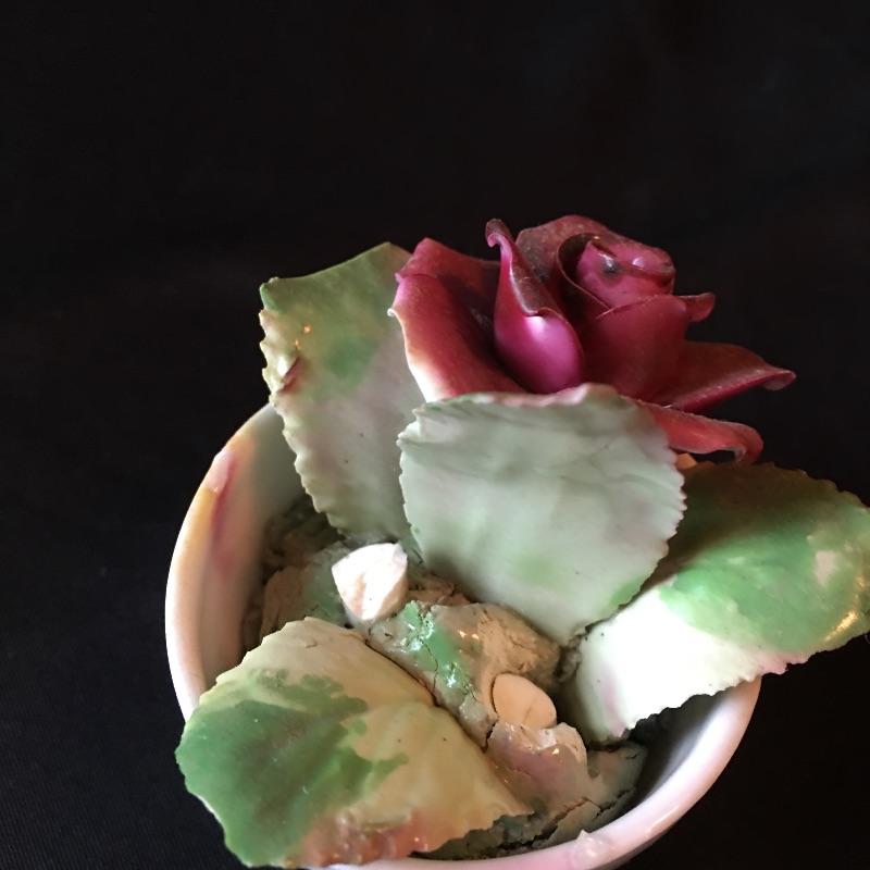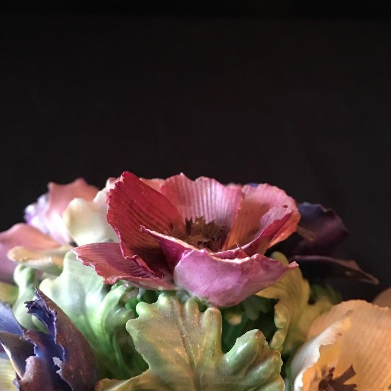 Porcelain flower array includes pieces by Radnor, Staffordshire, Royal Malvern, Adderly and Staffordshire that has a cracked pot, see pictures. A few of the pieces have chips and the one by Royal Malvern has two flowers broken off. Largest piece measures 6.5” x 8.5” x 6.5”.