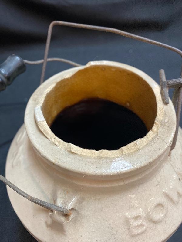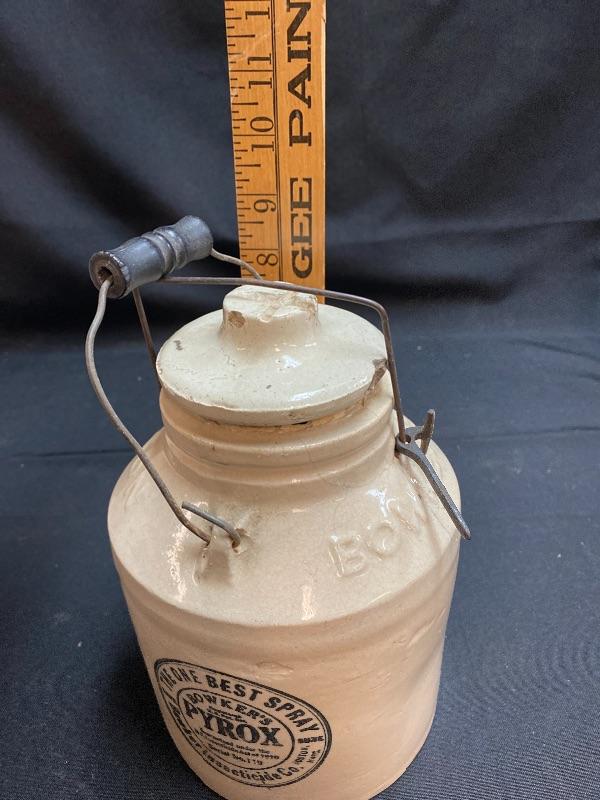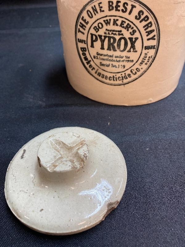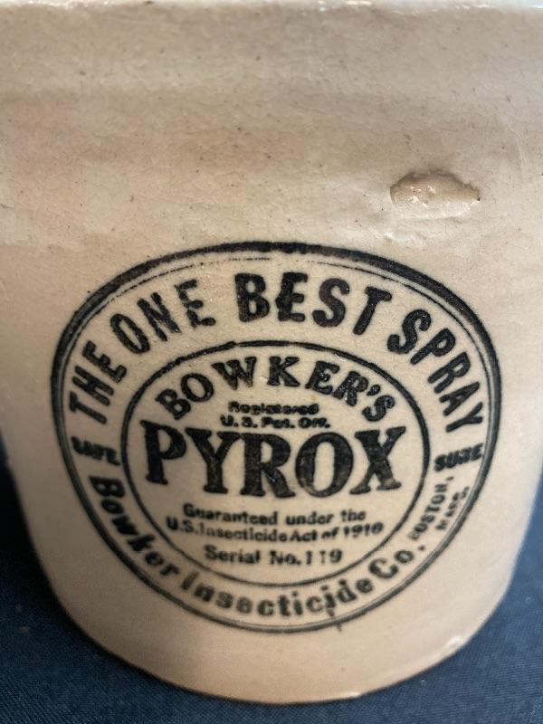 Bowkers Pyrox crock as-is. Please see all pictures for condition of the items listed and what is included in the lot. Pictures will also show any measurements if taken and is the best representation of the items. Thank you for looking and have fun bidding! We appreciate Treasure Hunters!