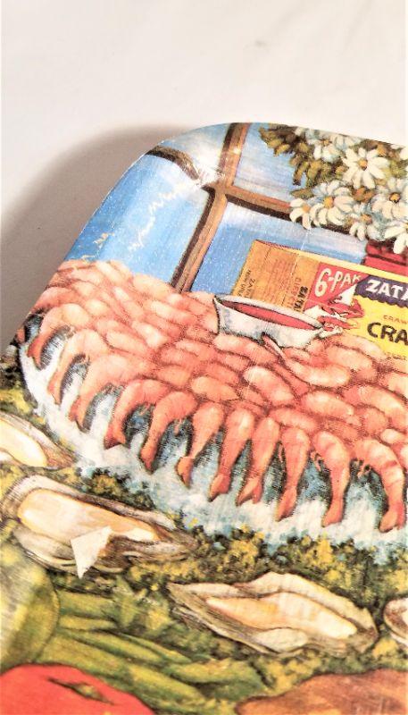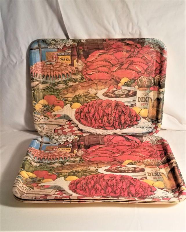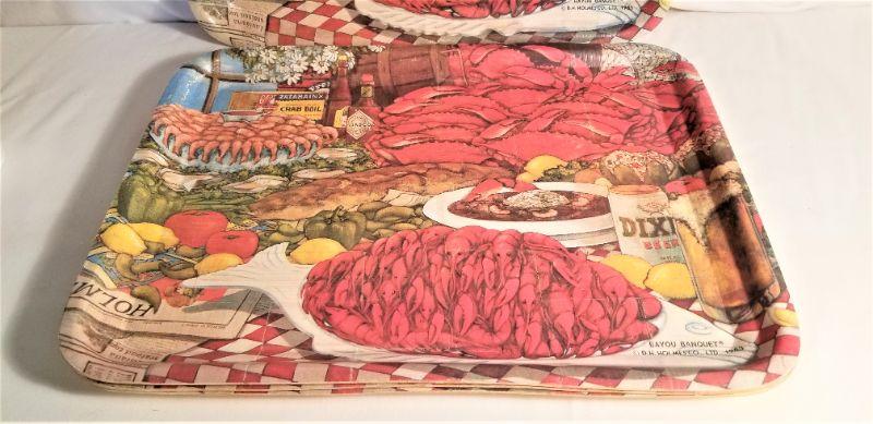 These trays have been retired for quite a while - dated 1983, and created for D.H. Holmes. Features a crawfish feast and Dixie Beer. Each tray measures 12" x 16". One has a small "hickey" - see photo.