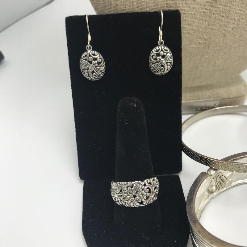 Silver will go with almost any outfit AND this lot is full of personality for any age! The silver spoon necklace, Firefly earrings, a flower ring size 10 are all marked 925. The other items have no known markings. The other bold silver colored ring is a size 7.5.