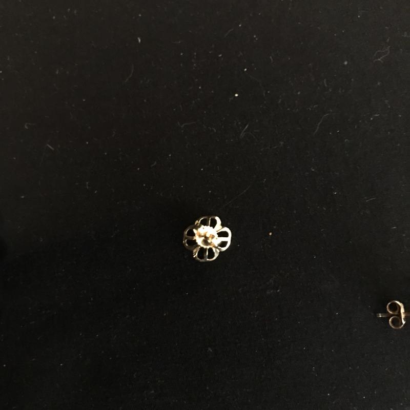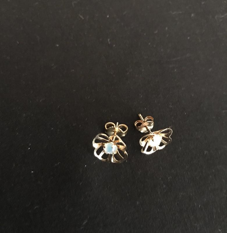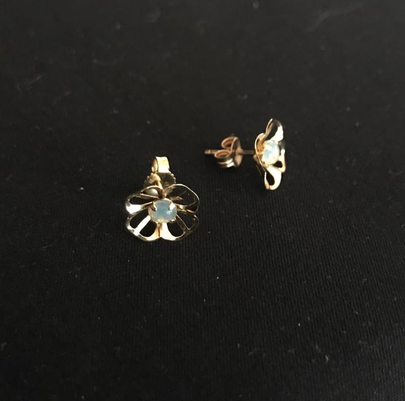 Small gold earrings in floral shape with stone in center. Marked 14k on backing. Flower is approx. 1/2” diameter. Shipping or local pick up in Flat Rock, NC.