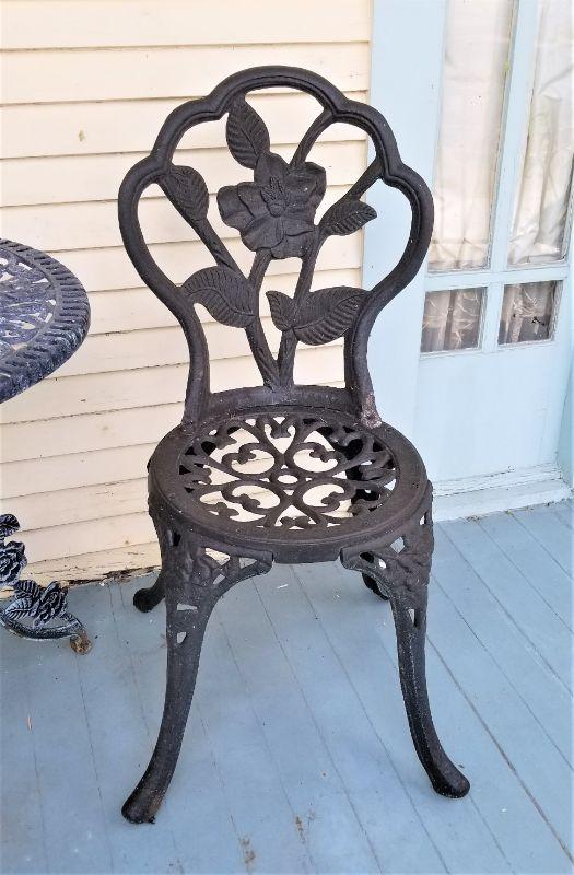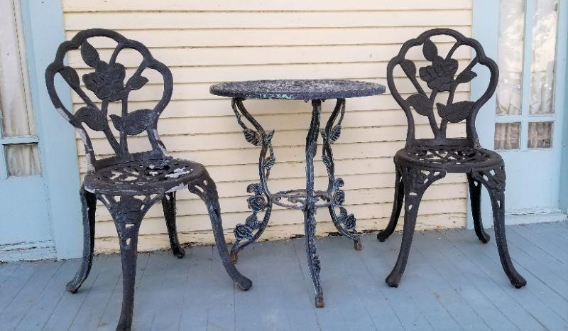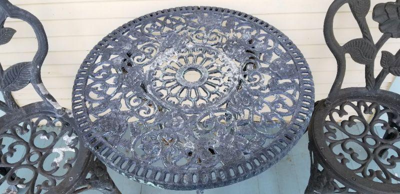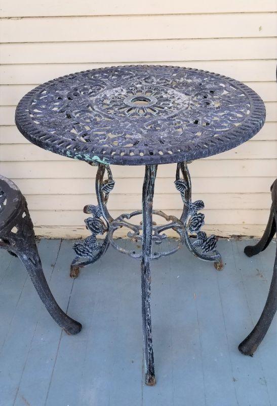 Three piece cast iron patio bistro set - table and 2 chairs. See photos - as found - sturdy, probably could use a paint job. Table is 24" across, 27" tall. Chairs are 15" across, 35" tall - floral motif.