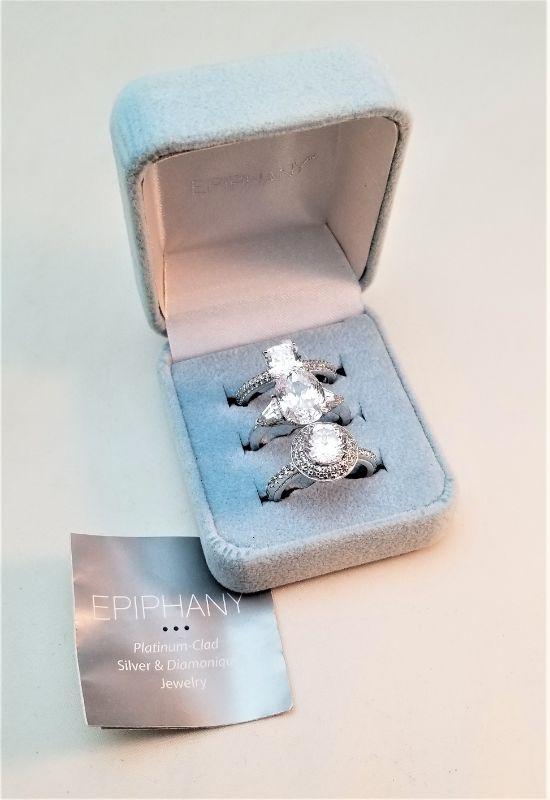 These sterling silver and Diamonique rings are really quite pretty, and just the thing when you are traveling, etc and don't want to bring your "real" engagement ring. The settings are quite lovely, and the stones have lots of bling. Many of the people seeing them will think that they are the real thing. Each is a size 7 and they are platinum clad. The one with the round stone in the front is marked "Tacori" . The others are by "Epiphany."