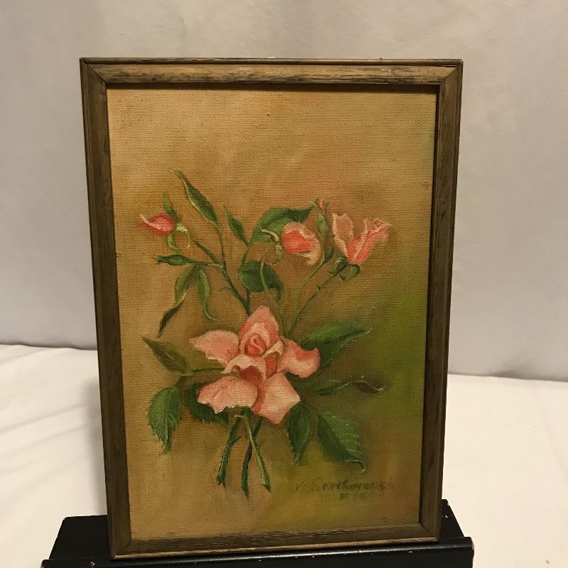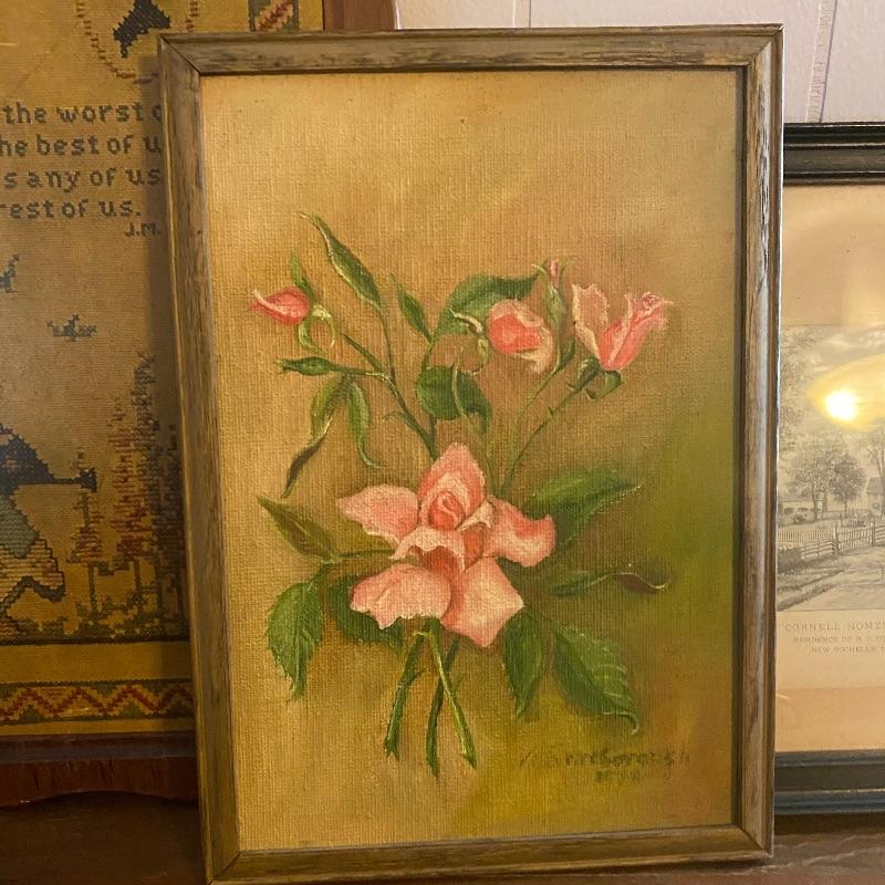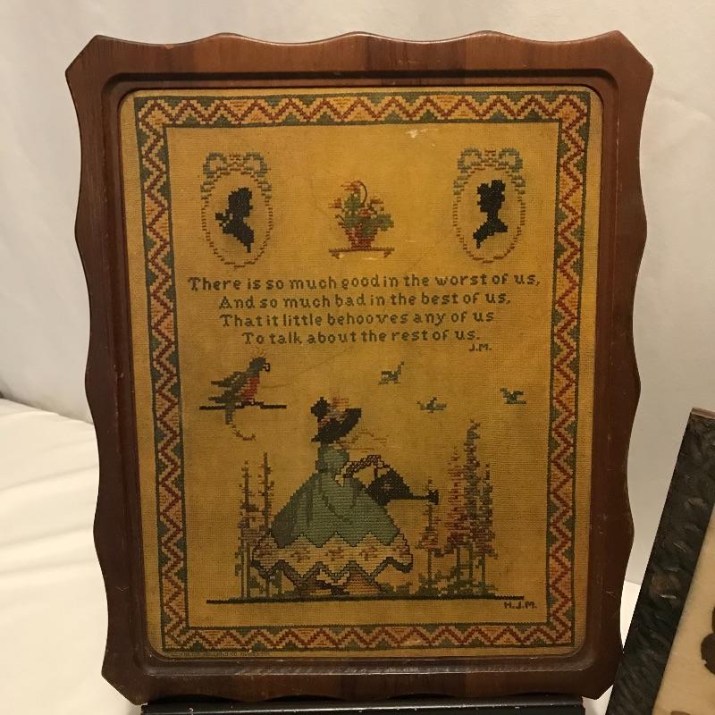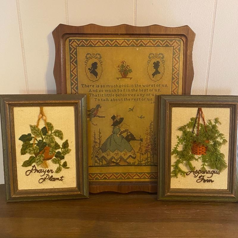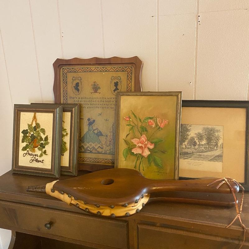 Five perfectly lovely vintage pieces of framed art including two yarn art, painted canvas and more! We’ve upped the ante on this vintage art lot with a fireplace blower. The leather string to hang it needs to be replaced, but other than that it seems to be not only beautiful, but also functional. See photos. Pieces have been consigned from a house with a smoker, items may need cleaned. Local pick up only.