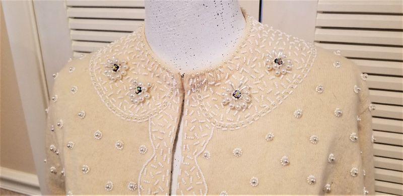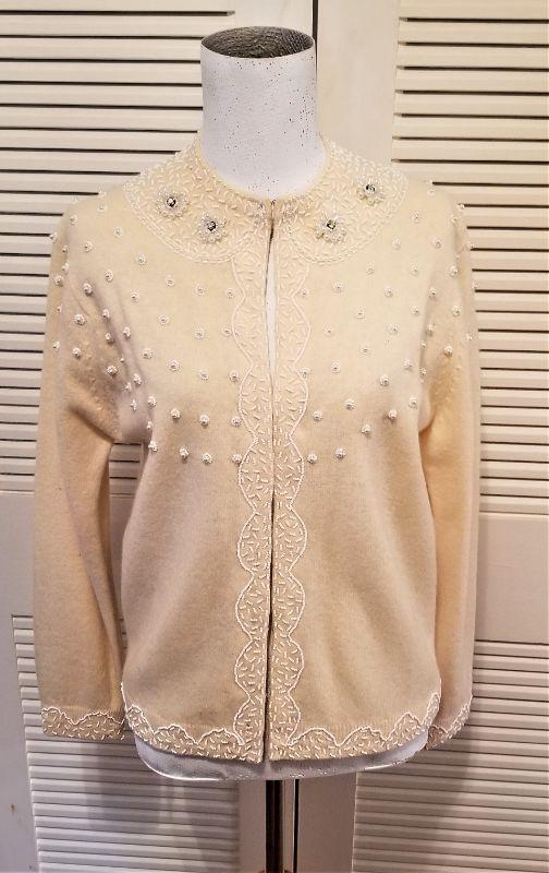 One of the nicest beaded sweaters I've ever had - excellent condition, ca. 1950's. Off white in color - Delicate beads and rhinestones make this one a real beauty. 14" across at the shoulders. Lining is good. I would say this would best fit a women size 4-6.