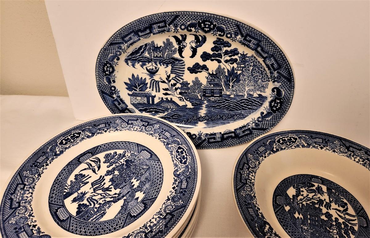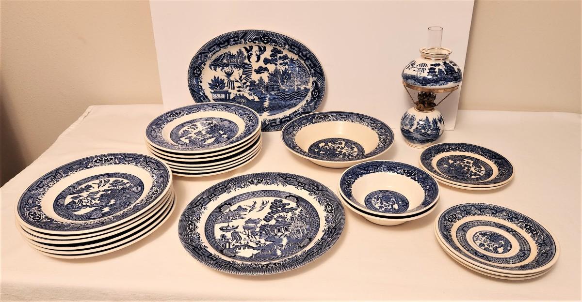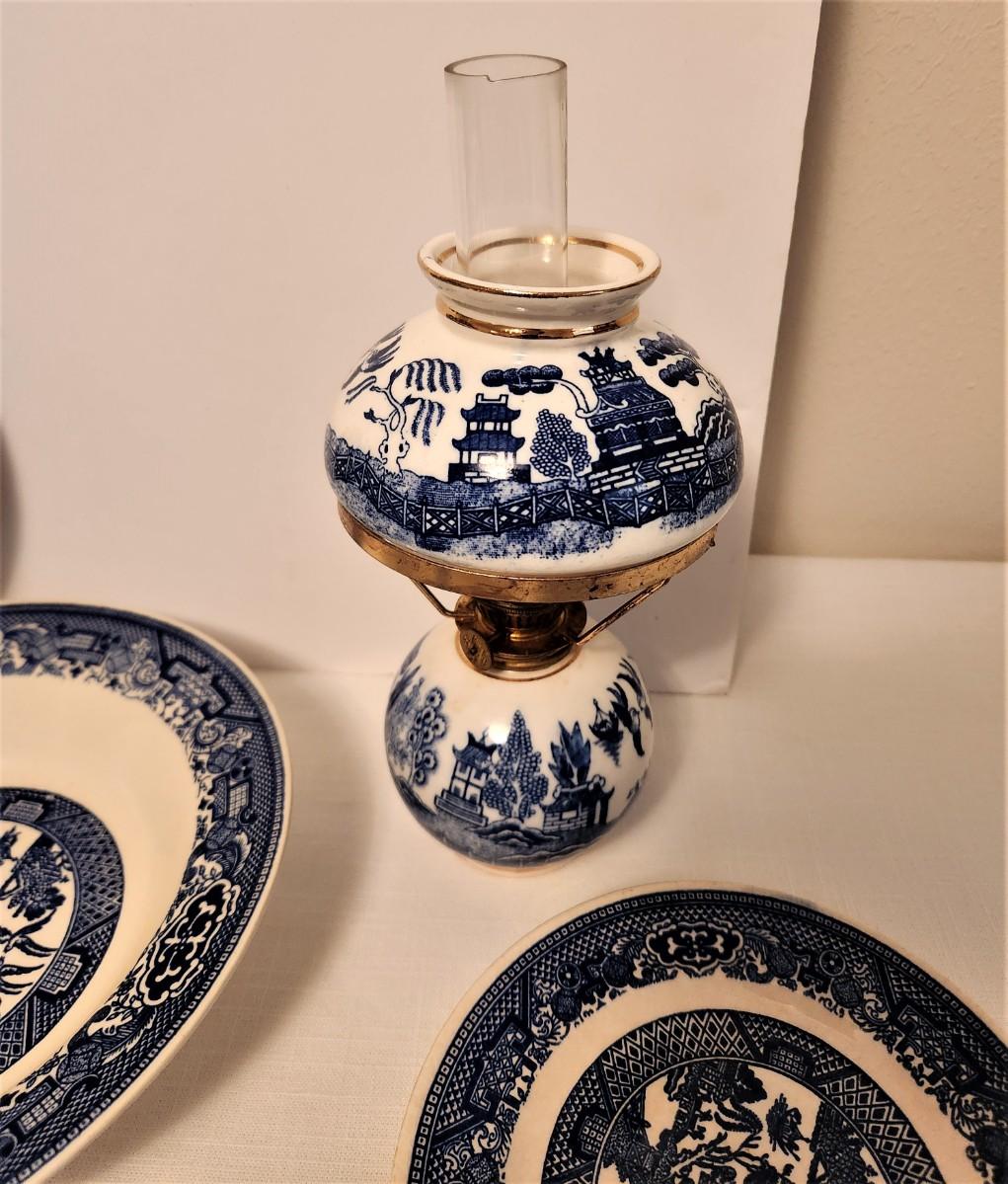 You get all you see here: 1 dinner plate (10" across), serving bowl, 2 bread/butter plates, 3 saucers for cups, 1 platter (12.5"), 11 Luncheon plates (9" across), 2 small bowls, decorative oil lamp (9.5" tall). All in vintage condition, unmarked. Except for the oil lamp, these are older dishes.