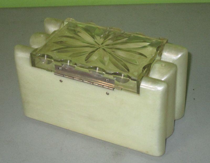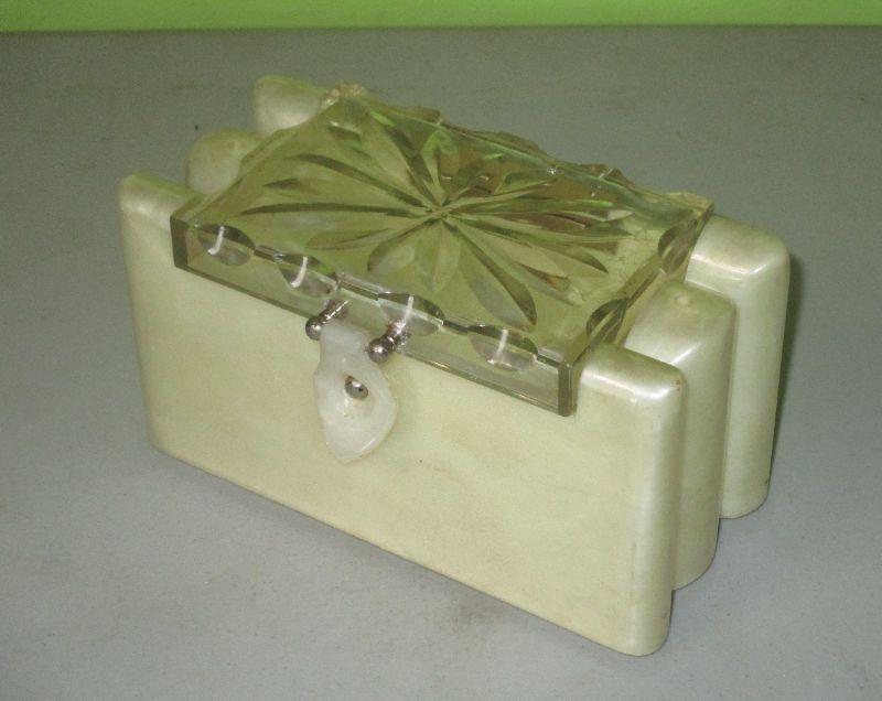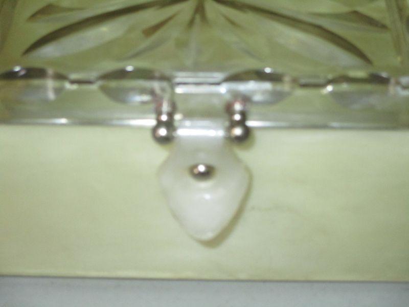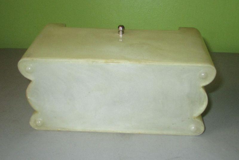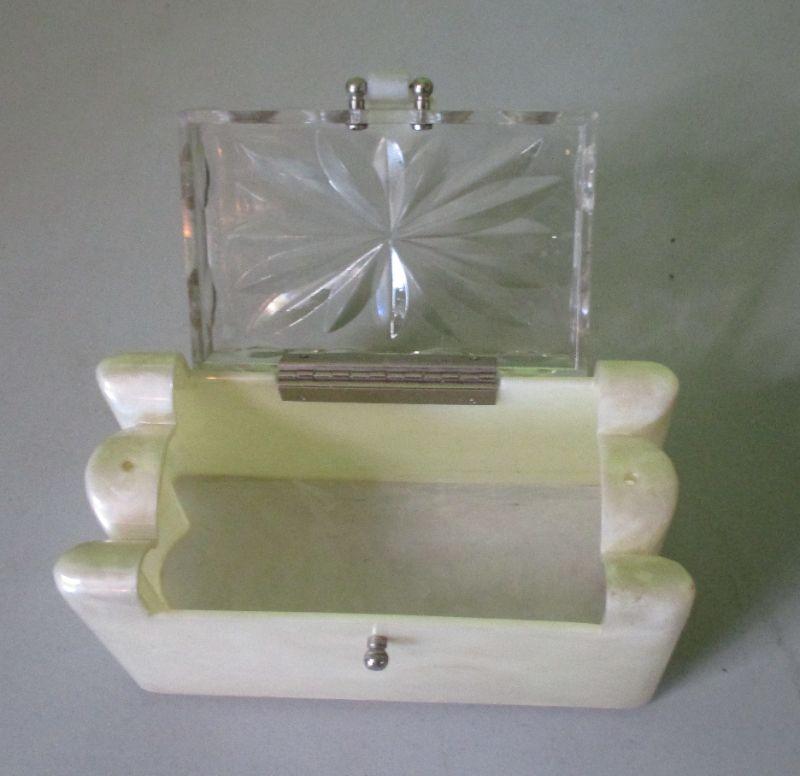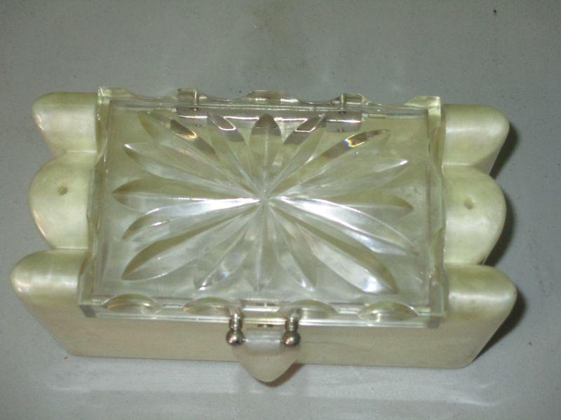 This purse is gorgeous, but it has lost it's handle. That is something that could easily be replaced with a pretty chain or other type of handle. If you didn't want to try that, you could use it on your vanity as a pretty keepsake box. It is about 7.75" x 4" x 3.75"