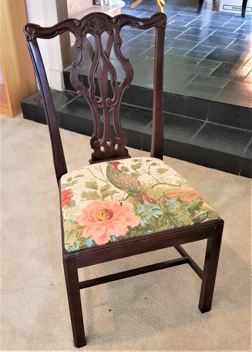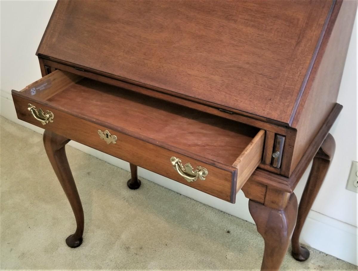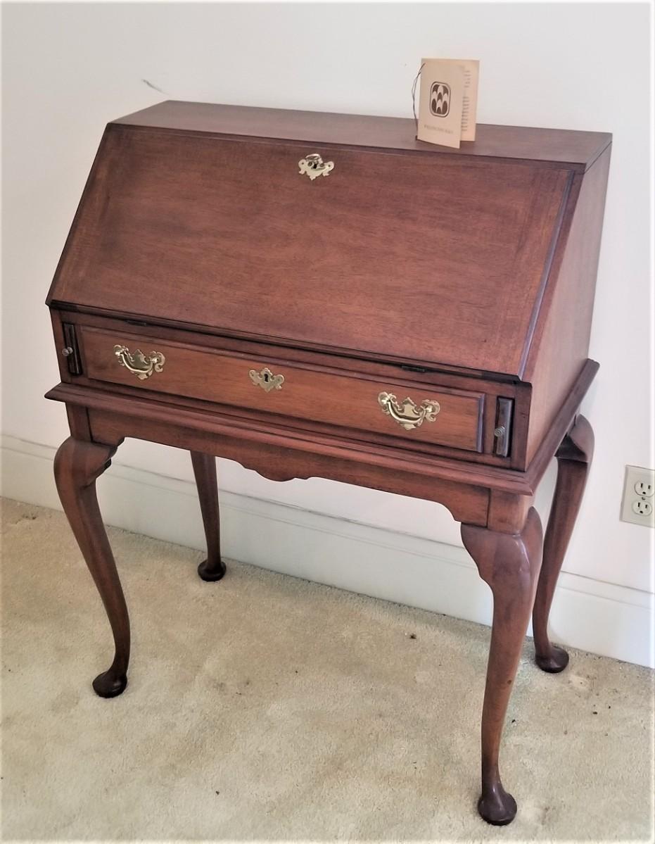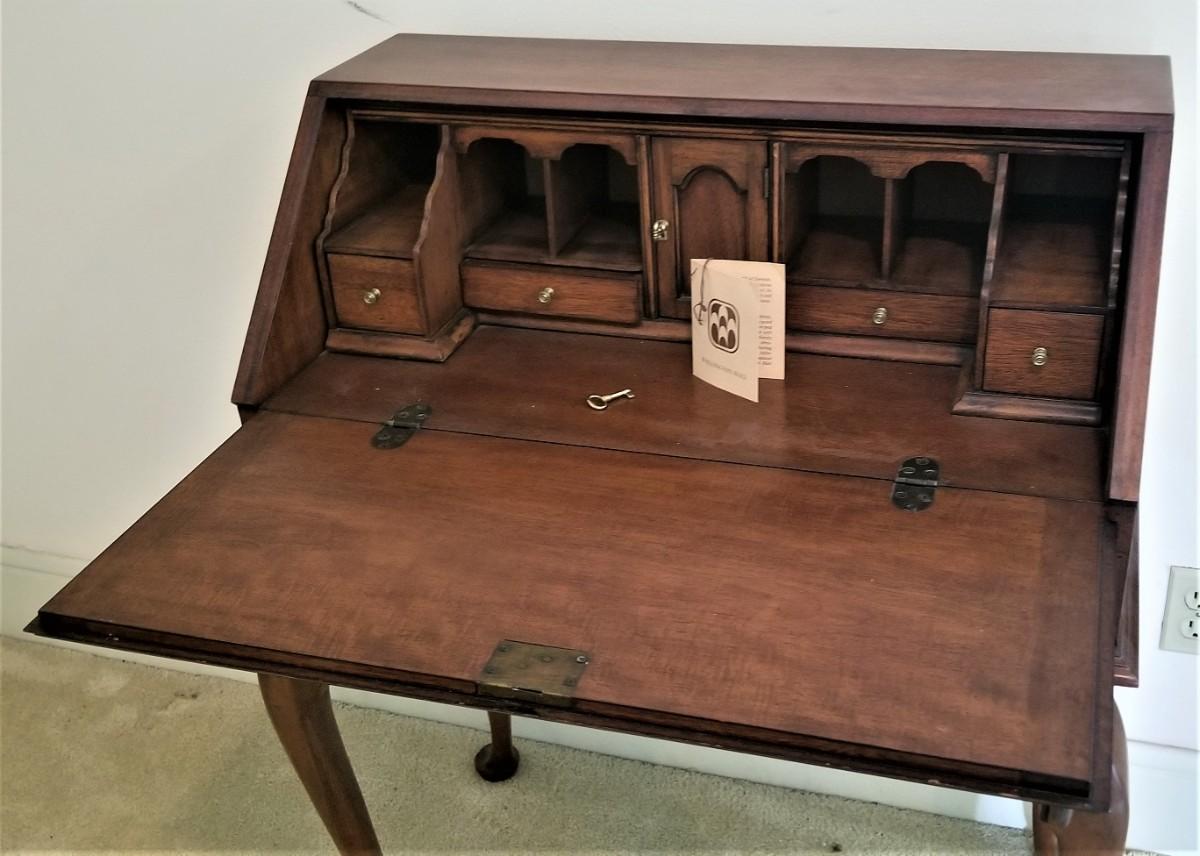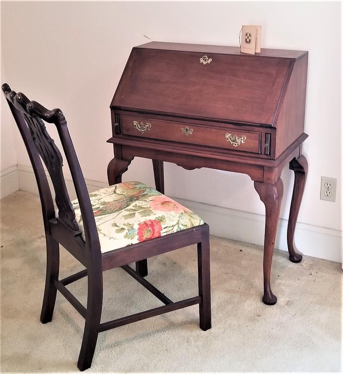 Wellington Hall drop leaf desk - Queen Anne legs - lots of cubbyholes - WORKING KEY - drawer - great condition. You also get the chair - upholstery matches the sofa and chairs offered in an earlier lot. Chair is 21.5" across, 22" deep, and 38" tall. Desk is 17" deep, 30.75" tall, and 39" across. Both in Excellent condition. NOTE: Legs on the desk do not come off.