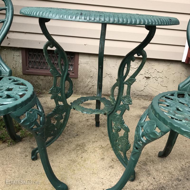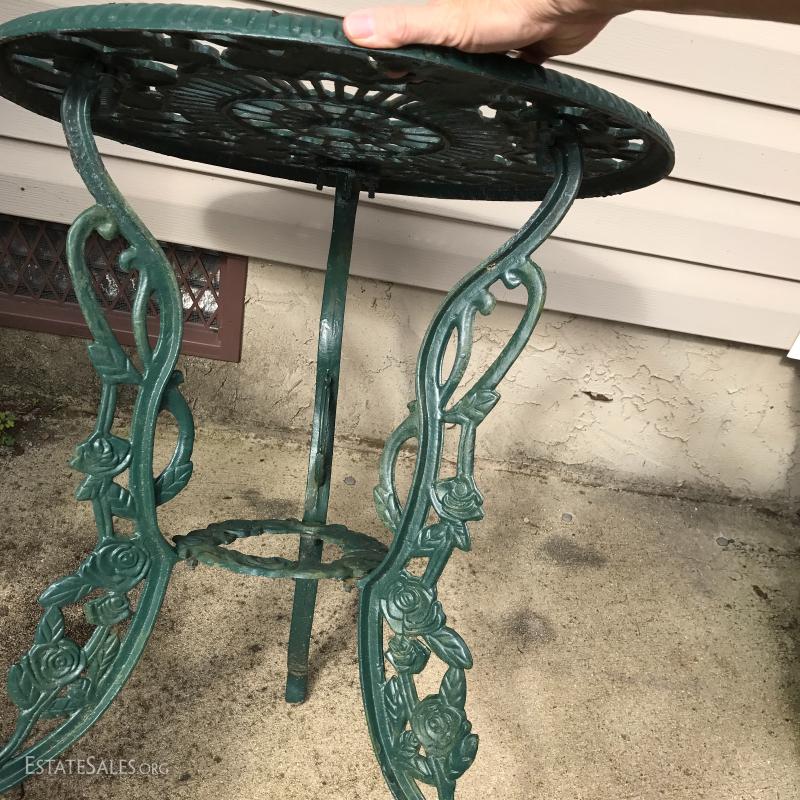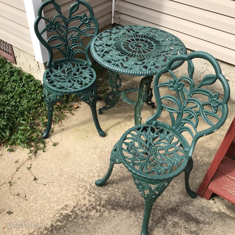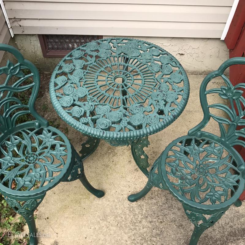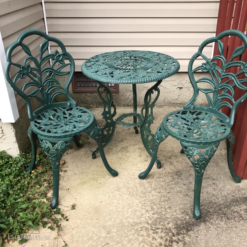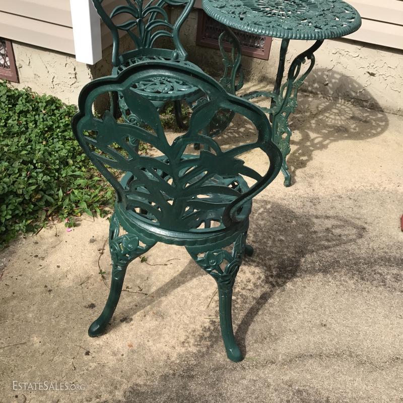 Small cafe-style table and chairs, in good condition. Table measures 24" diameter and 27" tall. Chairs are 18" x 18" x 35". This lot is available for local pick up in Mills River, NC only.