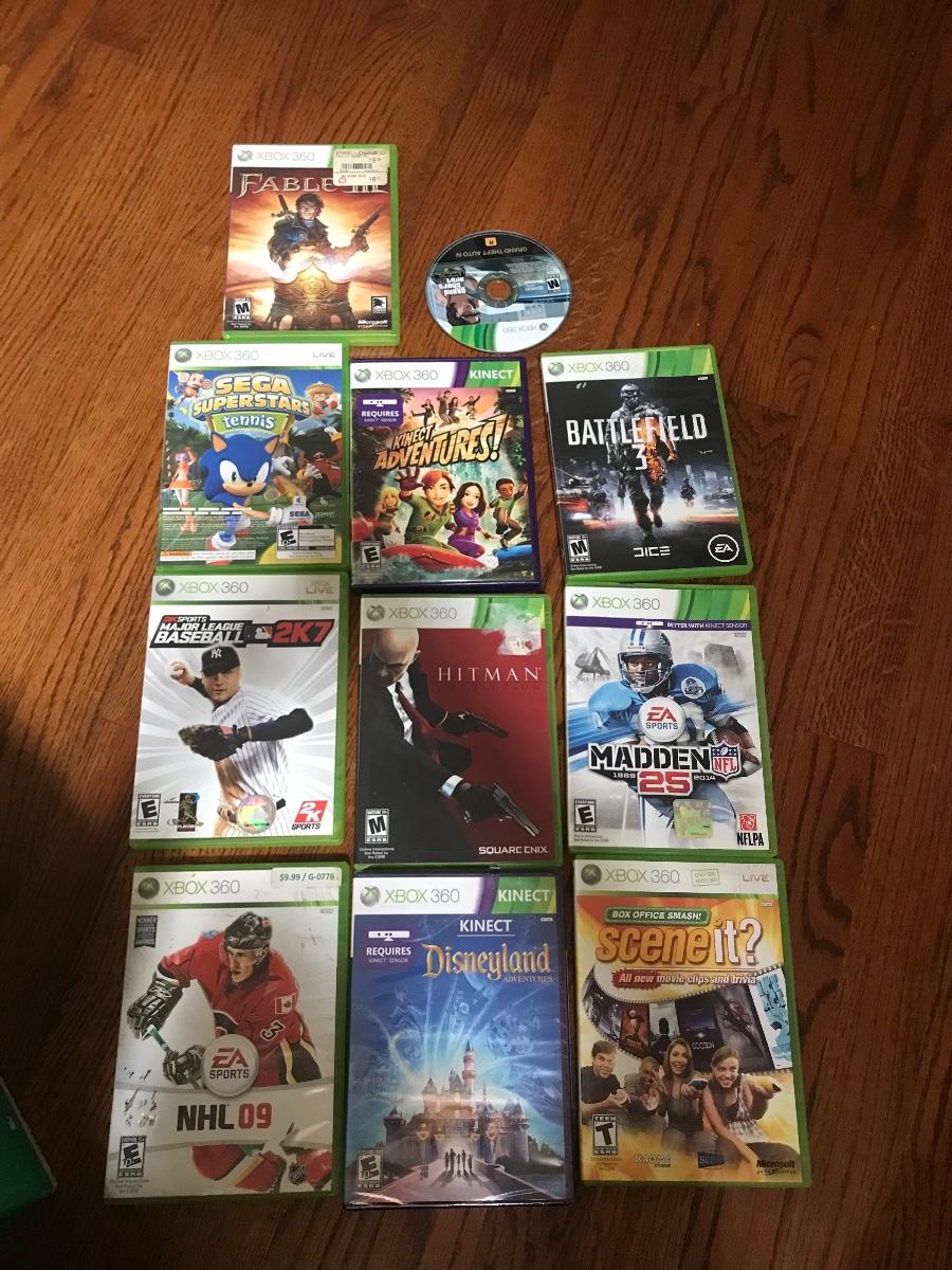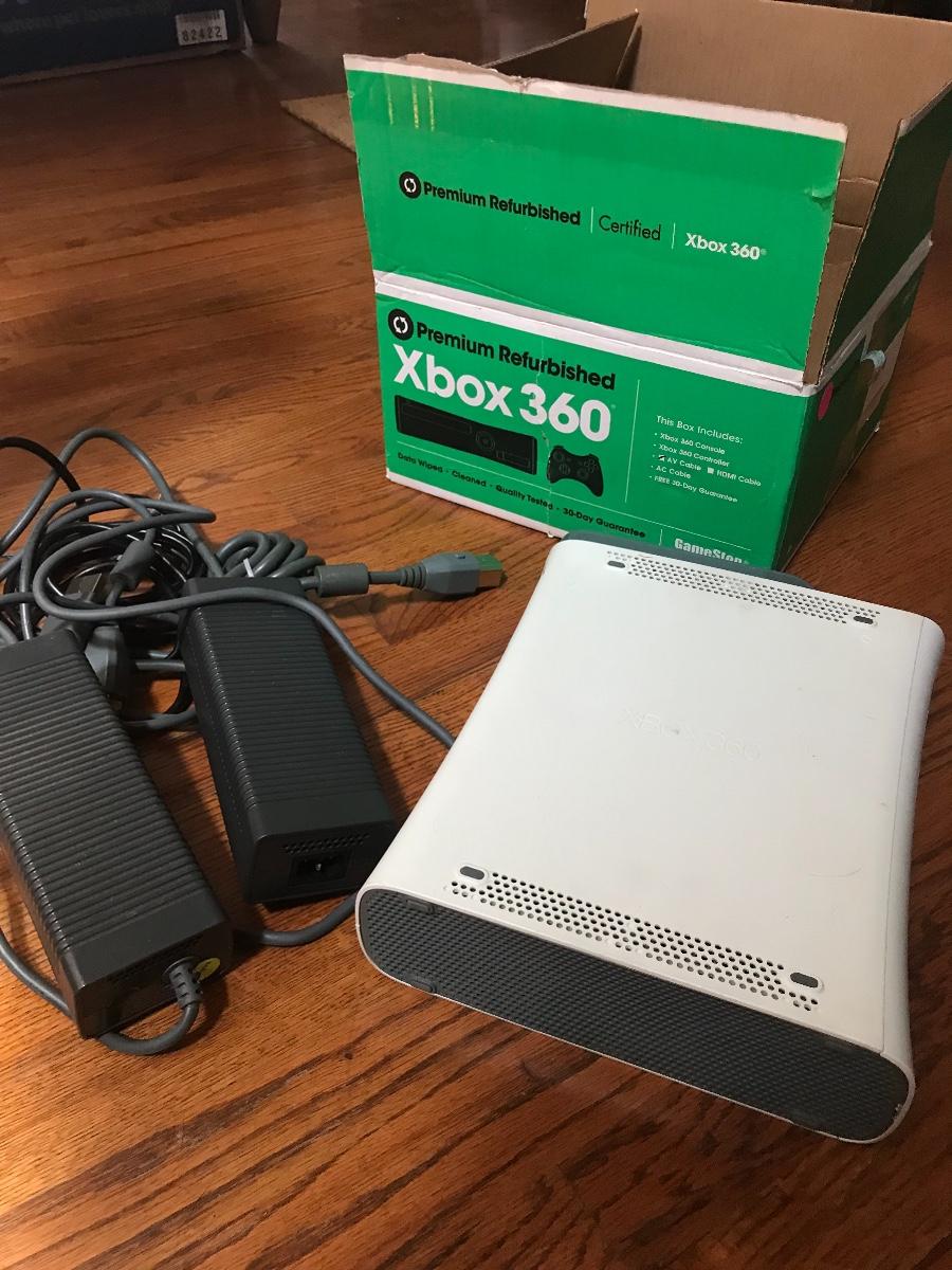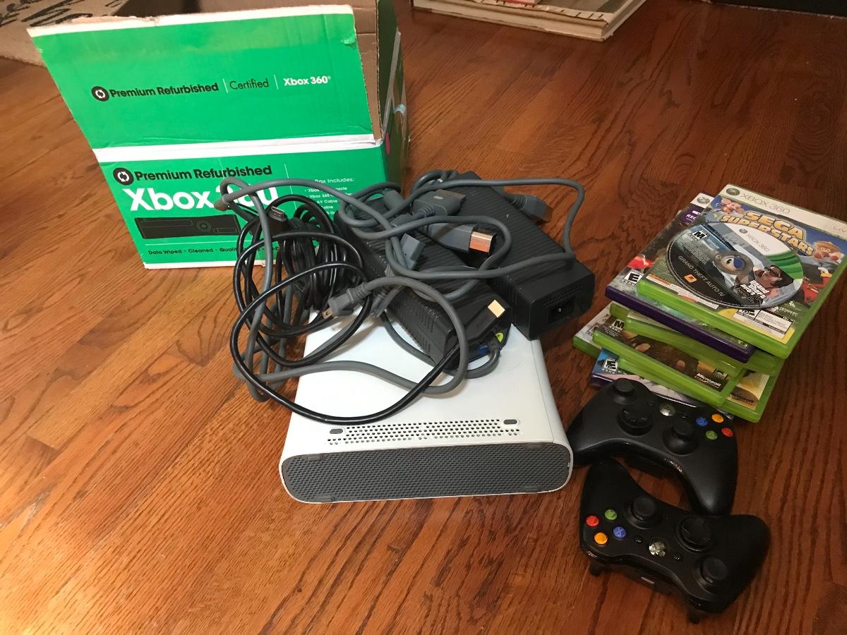 Refurbished Xbox 360 with eleven games and two controllers. Please see all pictures for content of the lot, condition of the lot, and measurements if taken. Pictures are the best representation of the items listed and items are untested unless indicated in description. Thank you for looking and have fun bidding!