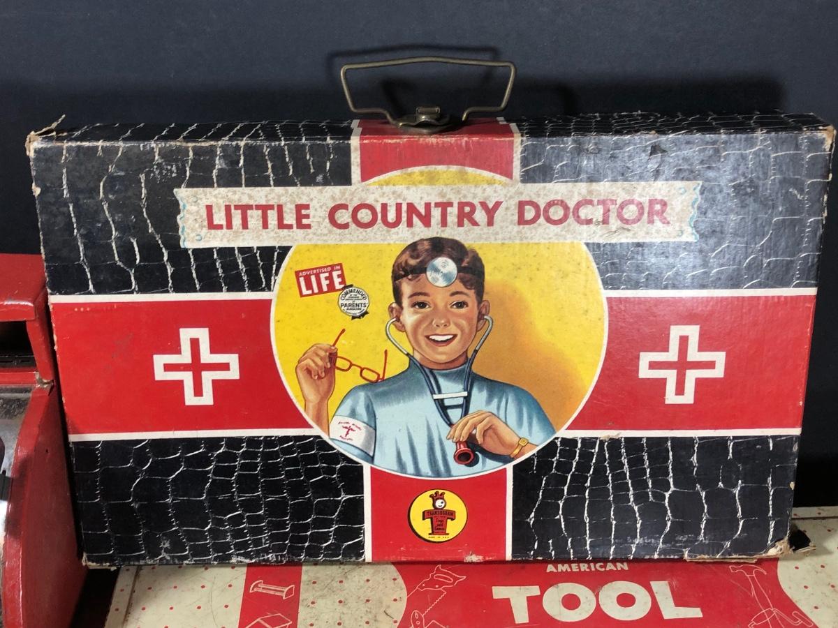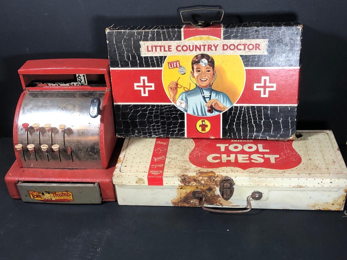 LOT 20D: Vintage Toys - Life Little Country Doctor, Tom Thumb Cash Register & American Toy & Furniture Company Tool Chest