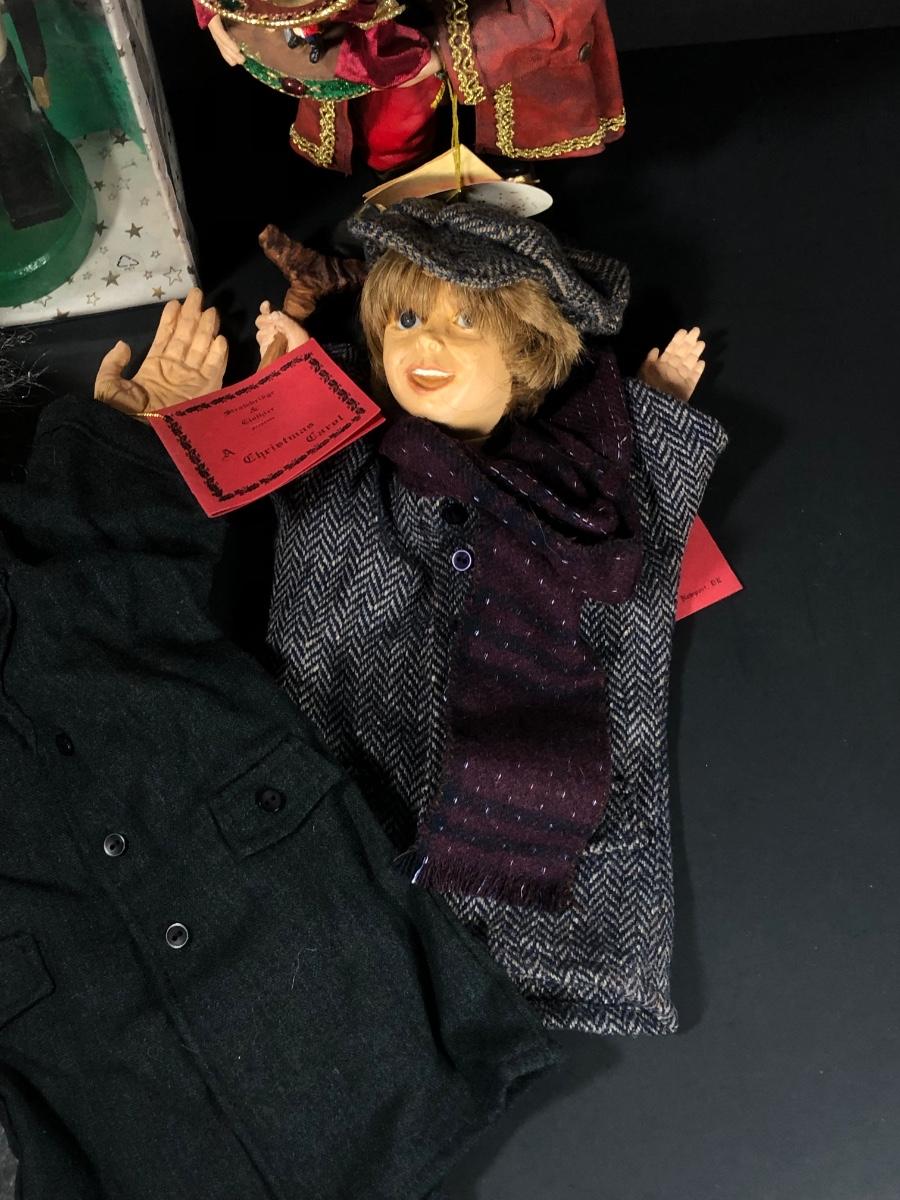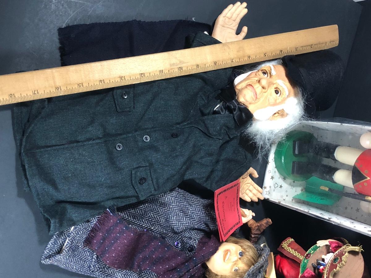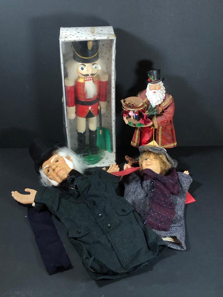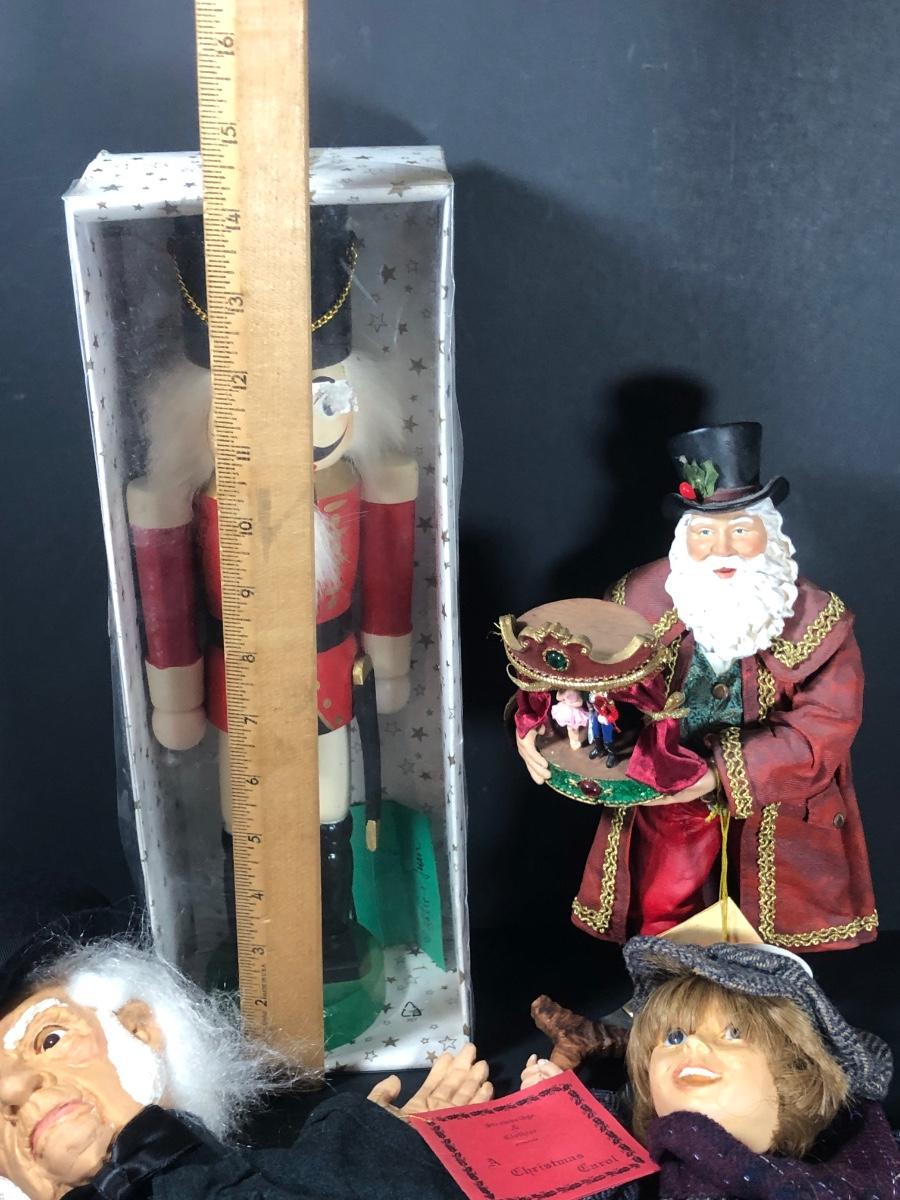 LOT 22D: Vintage Strawbridge & Clothier A Christmas Carol Scrooge & Tiny Tim Puppets, Kurt S Adler Santa Figure & Nutcracker in Box