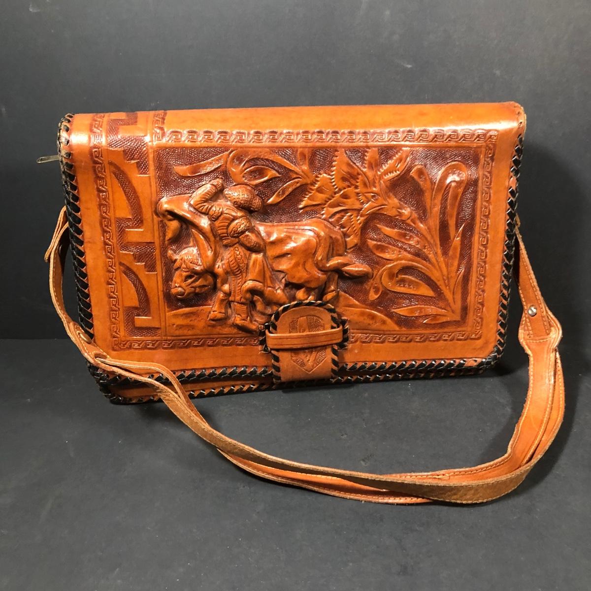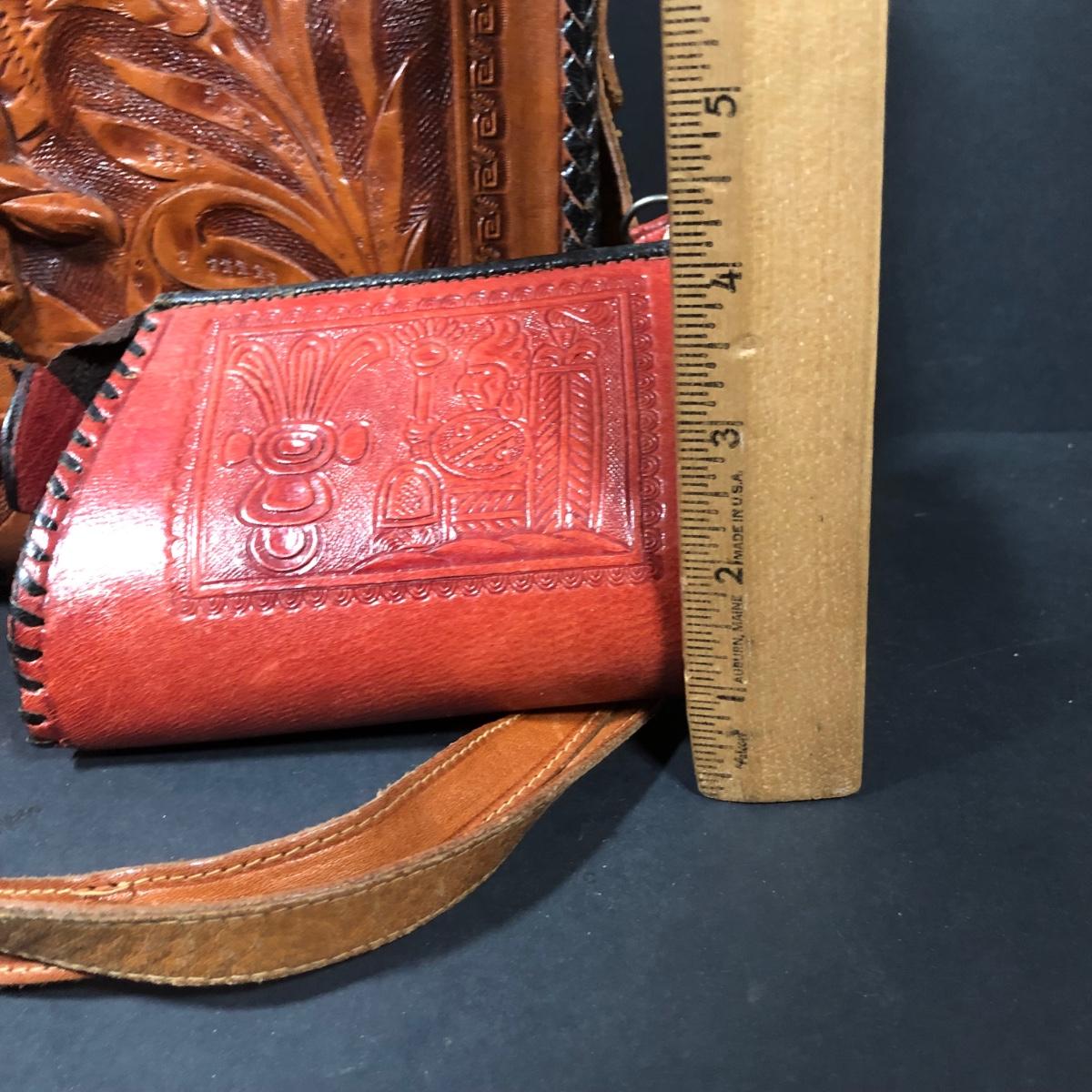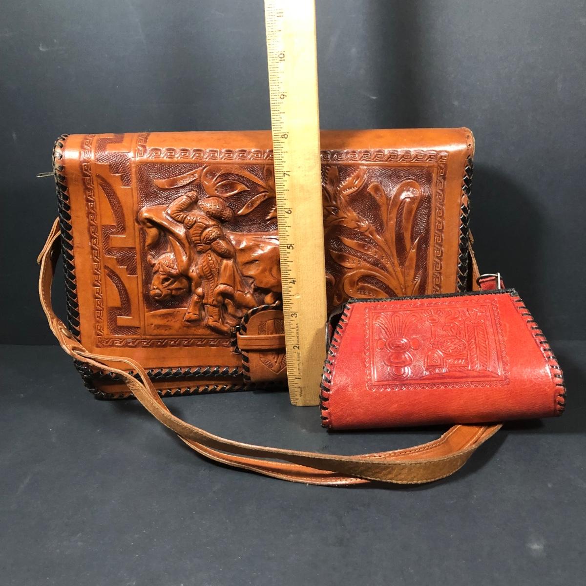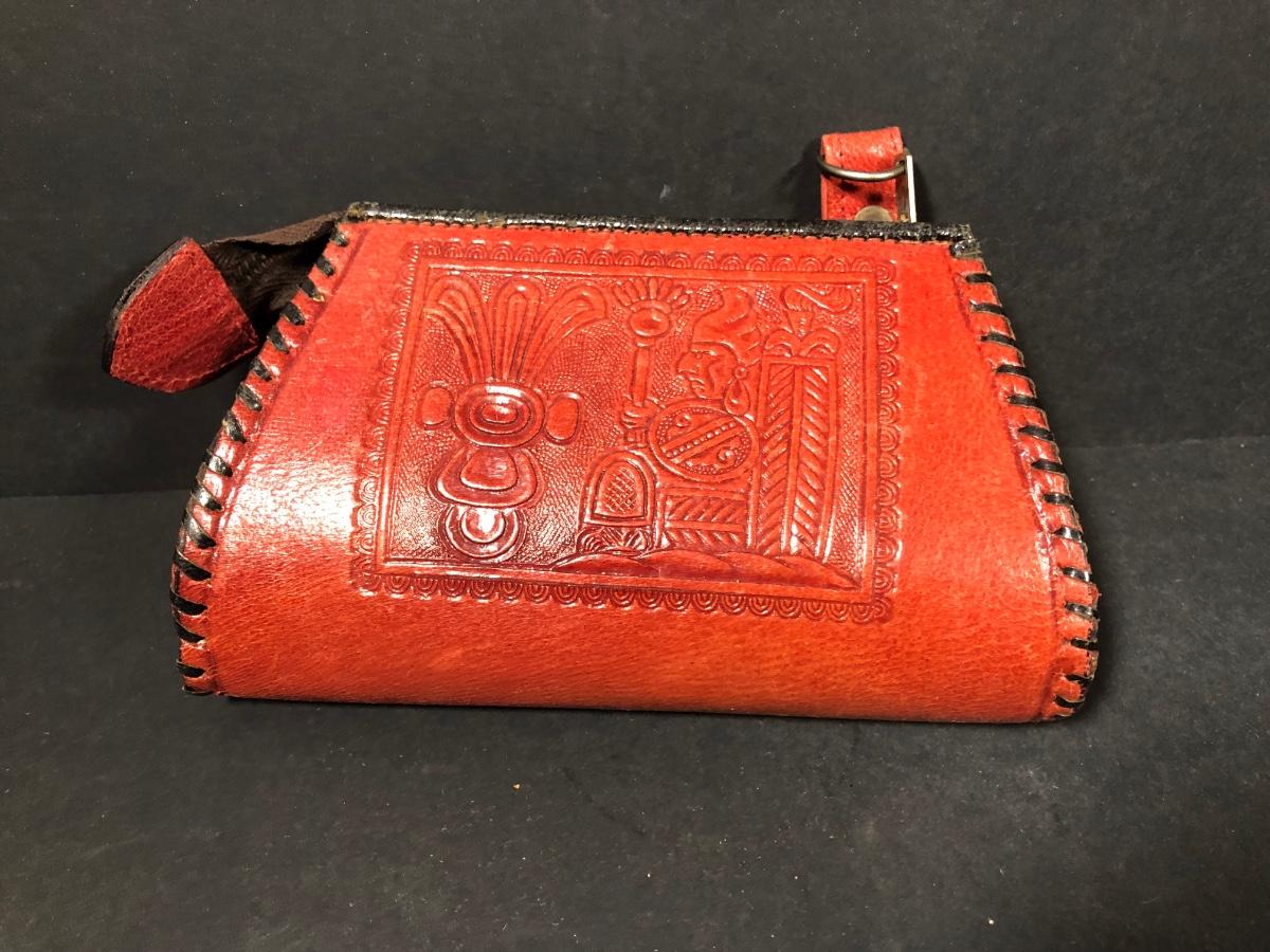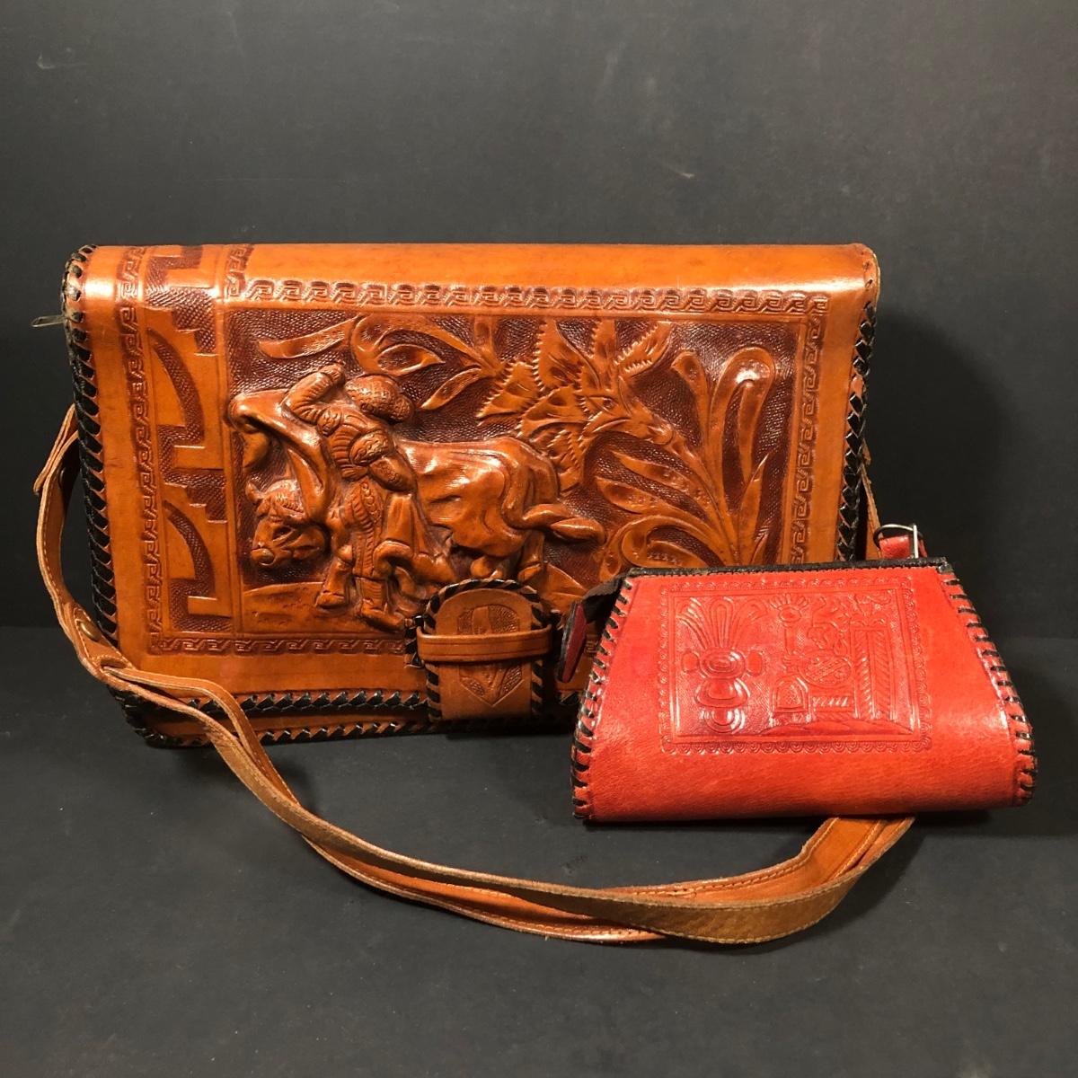 LOT 103D: Vintage Sculpted Leather Hand Bag w/ Aztec Coin Purse