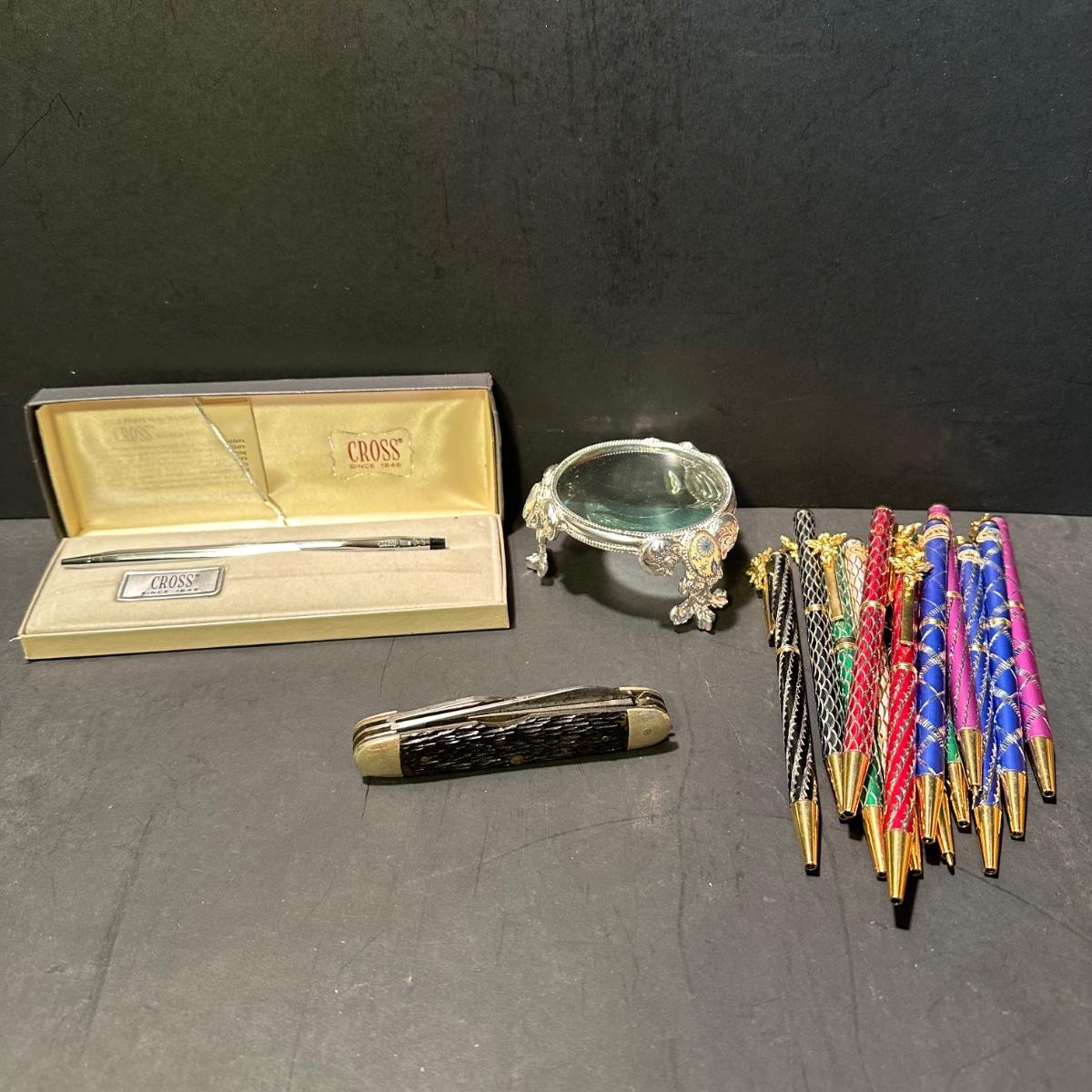 LOT 136L: Vintage Cross Penn, Angel Pens, Pocket Knife & Desktop Magnifying Glass