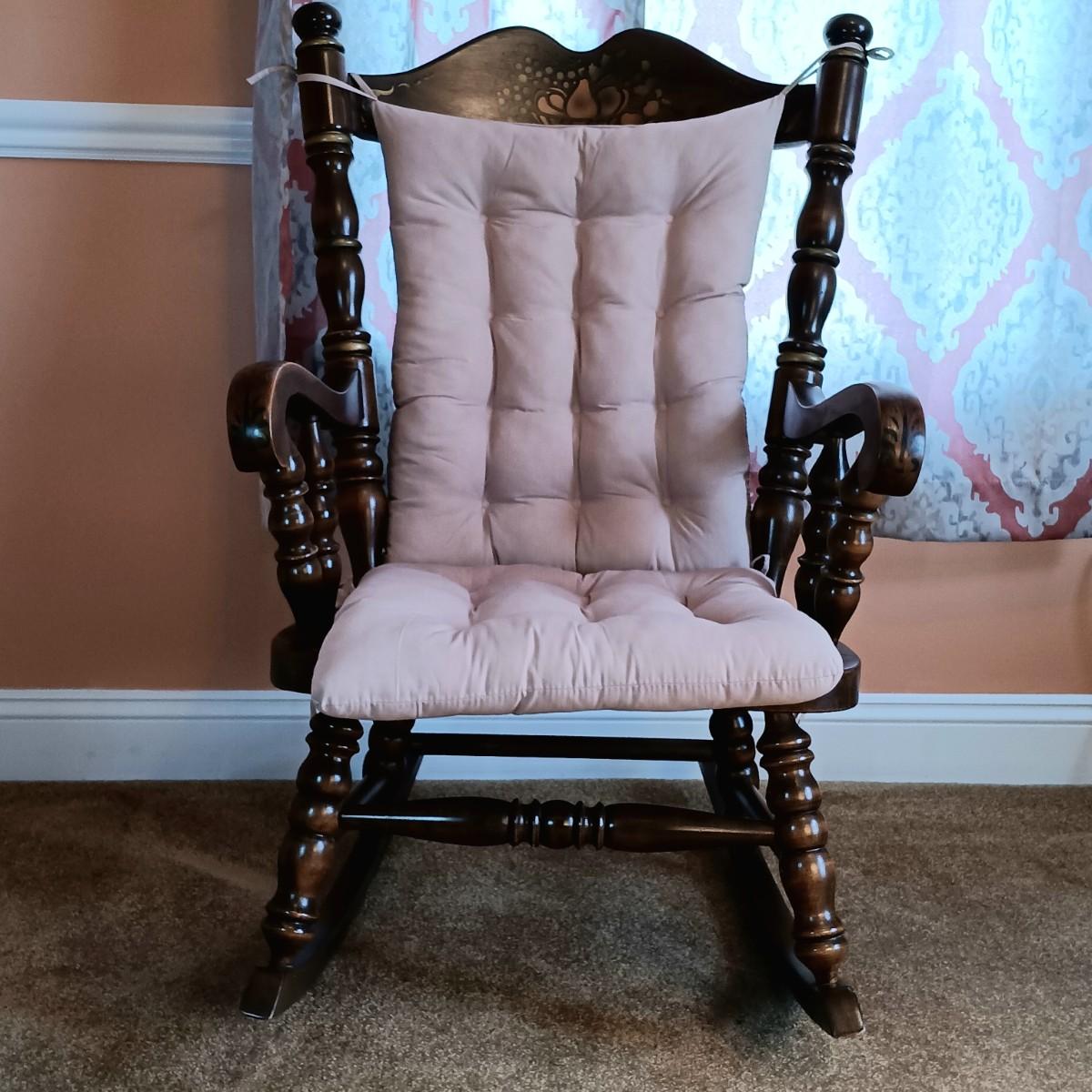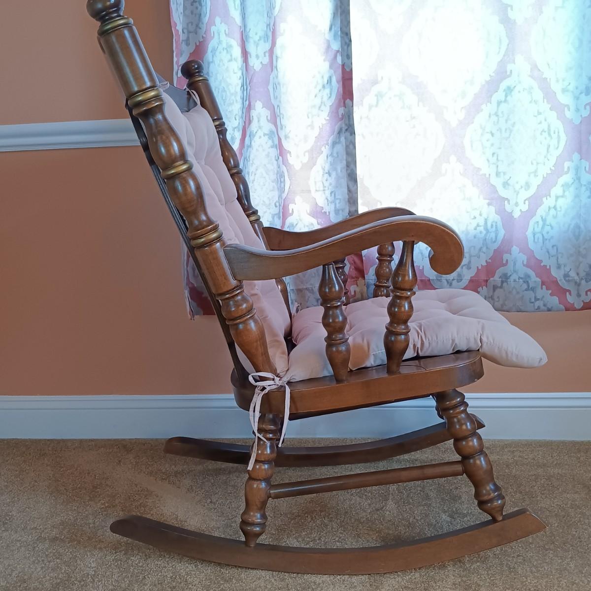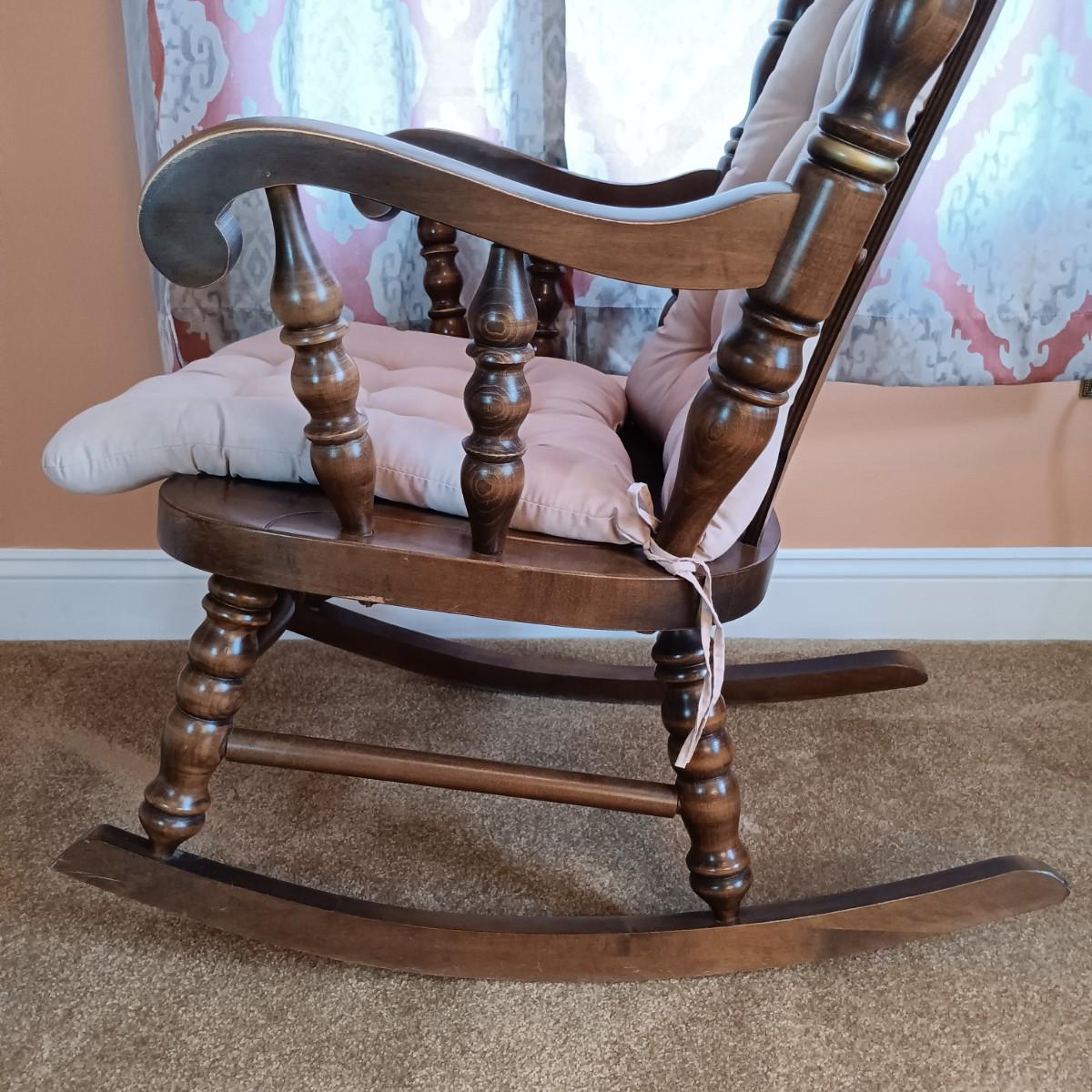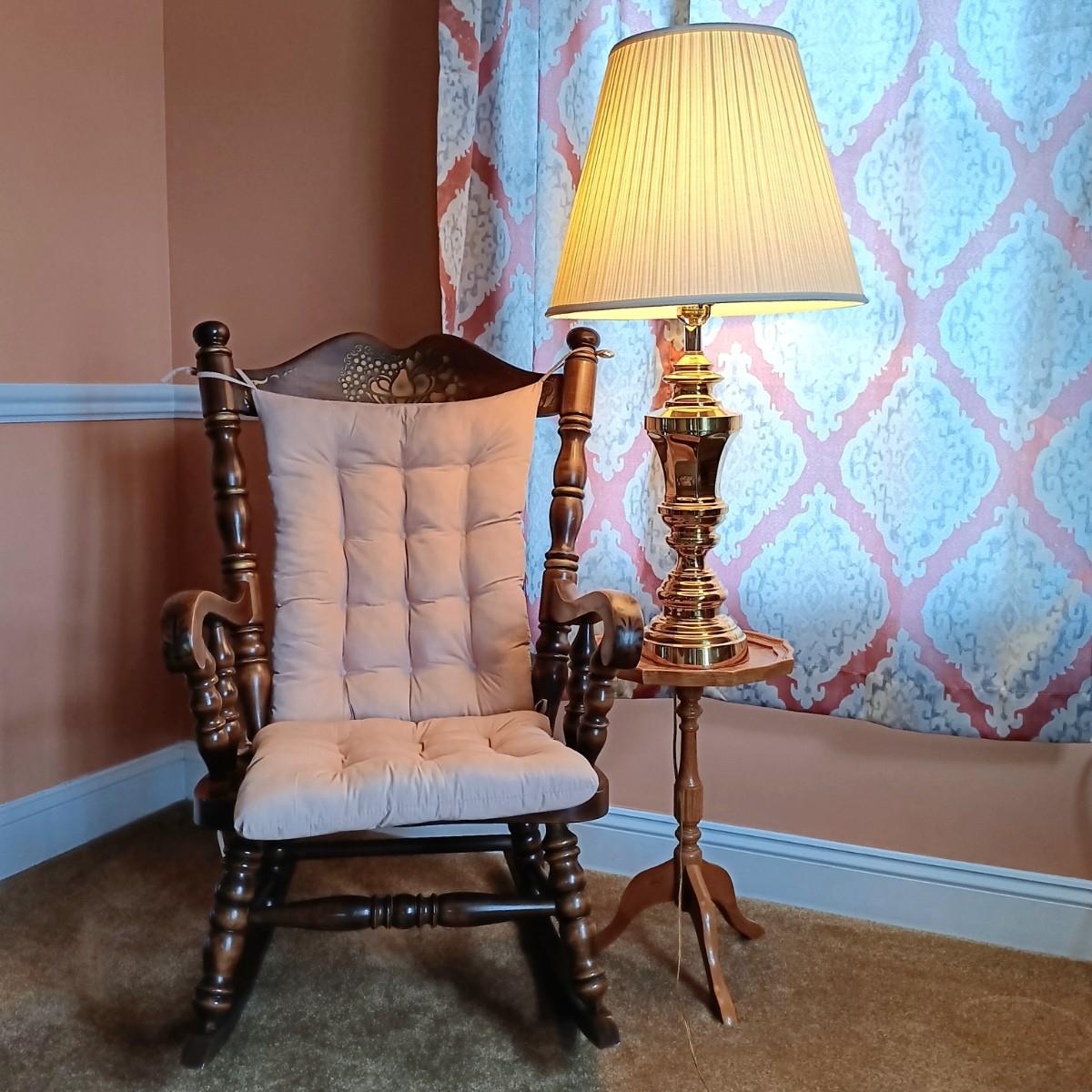 LOT5-O: Sturdy Wood Rocking Chair with Cushion; Pie Crust Table with Brass Style Lamp